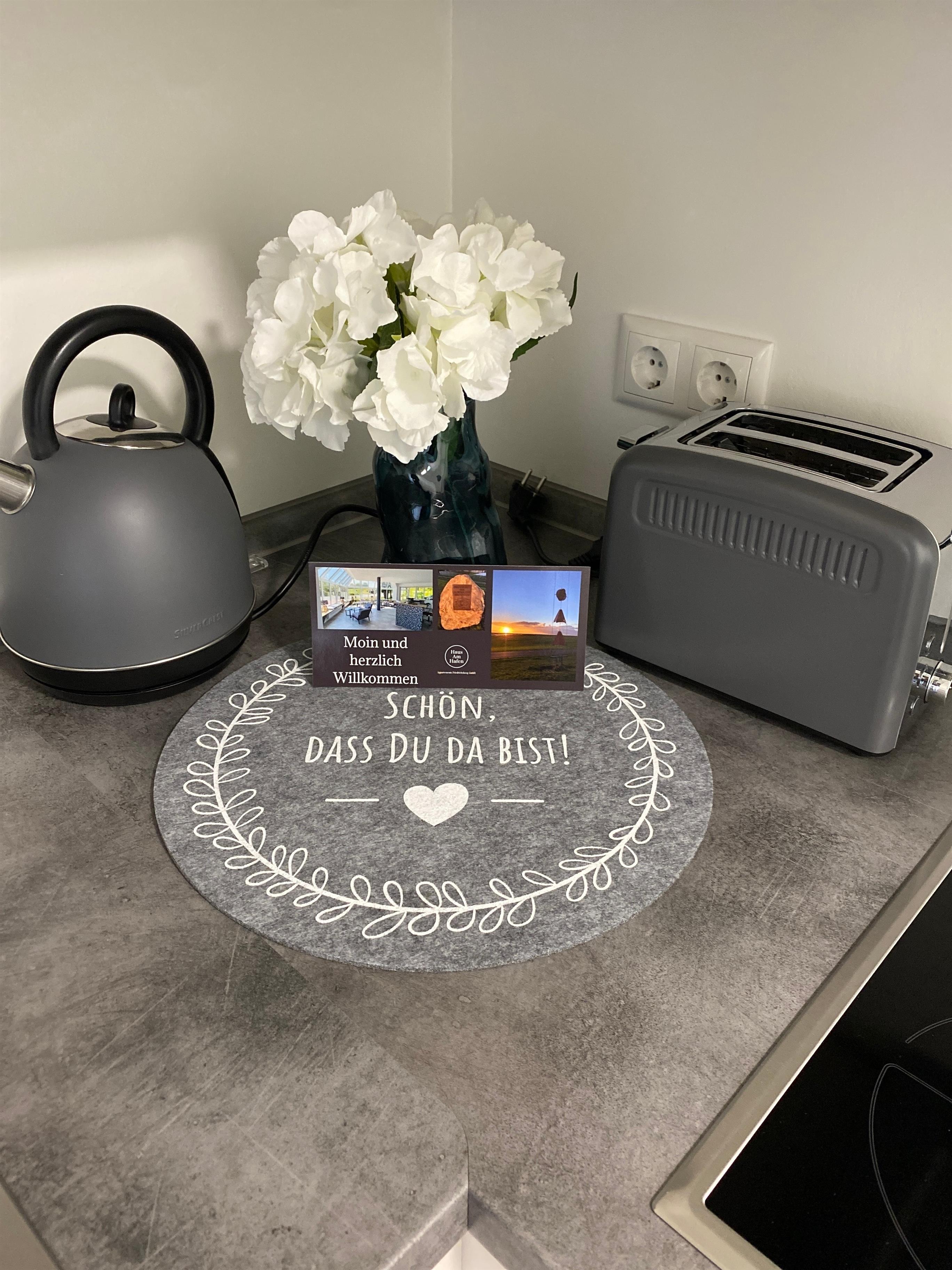 Die gut ausgestattete Küche besitzt unter anderem einen Toaster und eine Kaffeemaschine.