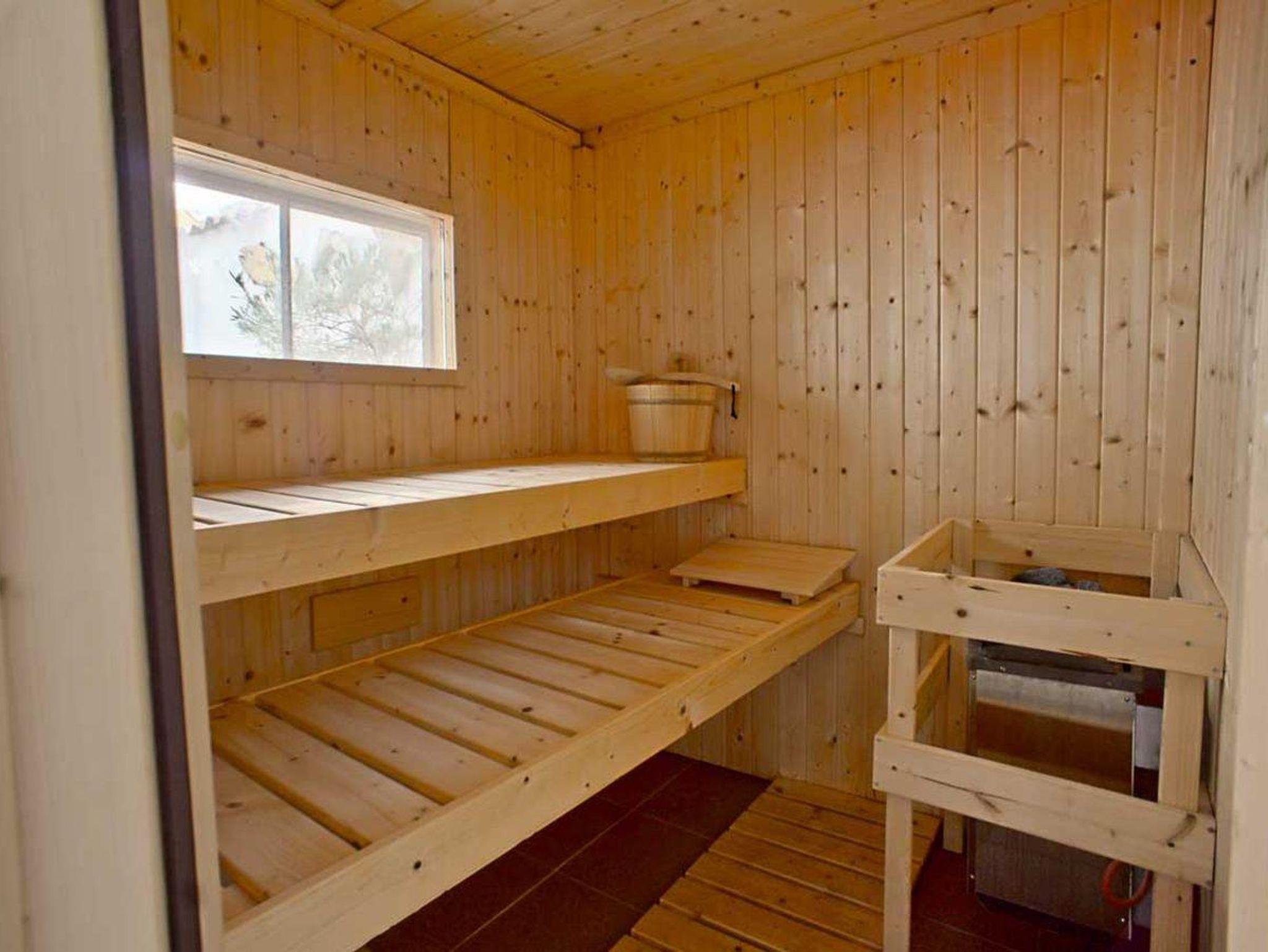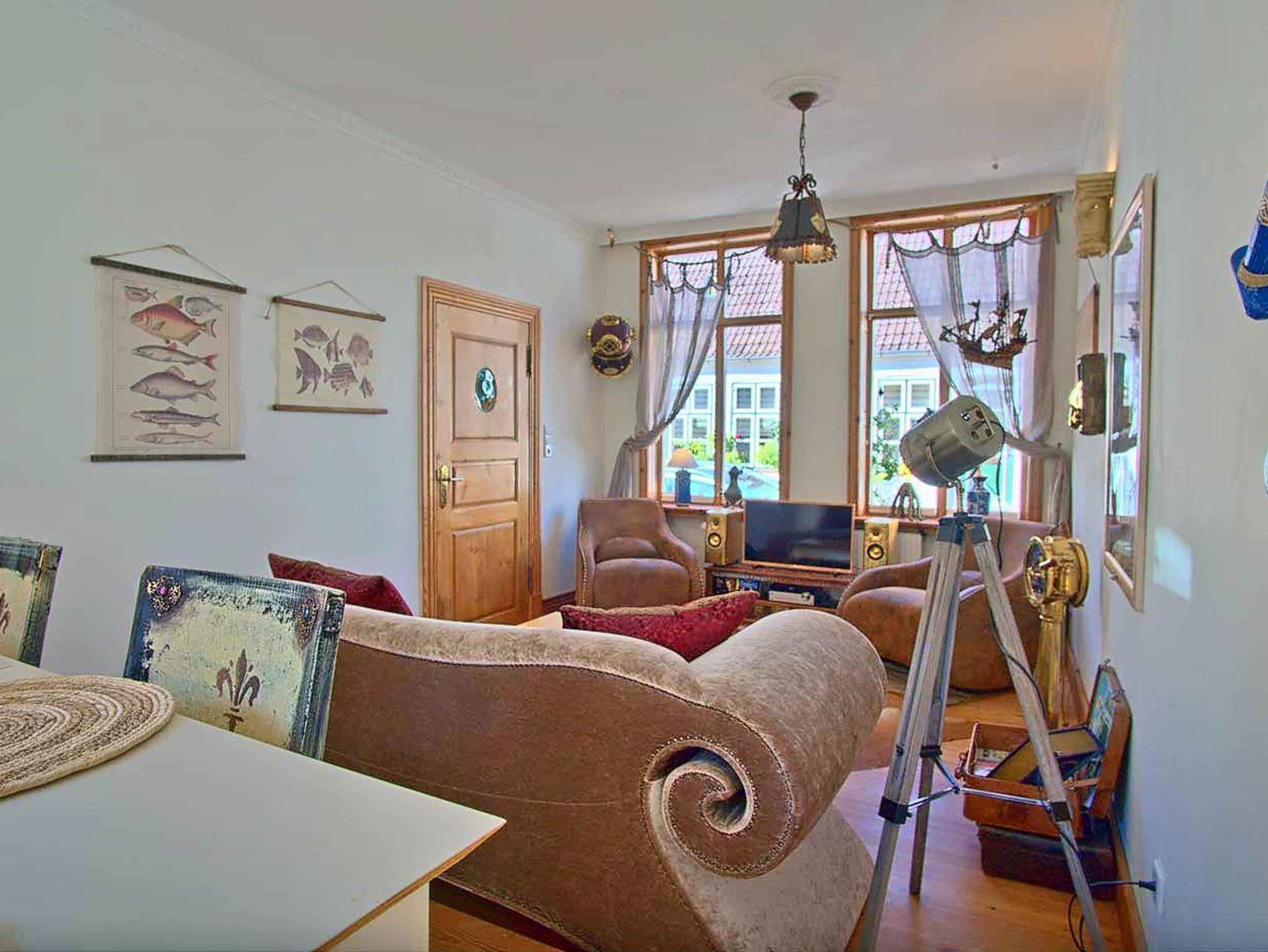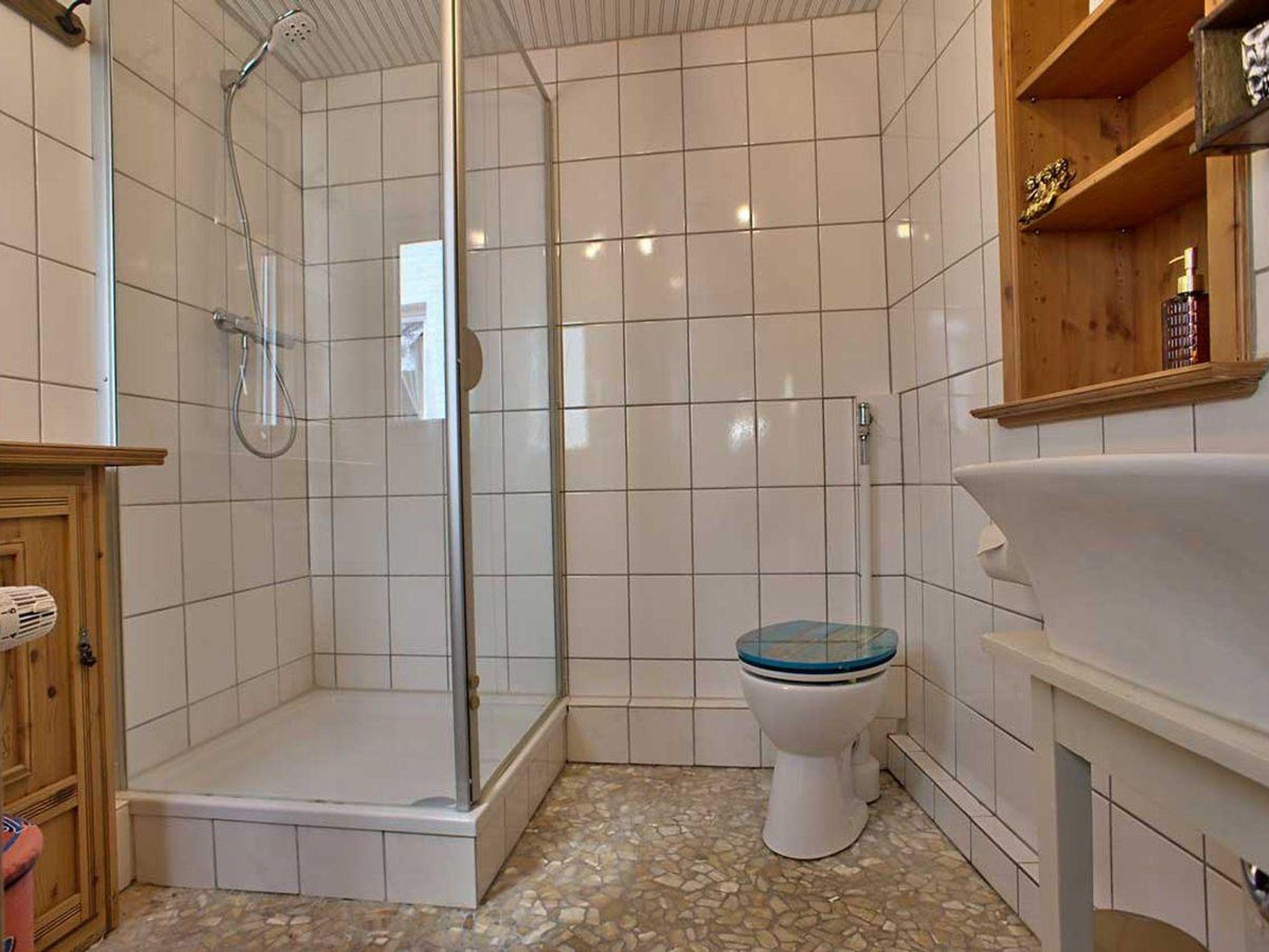 Vom Flur ausgehend betritt man links das Wohnzimmer mit dem dahinterliegenden Esszimmer. Dieses ist über eine ochsenblutrote Durchreiche mit der Küche verbunden. Hinter der handgetischlerten, vollausgestatteten Küche befindet sich ein Verbindungsflur, in wechem - durch einen Vorhang verborgen - Waschmaschine und der Flügeltrockner stehen. Der Flur führt zum (nach)mittags sonnenbeschienenen Innenhof, hinter dem die Sauna liegt. Am Ende des Flurs schließt sich das Bad mit Dusche an. Und zurück zur Diele des Hauses: Von hier aus geht es über die Treppe zu einem großen Schlafzimmer mit einem 1,60 m großen goldenen Doppelbett. Kleidung findet Platz in einer edlen Hängegarderobe und einer Künstlerkommode. An das große Schlafzimmer schließt sich eine winzige, niedrige Kammer an, die durch eine leichte Tür verschlossen werden kann, und in der eine fünfte Person in einem 90 cm breiten Bett schlafen kann. Neben dem großen Schlafzimmer liegt ein kleines Schlafzimmer, das fast komplett von einem 1,40 m großen, edlen Bett ausgefüllt ist und in dem sich ein zweiter Fernseher befindet. Dieser hat allerdings nur Antennenempfang, das heißt, dass die privaten Sender nicht zu sehen sind. Außerdem steht hier eine weitere Hängegarderobe und eine Künstlerkommode. Zum Kuscheln, Träumen, Ausruhen, Lesen, Fernsehen ist der Raum ideal.