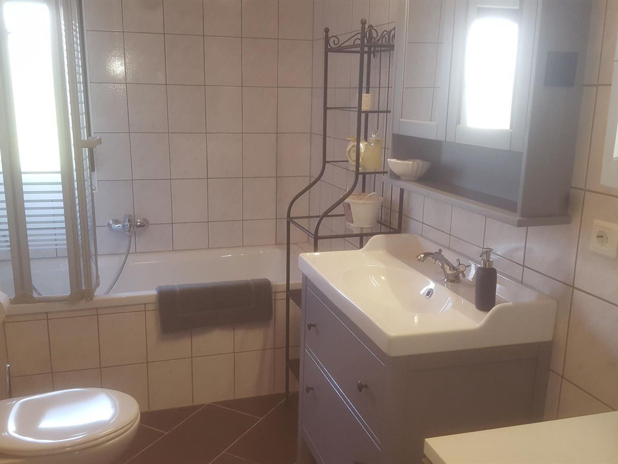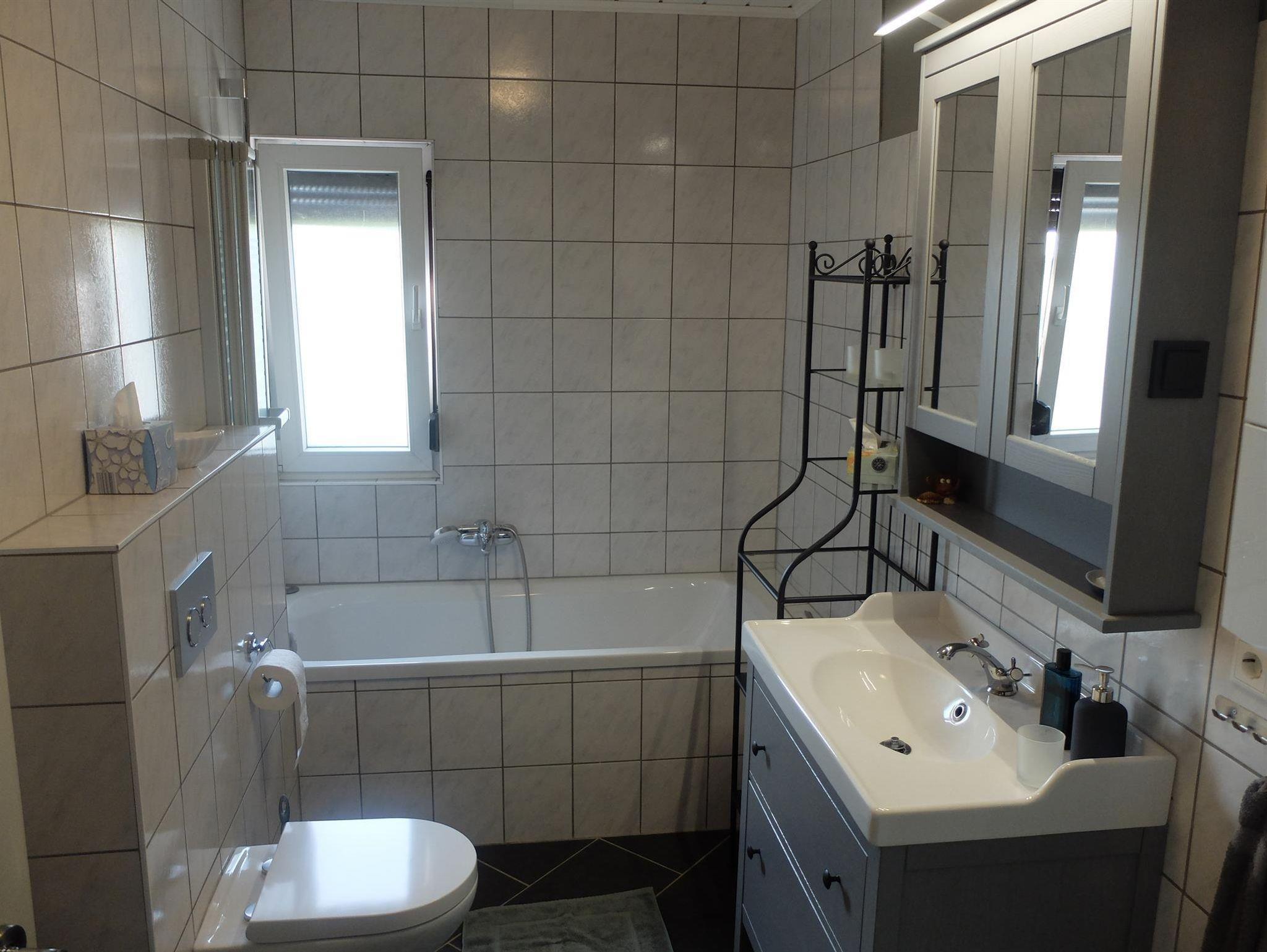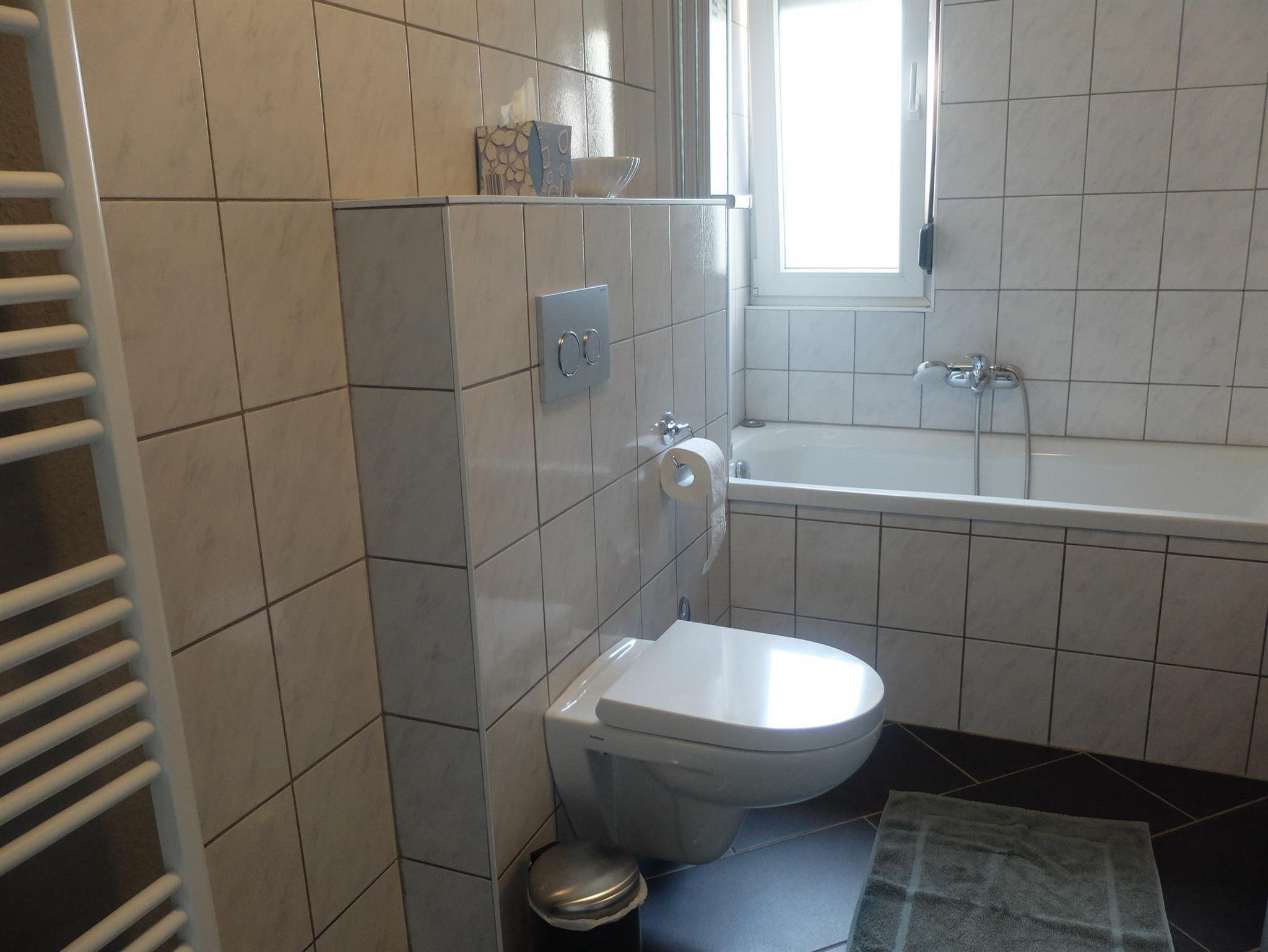 Im Tageslicht-Bad befinden sich Badewanne mit Duschmöglichkeit, WC und ein komfortabler Waschtisch.