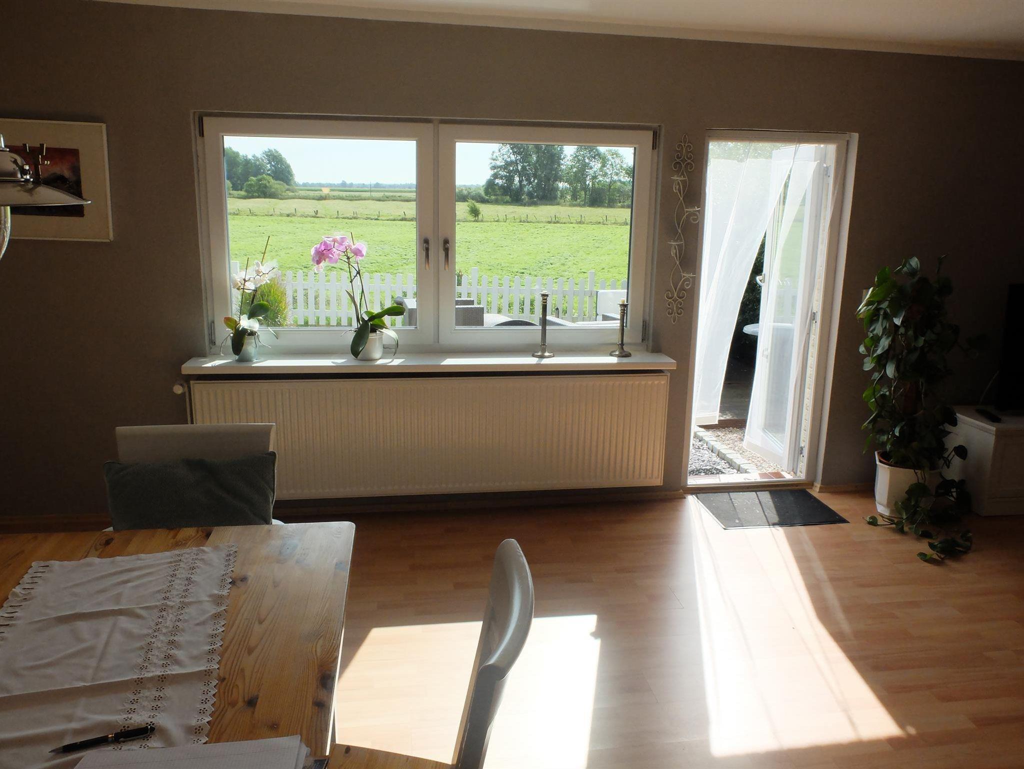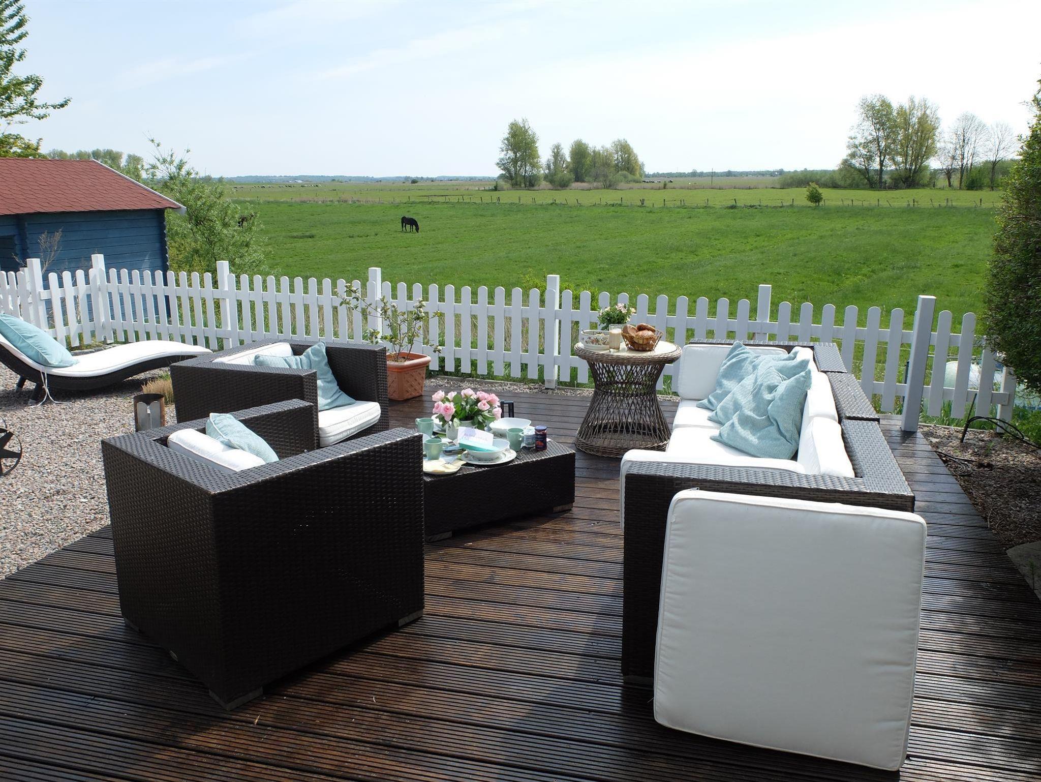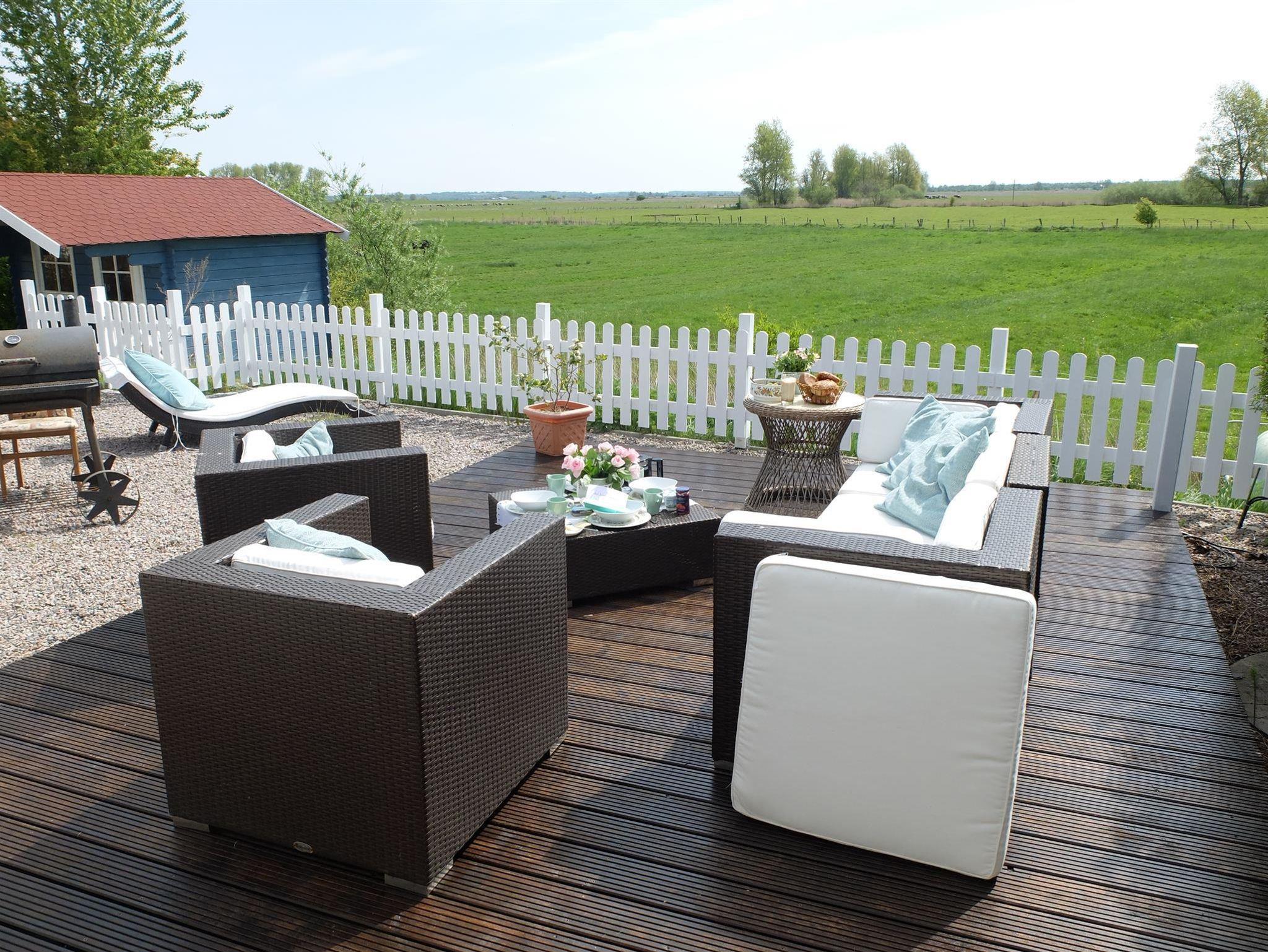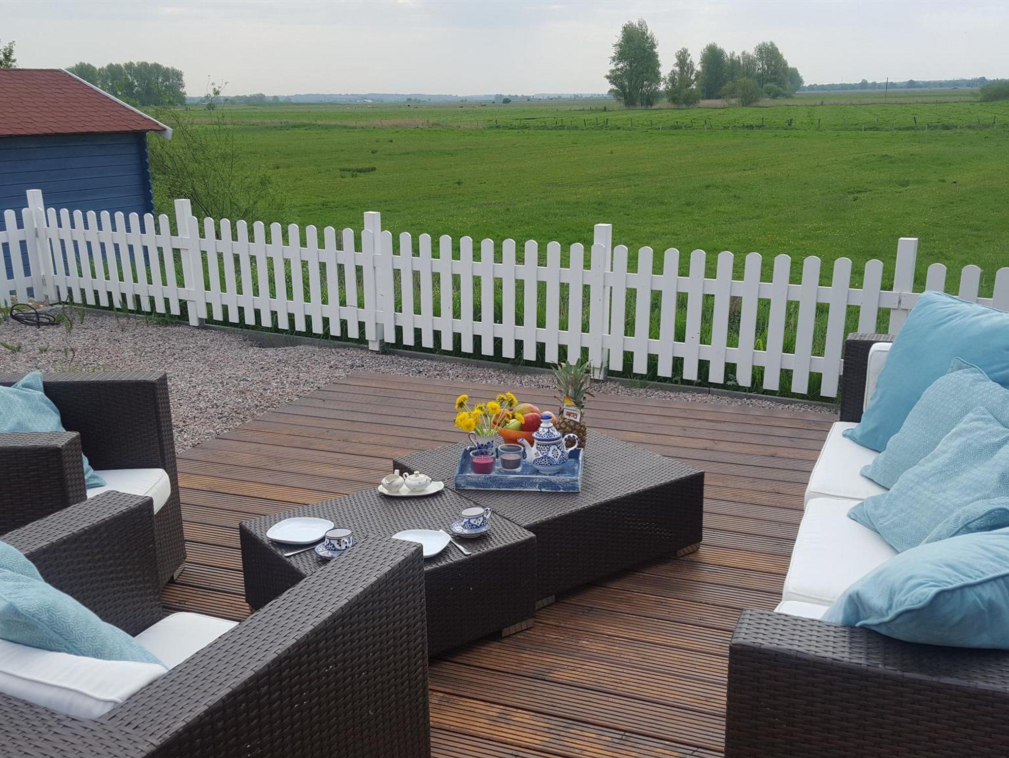 Sie ist mit zwei Schlafzimmern sowie einem großen Wohnzimmer mit Schlafsofa und einem großzügigen Essbereich ausgestattet. Vom Wohnzimmer erfolgt der Zugang zur Holzterrasse mit Blick über die weiten Felder. Die hochwertig eingerichtete Küche erfüllt viele Wünsche. Eine weitere Terrasse bietet Ihnen eine entspannte Aussicht auf die Treene. Von hier können Sie die Sonnenuntergänge und zu vorgerückter Stunde auch sternenklare Nächte genießen.
