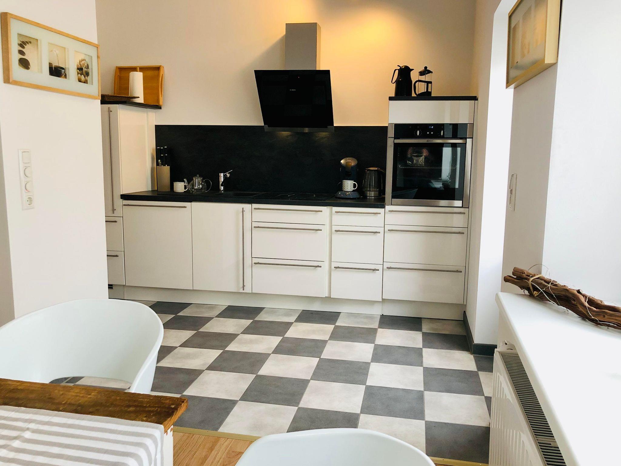 Die moderne Küche ist mit allem ausgestattet, was man so braucht. Vom Essplatz aus hat man einen schönen Blick in den Wintergarten. Das Wohnzimmer ist gemütlich eingerichtet mit Sessel und Sofa. Das gesamte Altstadthus ist mit einem Mix aus antiken und modernen Gegenständen eingerichtet.