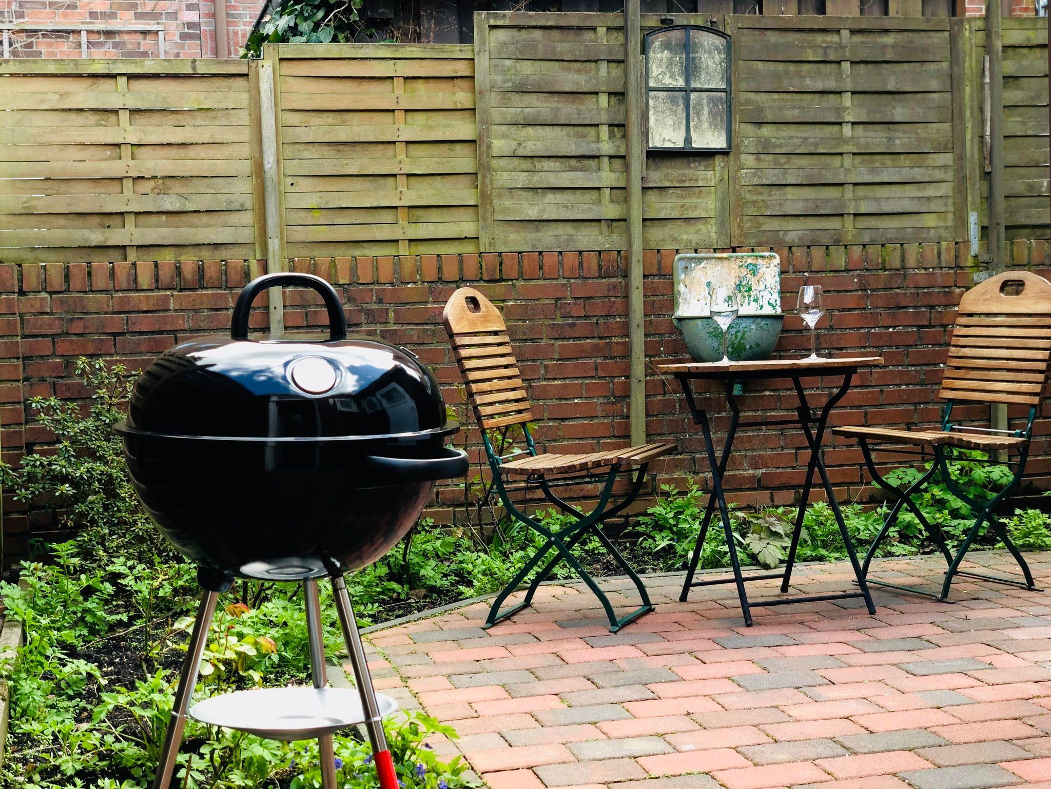 Weiterhin lädt der romantische kleine Garten mit Bistrotisch und Hochlehnerstühlen zum Entspannen und Sonne Tanken ein.