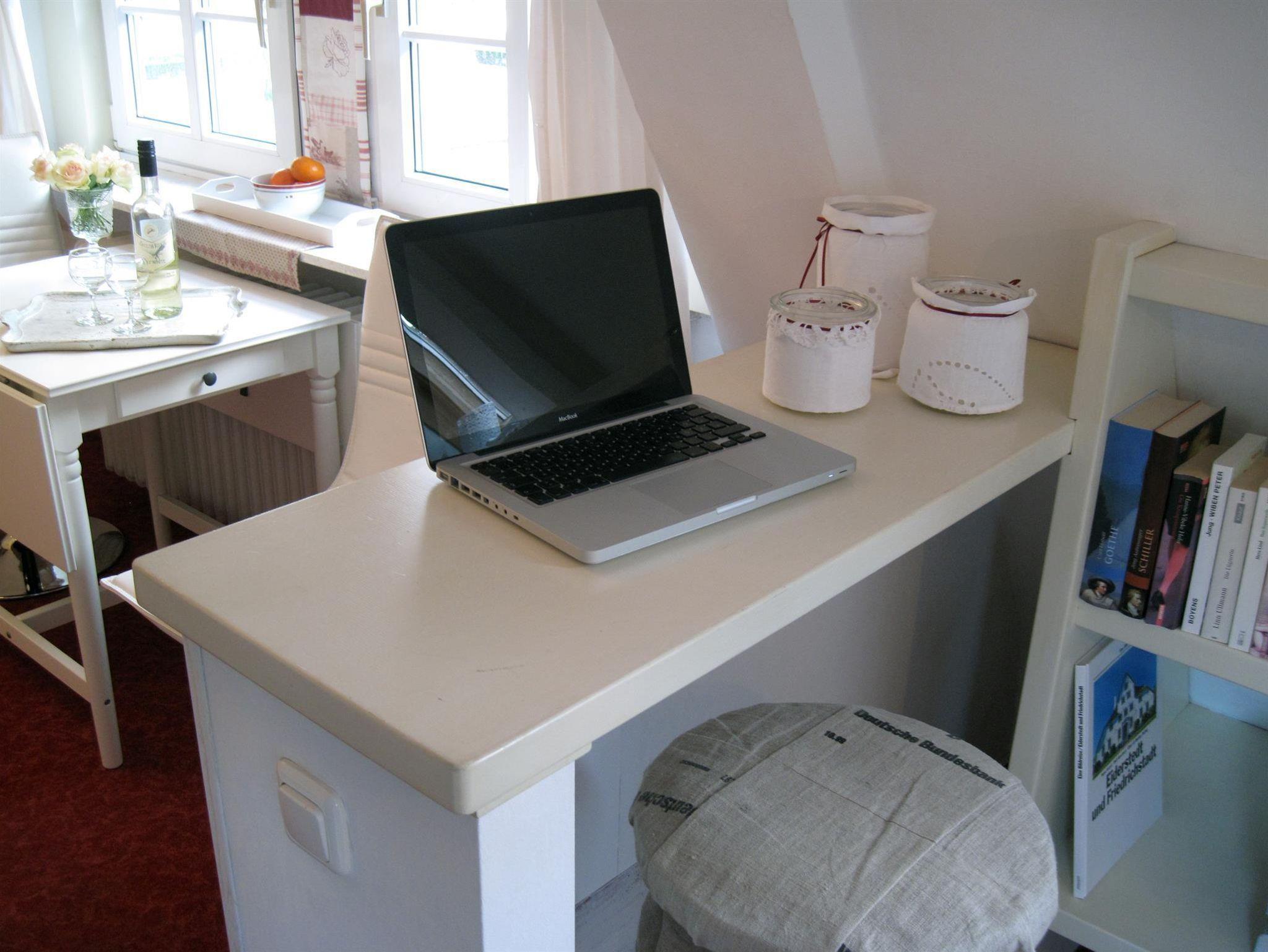 Im Obergeschoss liegt das Wohnzimmer mit Sessel und Schlafsofa, einem weiteren Esstisch mit Stühlen sowie einem kleinen Arbeitsplatz. Eine kleine aber feine Auswahl an DVDs, CDs, Büchern und Gesselschaftsspielen und ein kostenfreier Internetzugang über WLAN stehen den Gästen zur Verfügung.