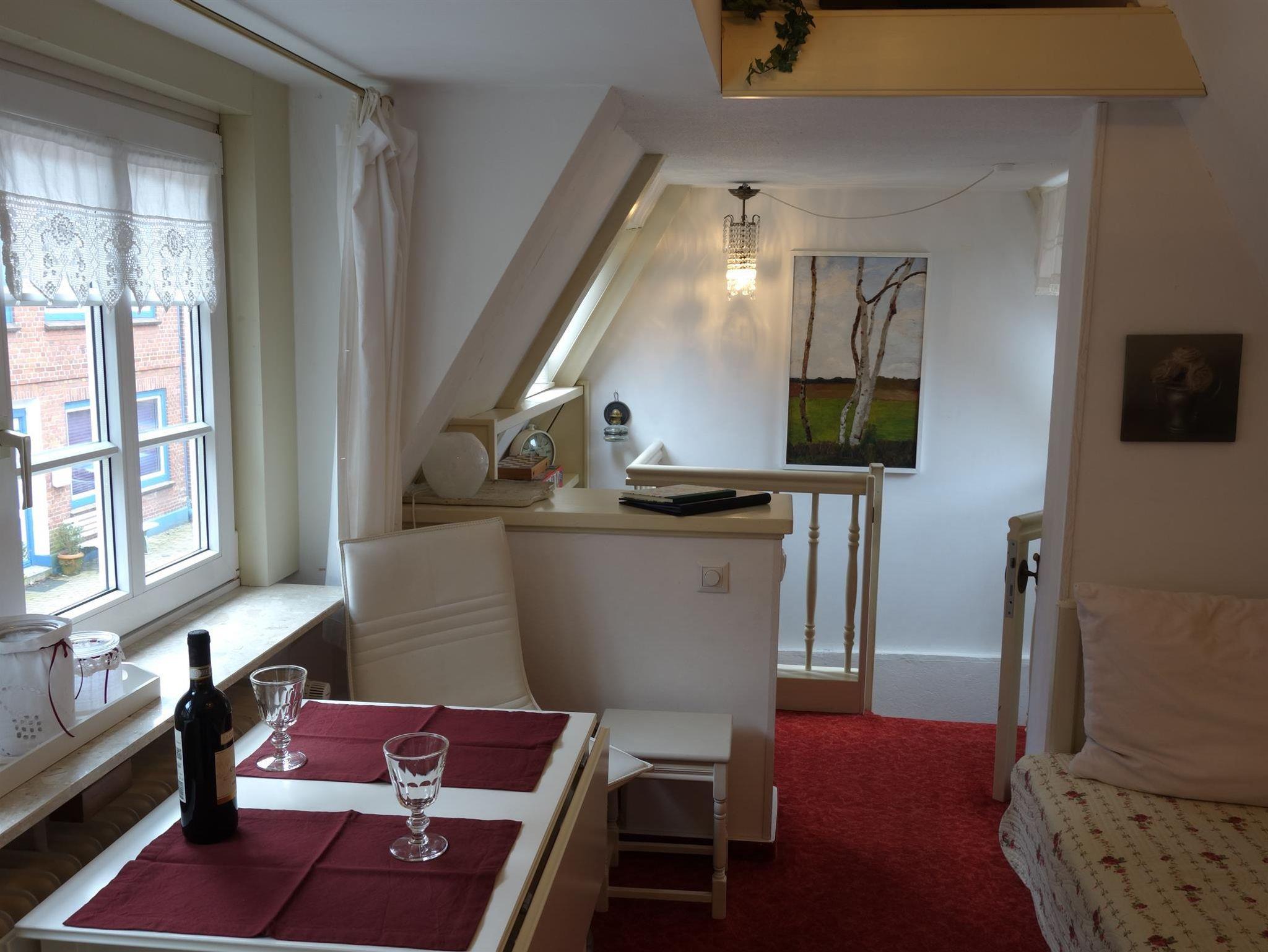 Unser kleines, mit Efeu bewachsenes Ferienhäuschen steht in der Altstadt von Nordfrieslands historischem Stadtdenkmal Friedrichstadt. Die Westerlilienstraße geht direkt von dem mit Rosen bepflanzten Stadtfeld und seinen hohen Bäumen ab. Zum zentralen Marktplatz mit seinen berühmten Giebelhäusern sind es nur 200 m. Sie können direkt vor dem Haus parken oder in einer der zahlreichen weiteren kostenlosen Parkmöglichkeiten in unserer Straße. Den Charme des alten Hauses bewahrend, sind die zwei Zimmer auf zwei Etagen (ca. 40 qm²) mit vielen ausgefallenen antiken Stücken und Accessoires möbeliert. Im Untergeschoss befindet sich der Flur, das Schlafzimmer mit Doppelbett, das Duschbad, die voll ausgestattete Küche mit Geschirrspüller und einer Sitzecke. Im Obergeschoss liegt das Wohnzimmer mit Sessel und Schlafsofa, einem weiteren Esstisch mit Stühlen sowie einem kleinen Arbeitsplatz. Eine kleine aber feine Auswahl an DVDs, CDs, Büchern und Gesselschaftsspielen und ein kostenfreier Internetzugang über WLAN stehen den Gästen zur Verfügung. Das Schlafsofa kann für eine dritte Person aufgebetet werden. Selbstverständlich ist es bei zwei Gästen auch möglich, dass eine Person im Wohnzimmer, die andere im Schlafzimmer nächtigt.
