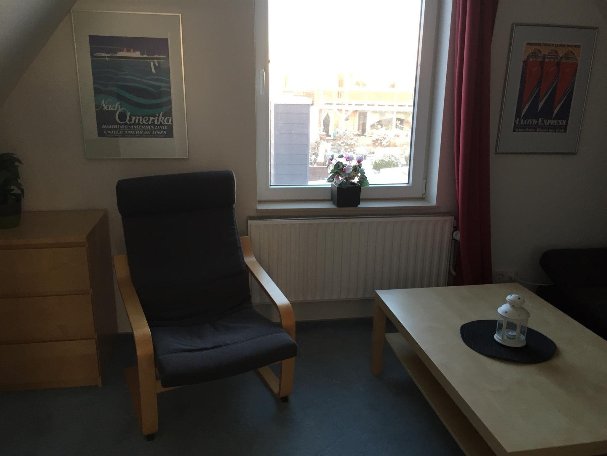 Im ersten Stock befindet sich das Schlafzimmer und ein kleines, gemütliches Wohnzimmer. Beide Räume im Obergeschoss haben eine Dachschräge.