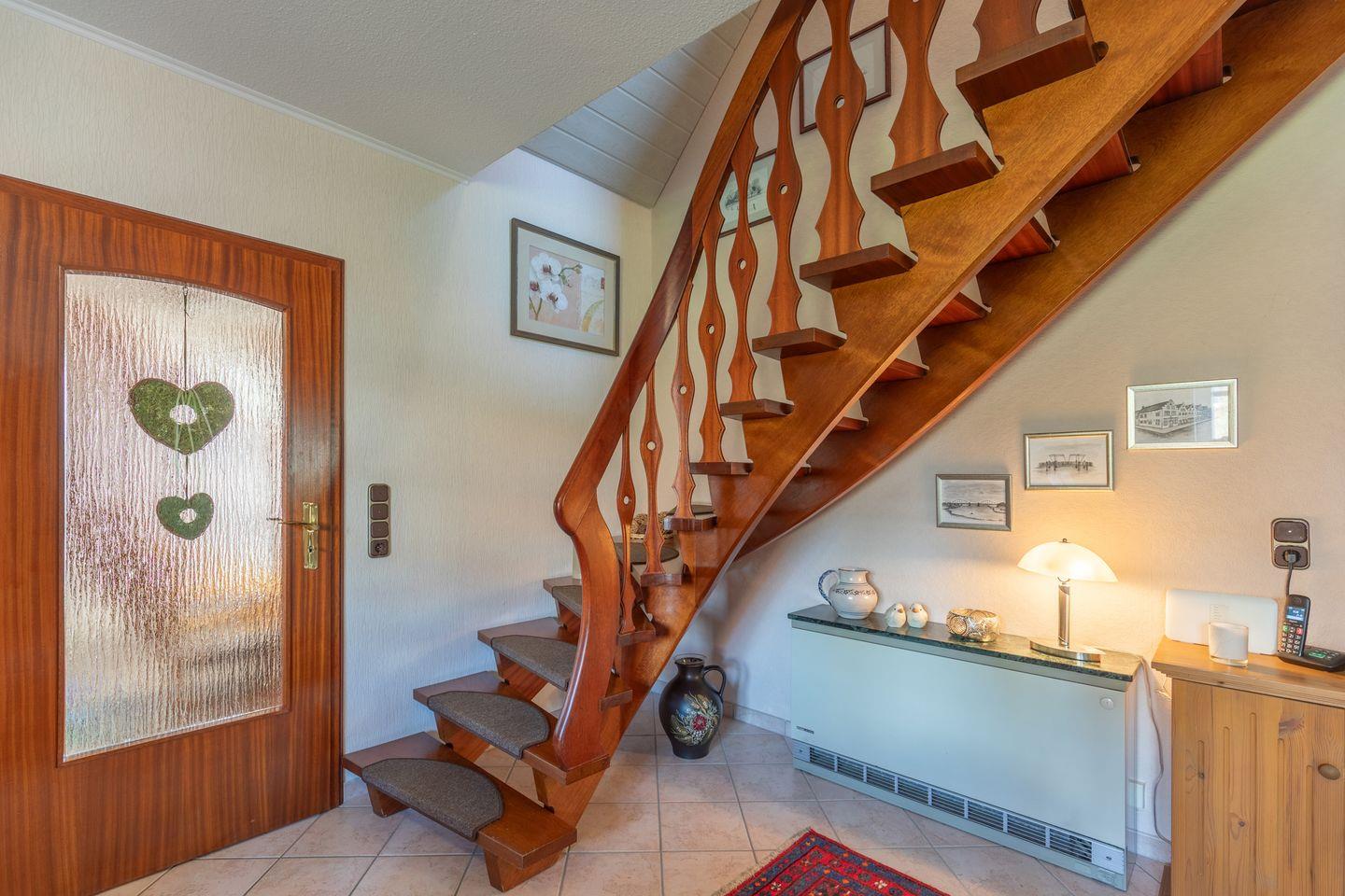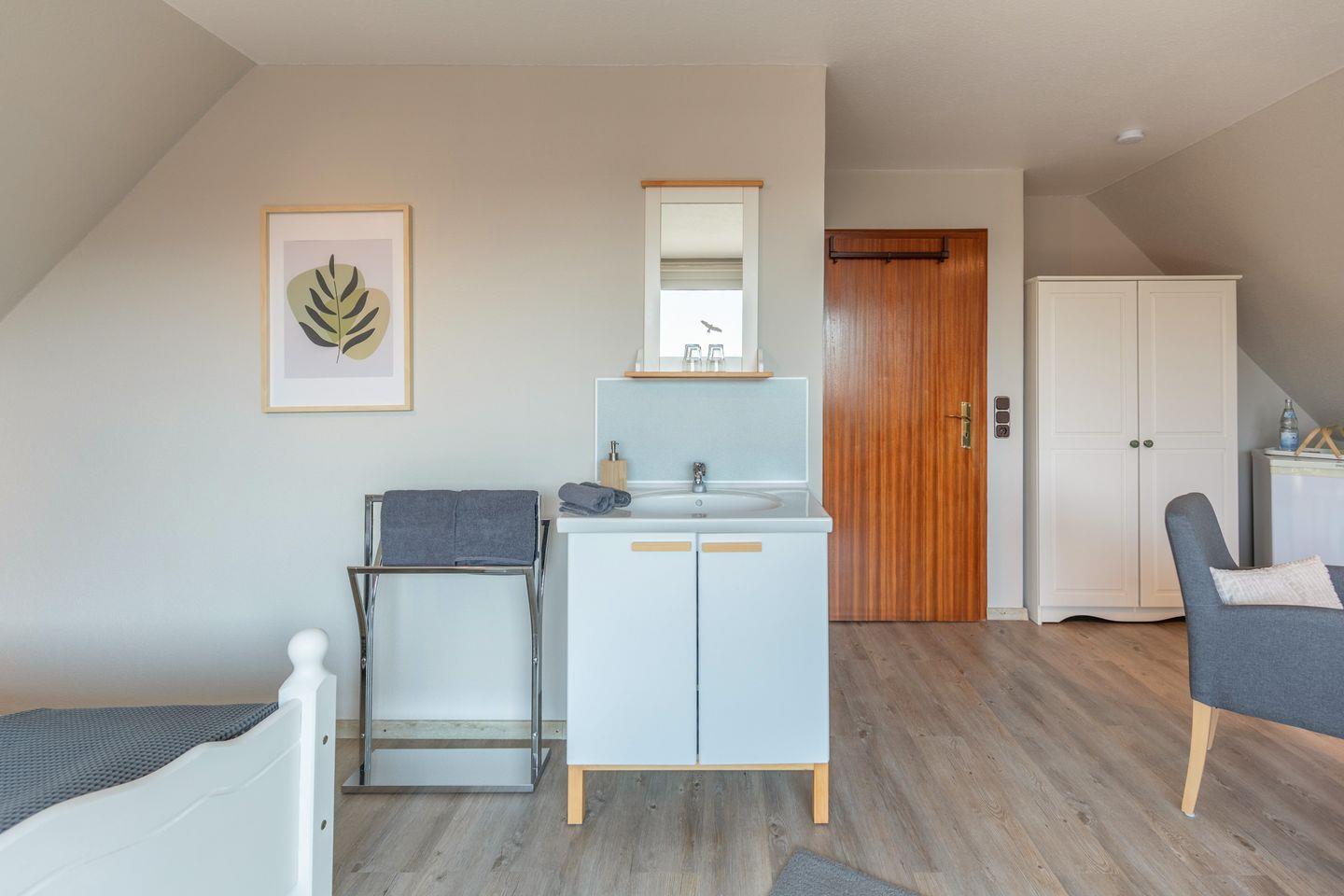 Das Zimmer befindet sich im ersten Obergeschoss eines Wohnhauses und ist über eine Innentreppe erreichbar. Der Wohnbereich überzeugt mit einer gemütlichen Sofaecke und einem Fernseher – ideal zum Entspannen und Verweilen. Auf dem großzügigen, überdachten Balkon lässt sich bei einer Tasse Kaffee die frische Luft in ruhiger Atmosphäre genießen.
