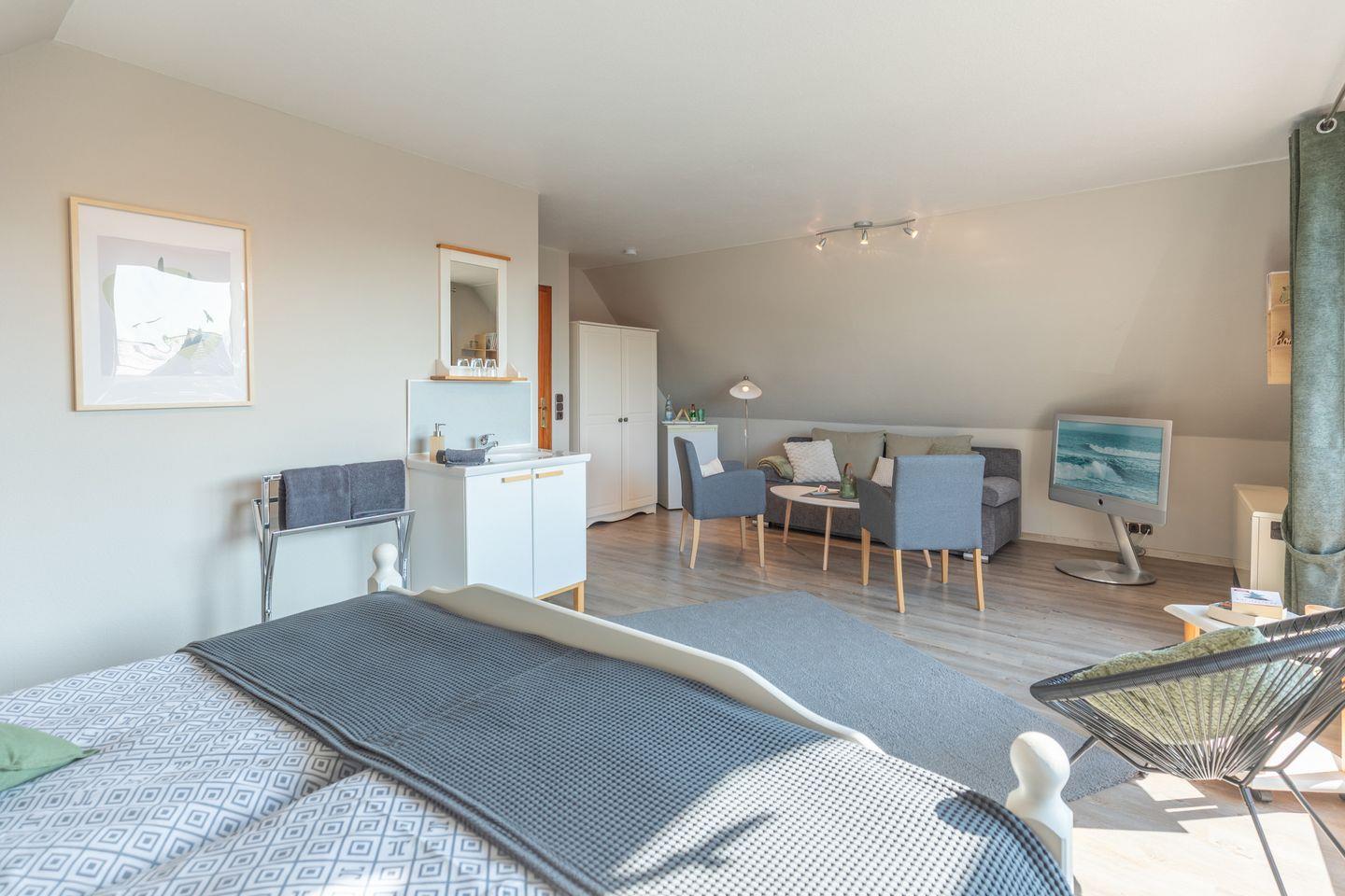 Willkommen in der "Loggiastuuv" – Ihrem perfekten Rückzugsort in der malerischen Umgebung von Friedrichstadt. Dieses charmante, 30 Quadratmeter große Doppelzimmer bietet alles, was Sie für einen entspannten Aufenthalt benötigen und eignet sich hervorragend für Paare oder Alleinreisende, die eine ruhige Auszeit in ländlicher Idylle suchen.