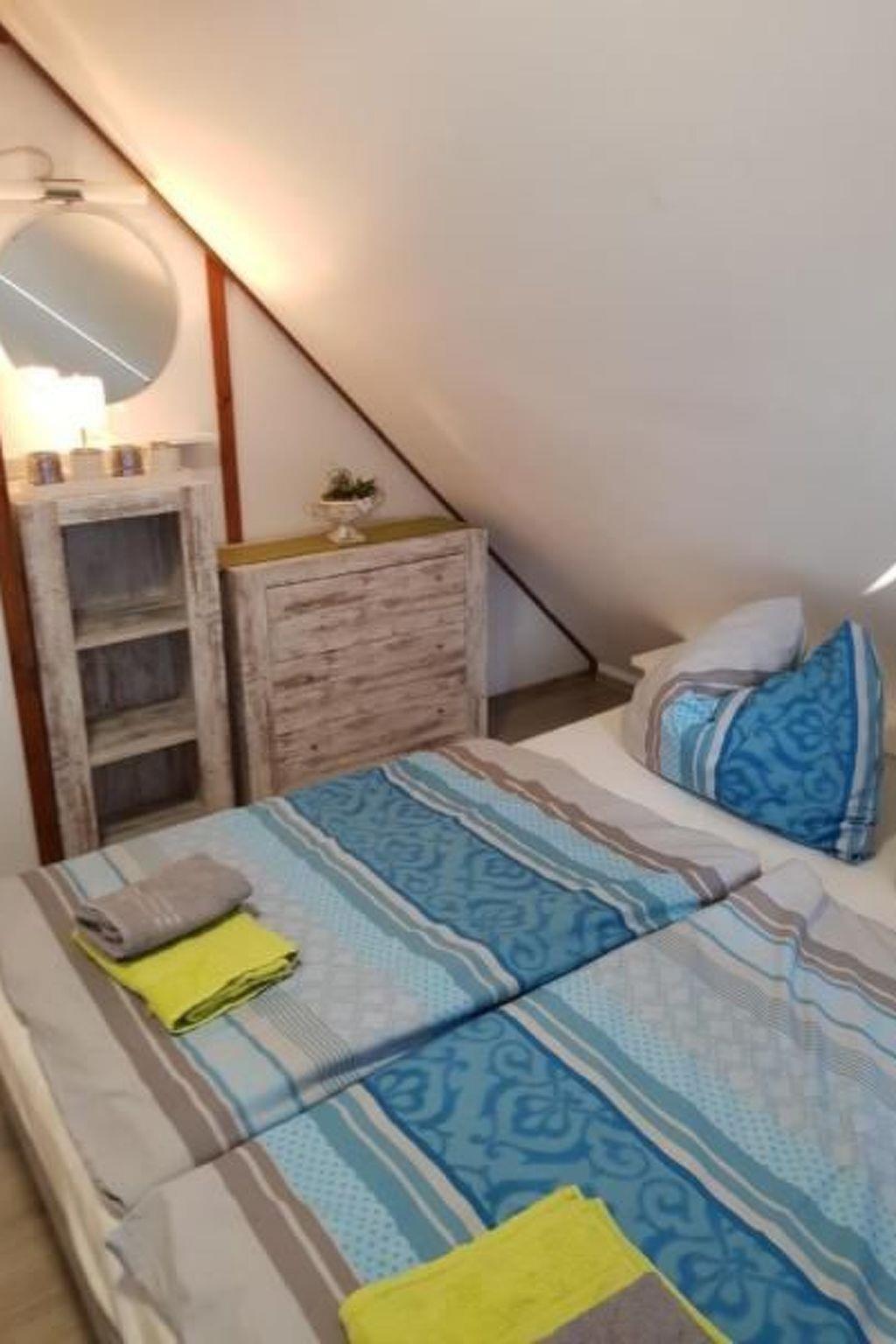 One bedroom on the 1st floor with wardrobe (a double bedroom with separate WC and washbasin, an extra shower with separate WC), on the 2nd floor a double bedroom and a bedroom with two single beds. Both have access to the balcony.