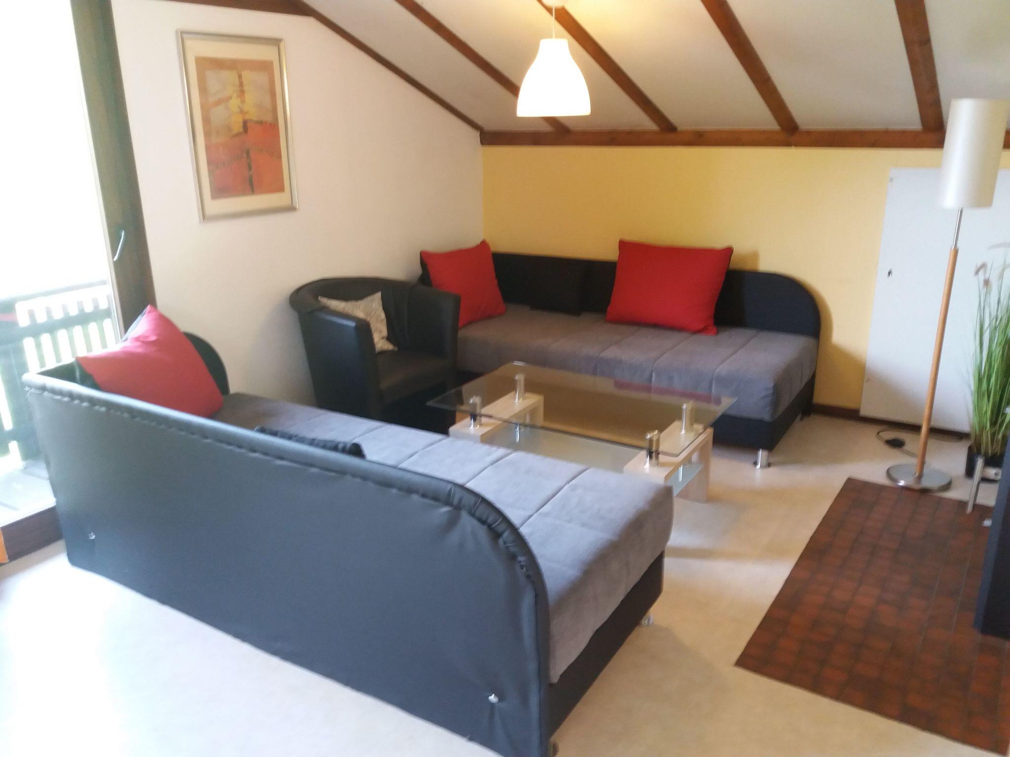 The interior of our holiday home, consisting of three self-contained flats, is equipped with all the comforts you need for a relaxing stay. On the ground floor you will find the large, barrier-free Wolf flat with air conditioning and the cosy Geisslein flat. The upper floor houses the Rapunzel flat, which not only impresses with its cosiness, but also with two balconies. All flats offer WLAN, flat-screen TVs, CD and DVD players, wood-burning stoves and direct access to the terrace or balcony.