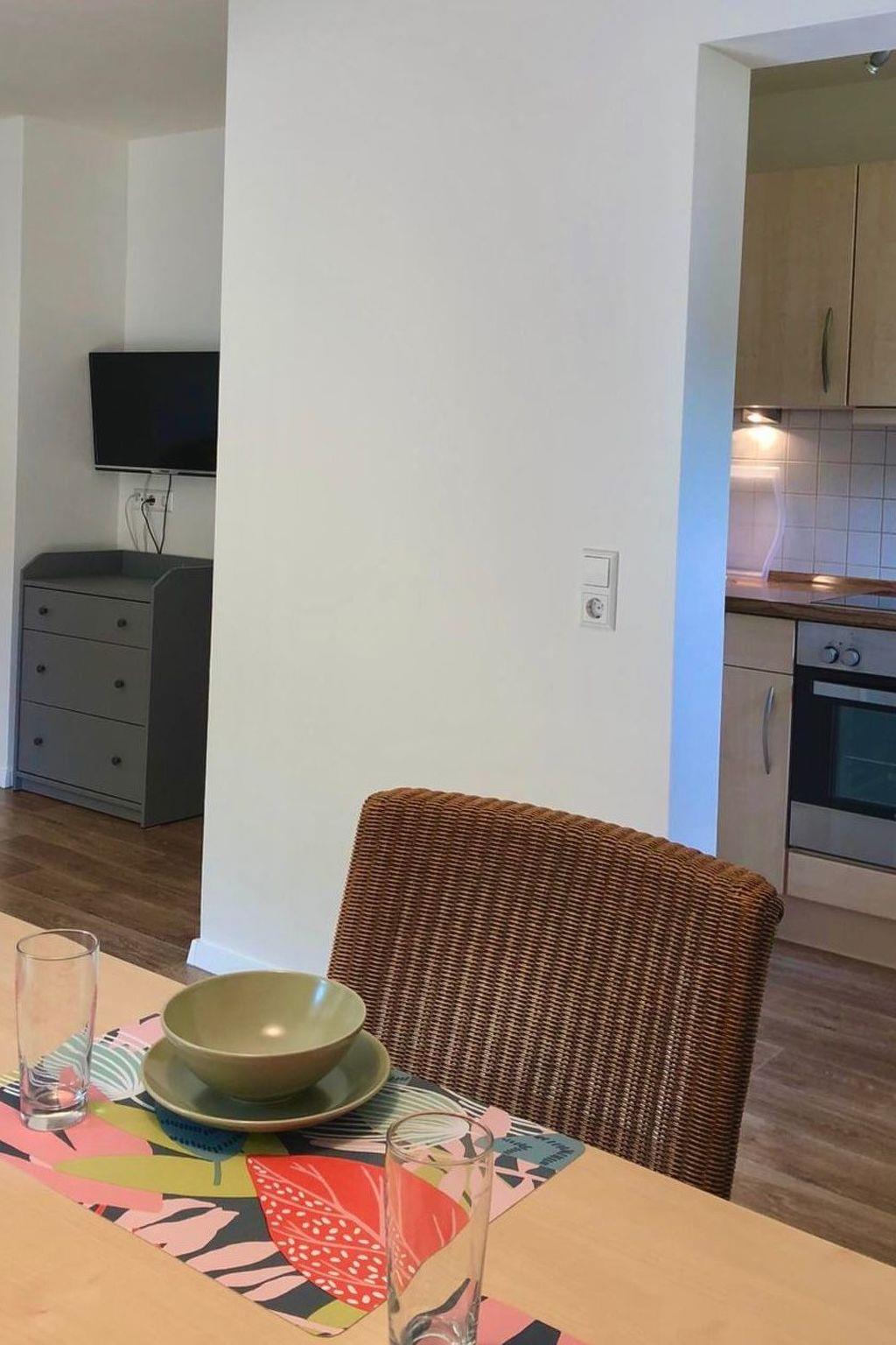 The "Fuchsbau" holiday flat, with an area of approx. 55 m², welcomes you and your family of up to 4 people with an inviting living atmosphere. The large living area integrates a separate, modern kitchen that leaves nothing to be desired: dishwasher, ceramic hob, oven, fridge, microwave and much more are available. The living room also has a cosy sofa set, a dining area and large panoramic windows that provide plenty of light and access to the sun terrace. Two tastefully furnished bedrooms and a daylight bathroom with shower complete the space on offer.