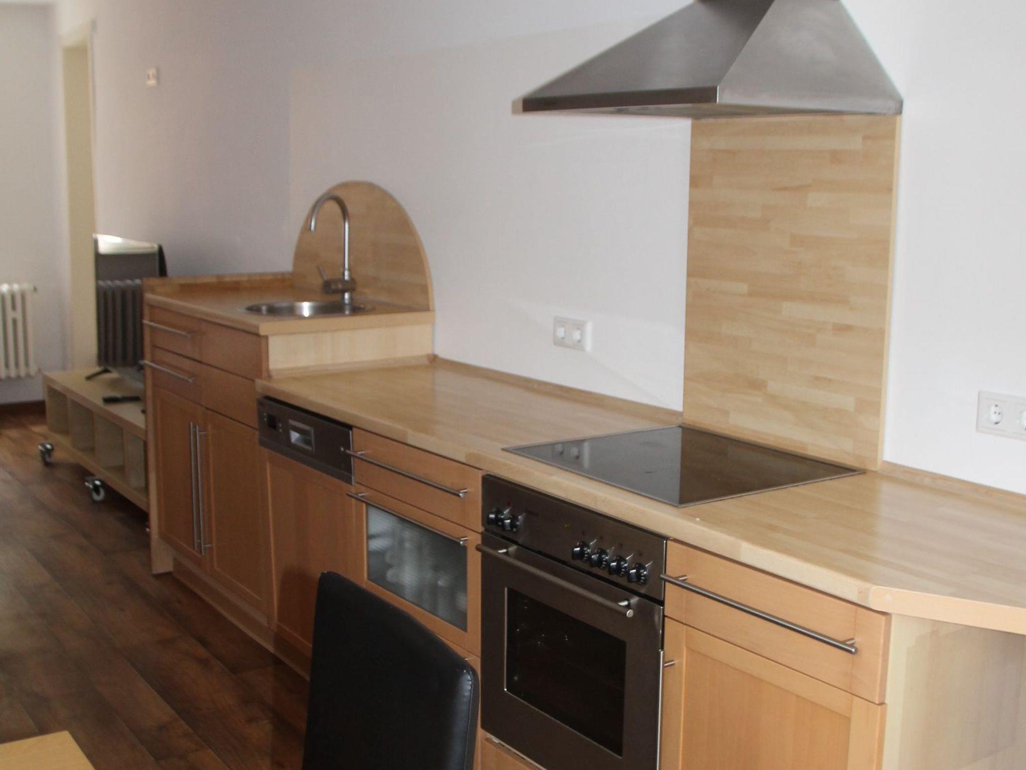 Wohn- bzw. Esszimmer mit Küche und ein Badezimmer mit Badewanne.