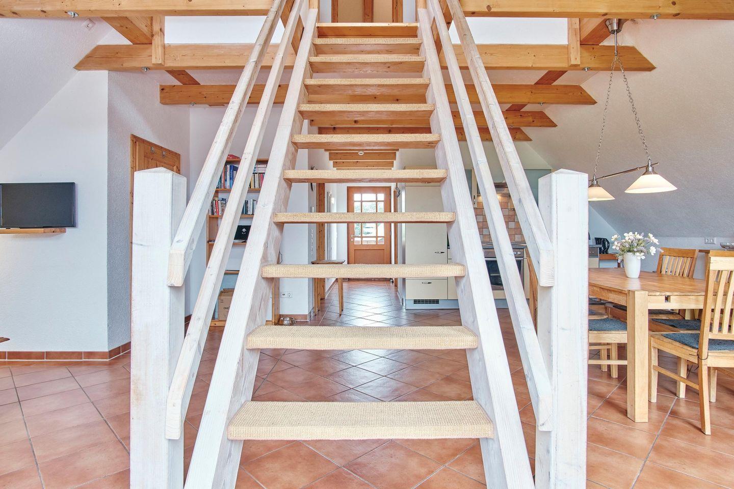 Dieses Domizil ist über eine offene Außentreppe aus Holz erreichbar.