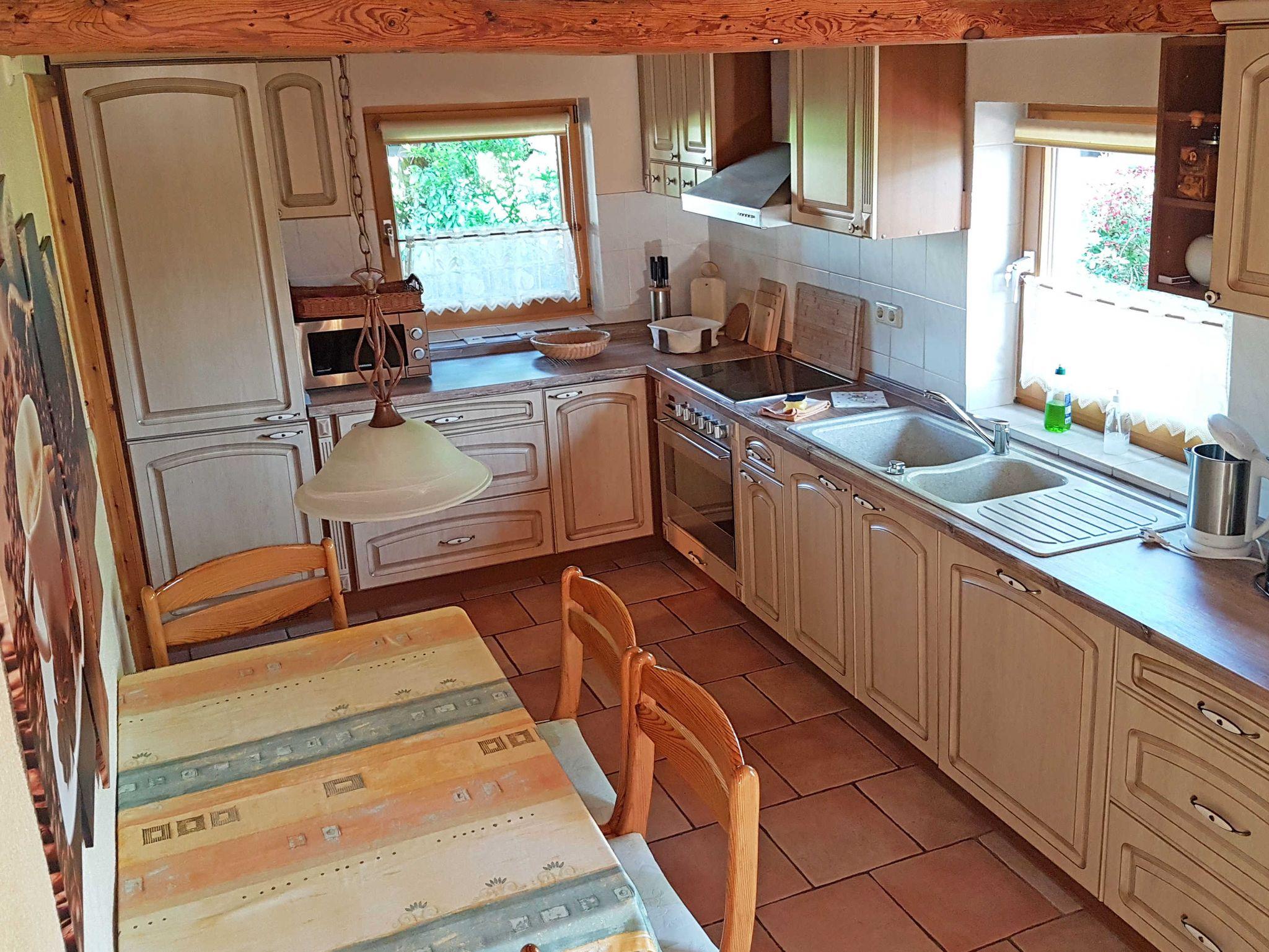 Eine große, voll eingerichtete Küche mit Geschirrspüler, Herd, Mikrowelle, Kühlschrank mit Gefrierfach und Waschmaschine (gegen Gebühr).