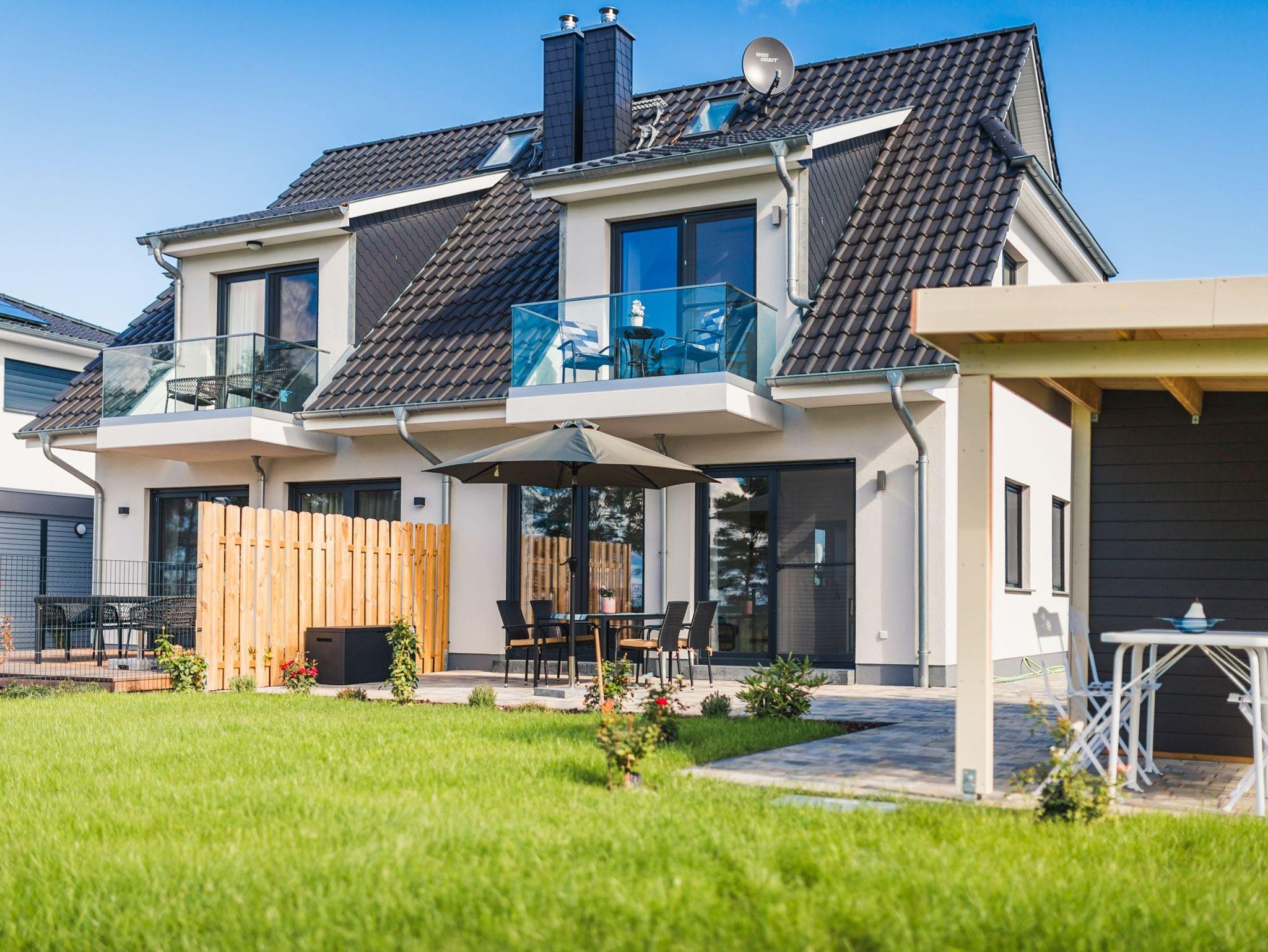 Ebenfalls im Obergeschoss finden Sie das moderne Hauptbad mit komfortablen Doppelwaschtisch, bodengleicher Dusche, Shower - Pipe und Badewanne, von dem aus auch der Bodden zu sehen ist.
