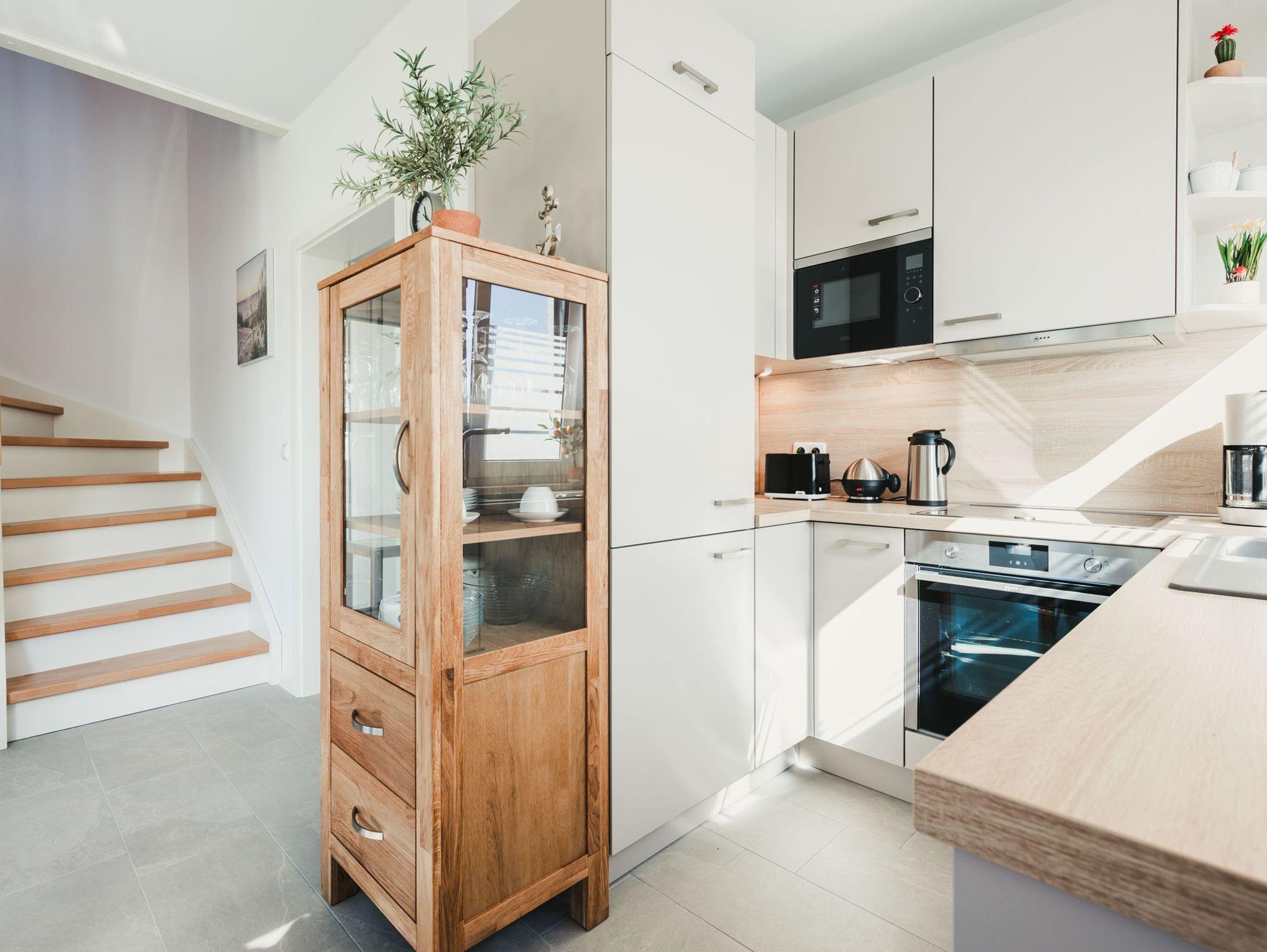 Im Erdgeschoss befindet sich der offene Wohn-, Essbereich mit Ledergarnitur, TV und einer modernen Einbauküche. Außerdem finden Sie auf dieser Ebene ein zusätzliches Tageslichtbad mit bodengleicher Dusche, einen kleinen Abstellraum und den angrenzenden Hauswirtschaftsraum mit Waschmaschine.