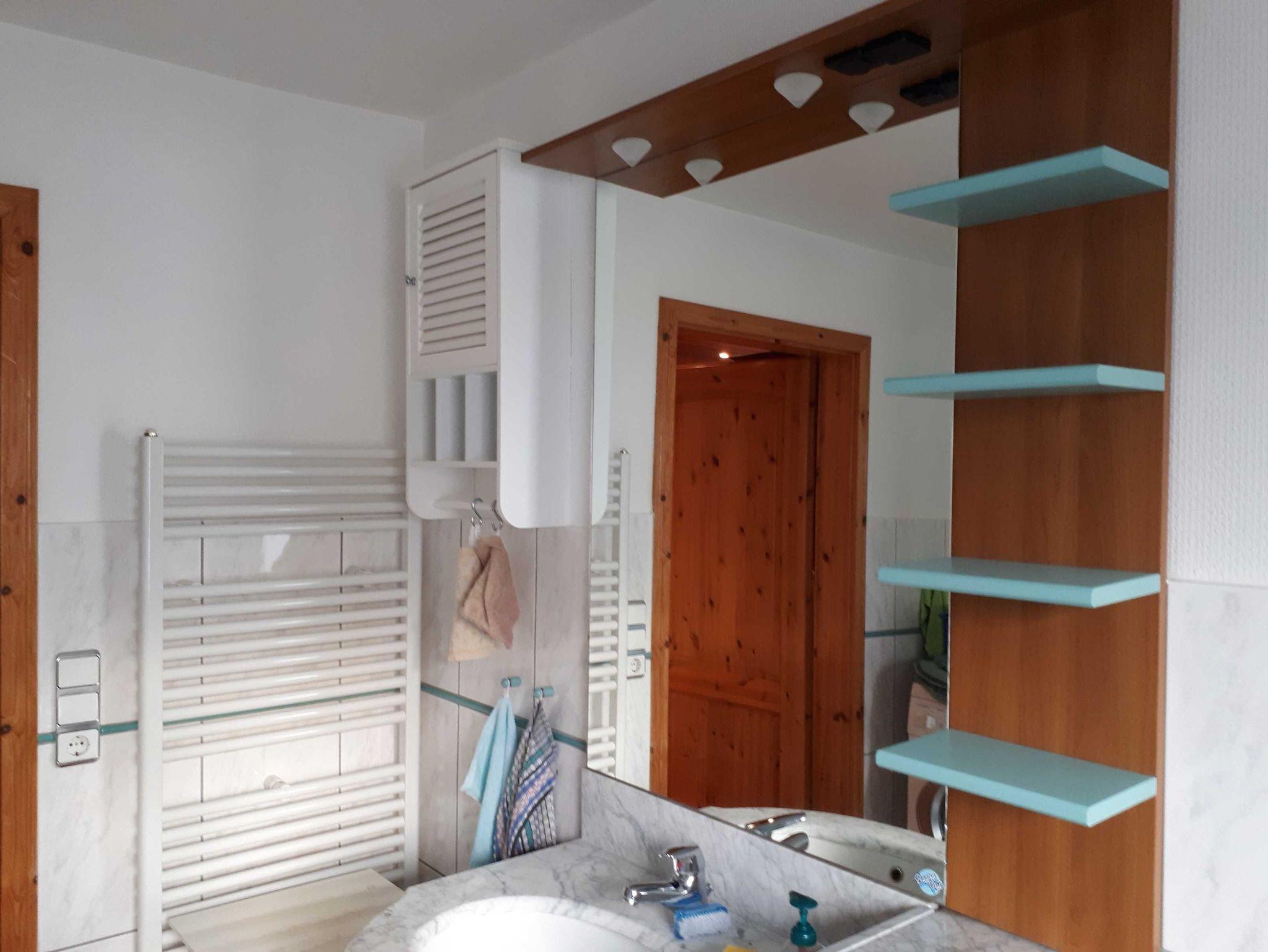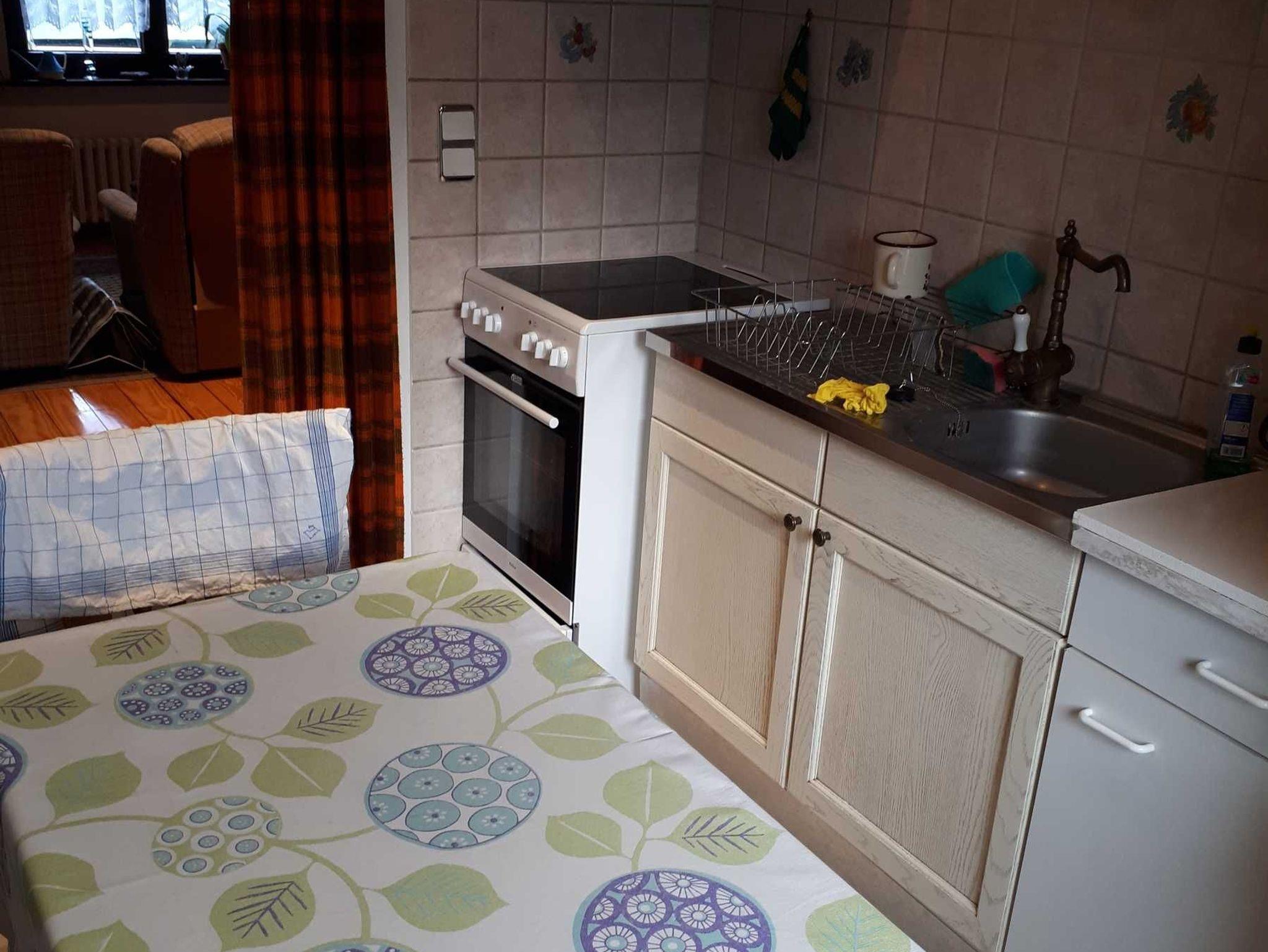 Voll ausgestattete Küche und Bad mit Dusche und Waschmaschine grenzen an das geräumige Wohnzimmer an.