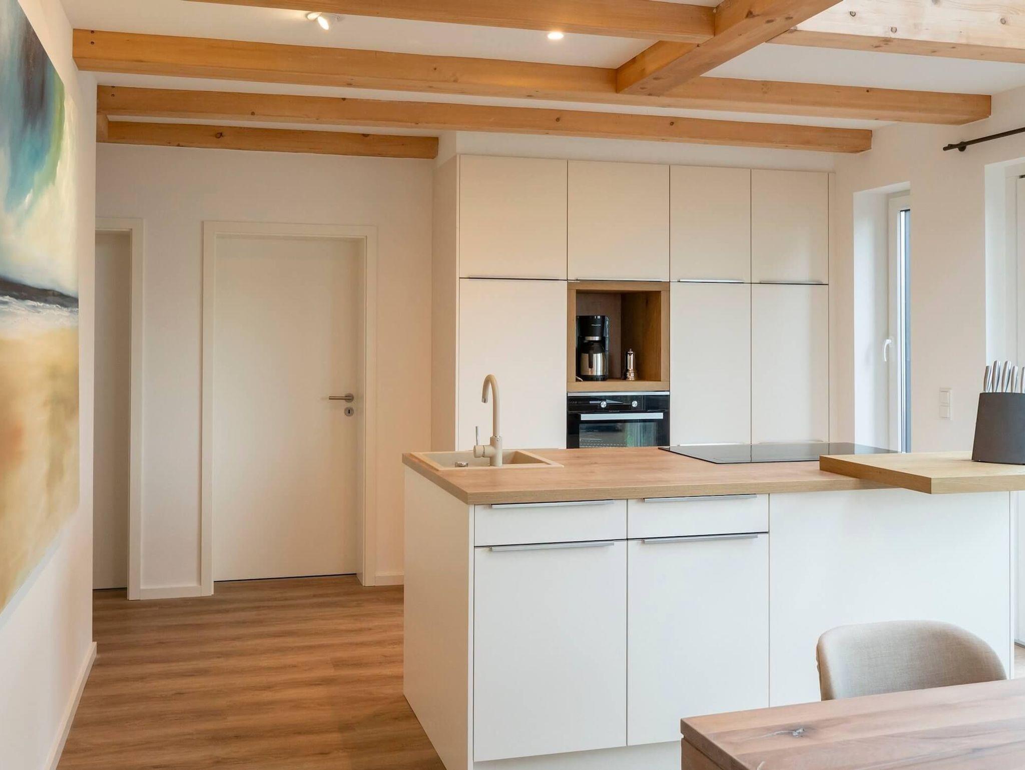 Das Haus hat im Untergeschoß eine offene Küche mit einem Essbereich und einem großen Esstisch. Ein kleines Sofa lädt zusätzlich zum Ausruhen ein.