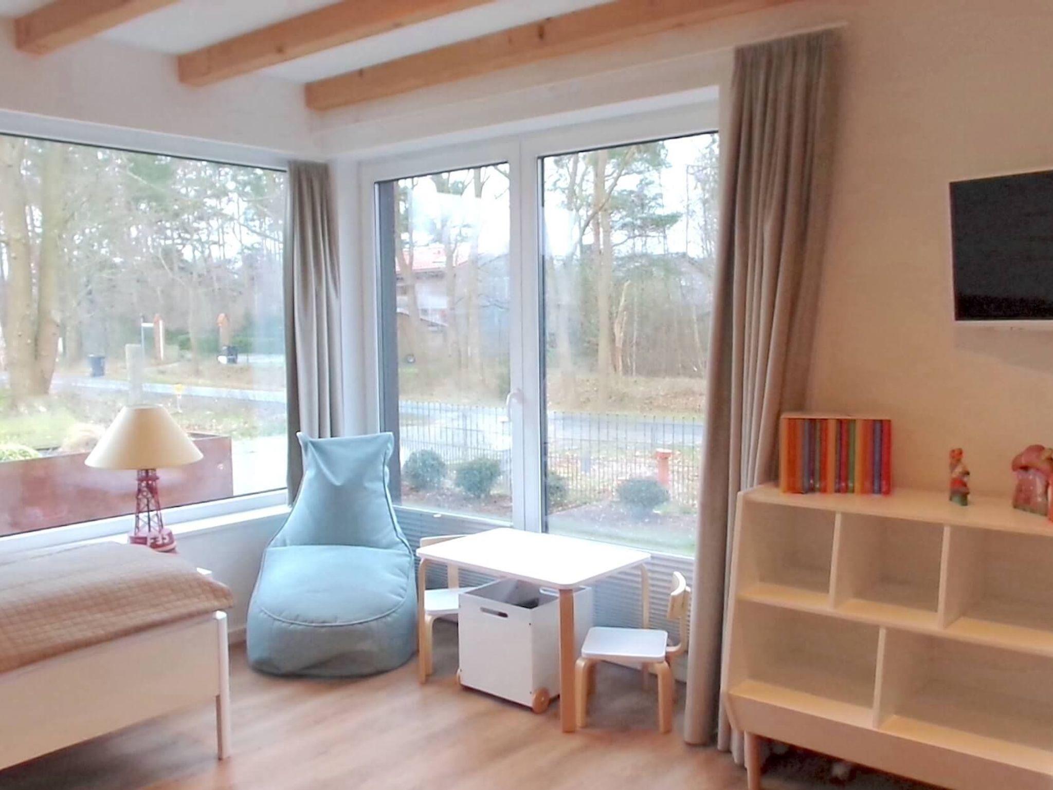 Zwei Schlafzimmer und die beiden Bäder befinden sich im Erdgeschoss. Eines der Schlafzimmer (Betten können auch zum Ehebett zusammengeschoben werden ) wurde kindgerecht ausgestattet. Bausteine, Bücher, Gesellschaftsspiele und ein Fernseher stehen zu Verfügung. Das andere Schlafzimmer hat ebenfalls einen Fernseher.
