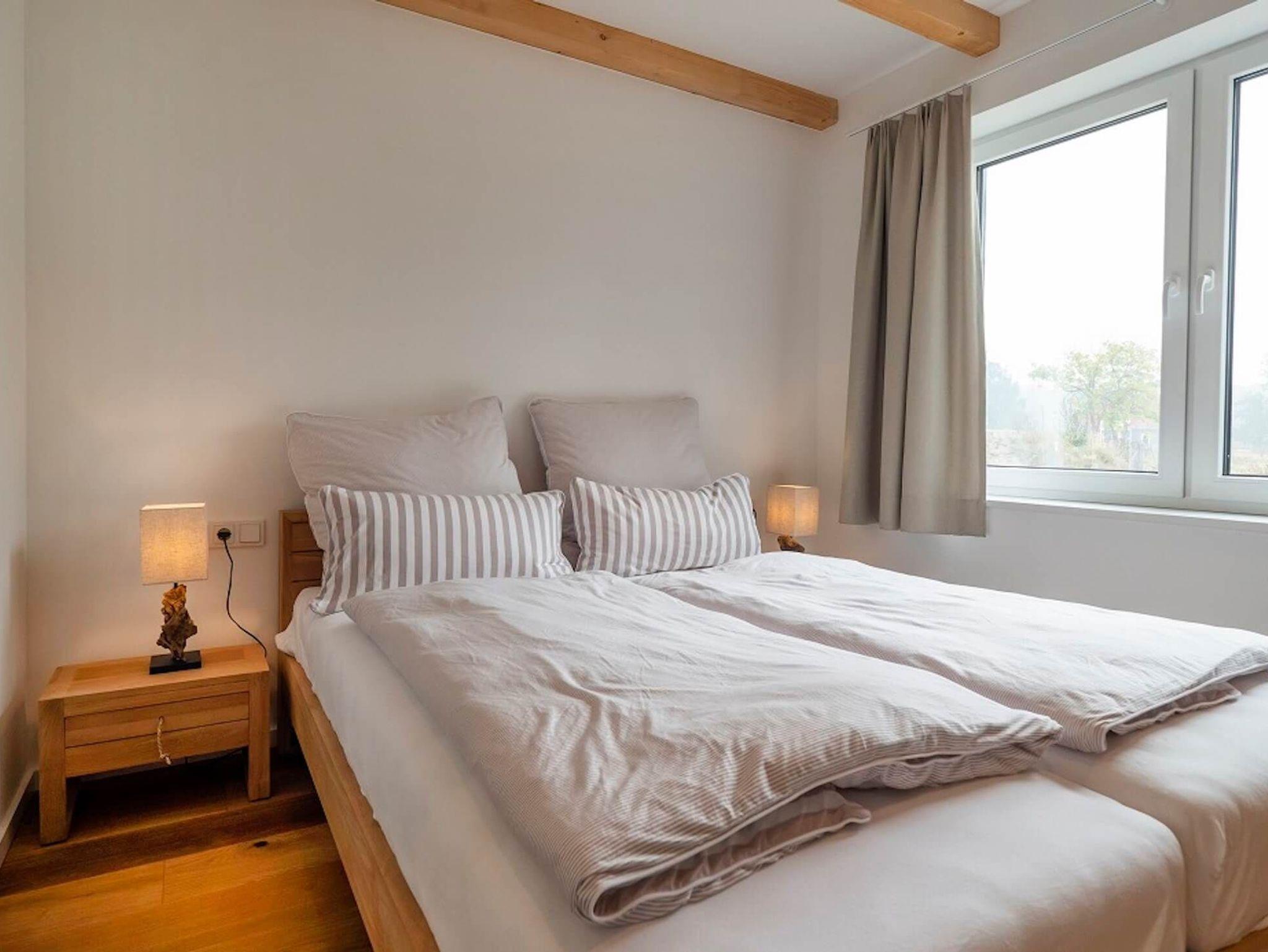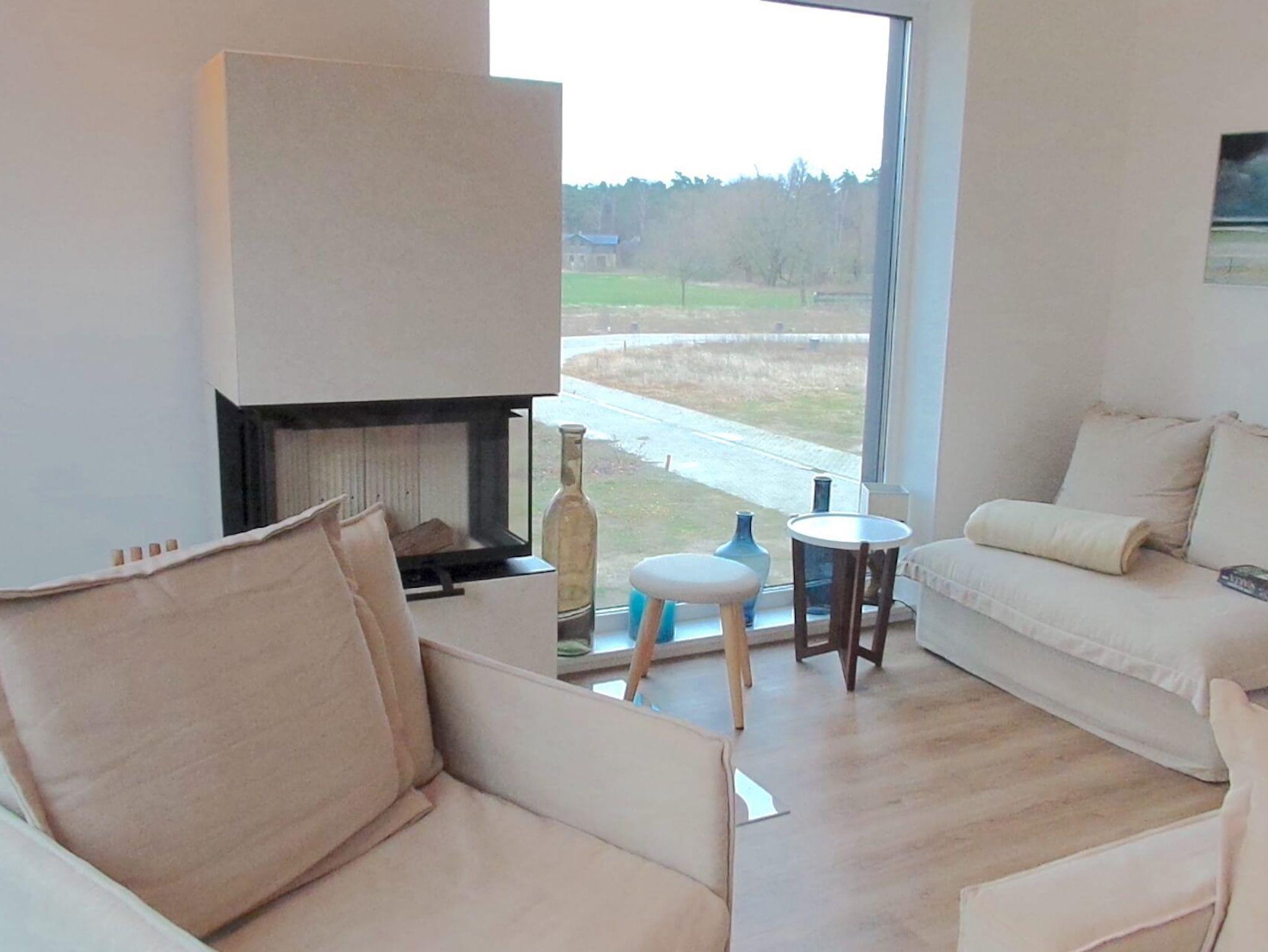 Im Obergeschoß liegt der offene Wohnbereich mit extra angefertigten Sofaelementen und großem Fenster mit Blick auf den Bodden. Hier befindet sich die finnische Sauna mit Extradusche. Danach lädt ein grosser Kamin zum gemütlichen Beisammensein oder zum Zurückziehen ein. Von der Galerie bzw. dem offenen Wohnbereich kommen Sie zum dritten und kleinsten Schlafzimmer. Dieses kann abgedunkelt werden.