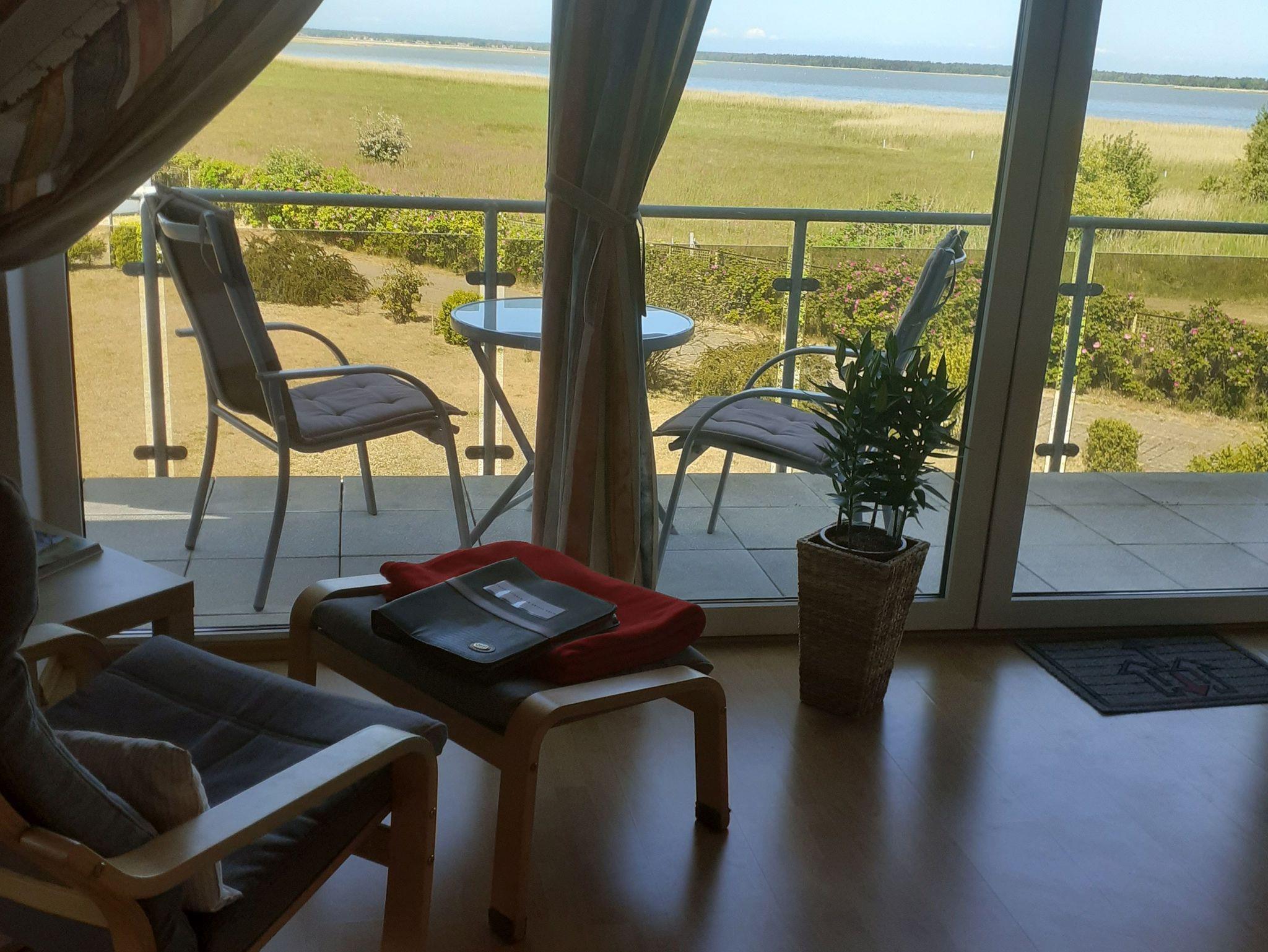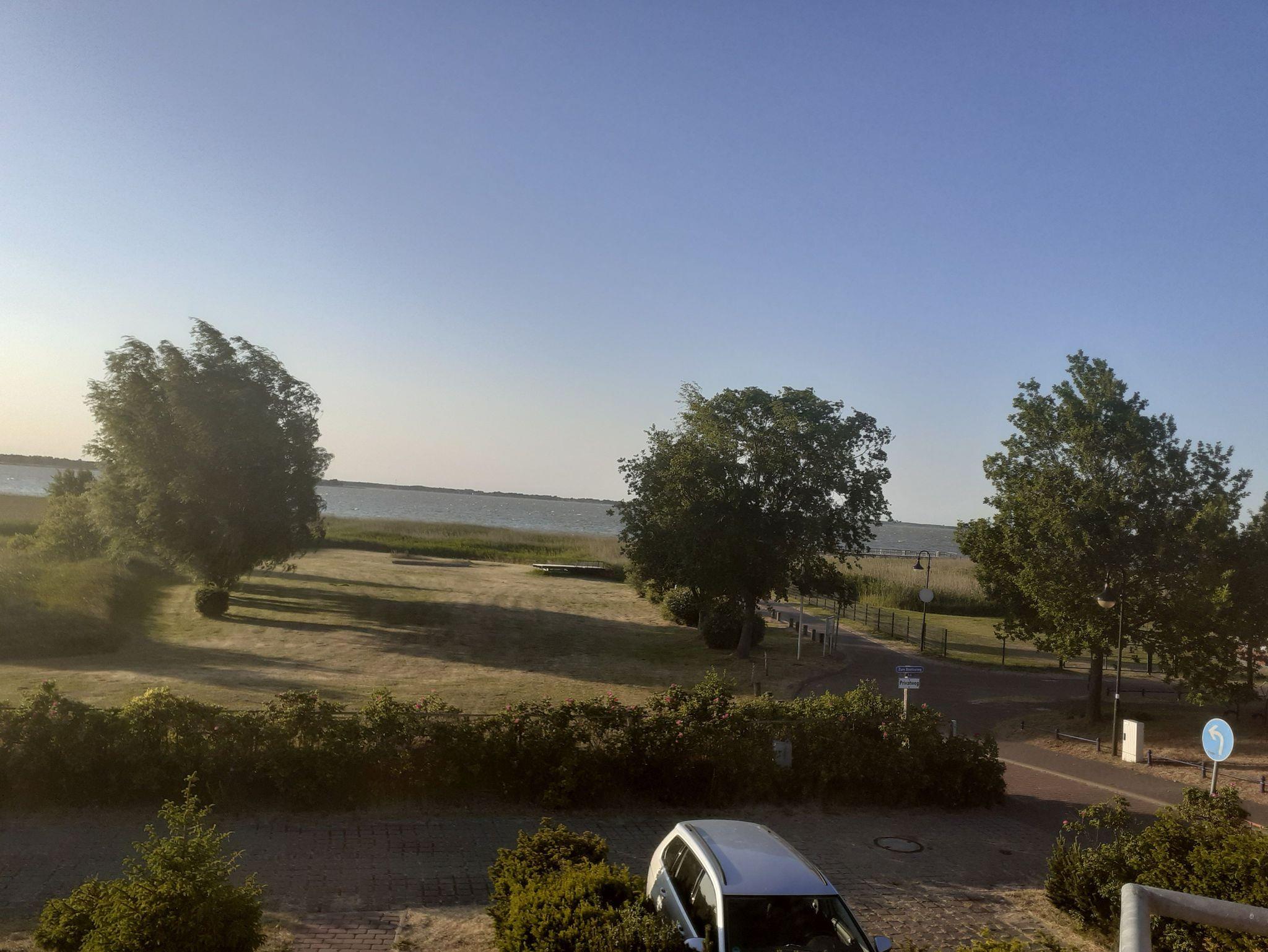 direkt am Bodden ruhige Lage. Vom Balkon hat man einen herrlichen Blick auf den Bodden und den Bootsanleger, der vis-à-vis zu Born liegt. Parkplatz, 4 Fahrräder, Kindersitz, Babybett