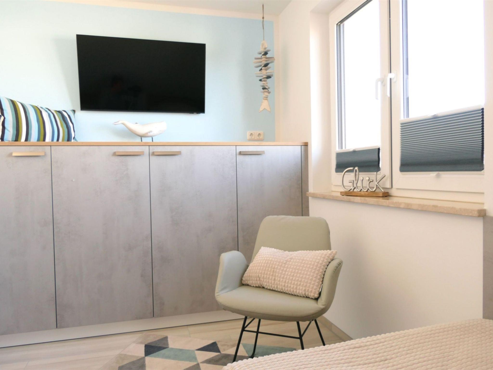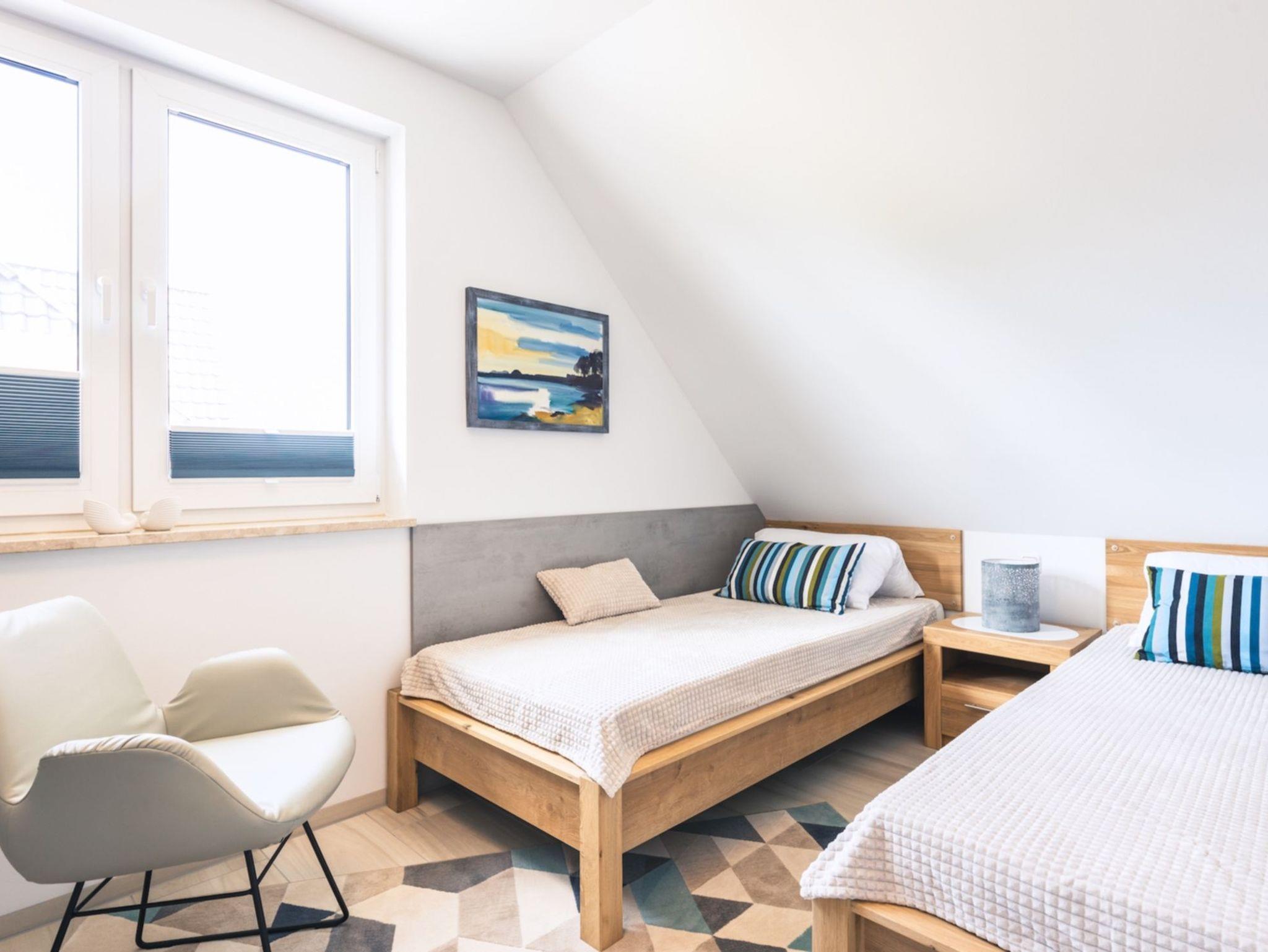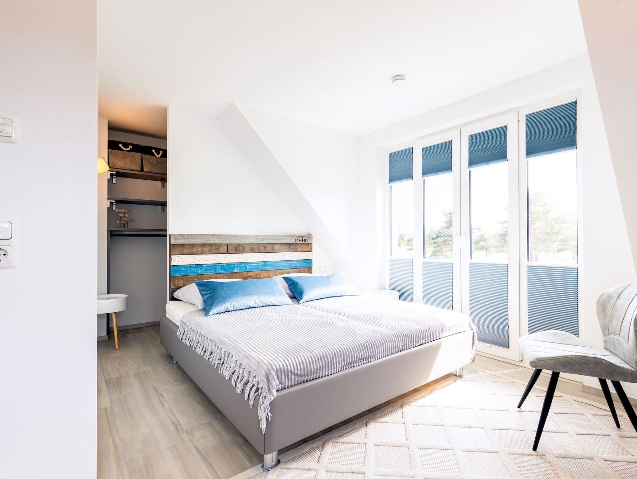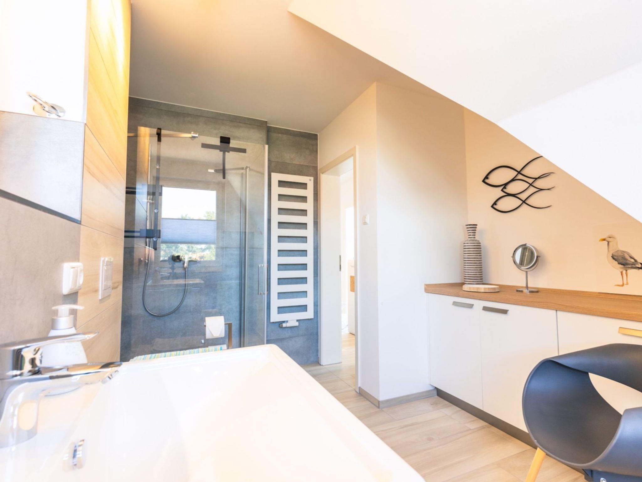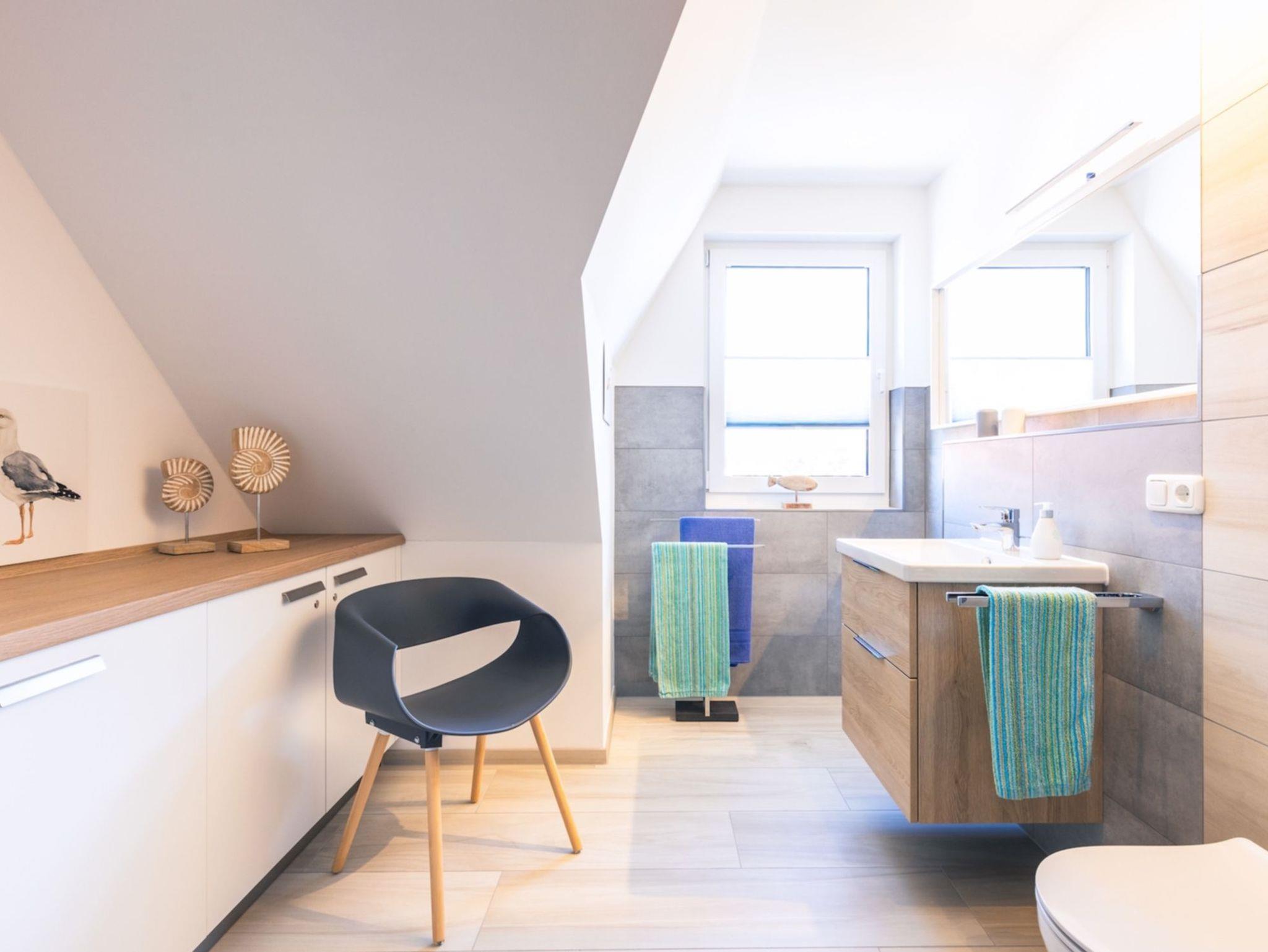 Das Obergeschoss des Hauses verfügt über zwei Schlafzimmer. In dem einen befindet sich ein bequemes, hochwertiges Boxspringbett mit angrenzendem begehbaren Kleiderschrank sowie ein Schreibtisch und Smart-TV. Im zweiten sind zwei Einzelbetten mit Einbauschrank und ebenfalls Smart-TV vorhanden. Das großzügige Badezimmer mit Fenster und ebenerdiger Dusche in moderner Beton-Optik runden den hohen Standard der Unterkunft ab.