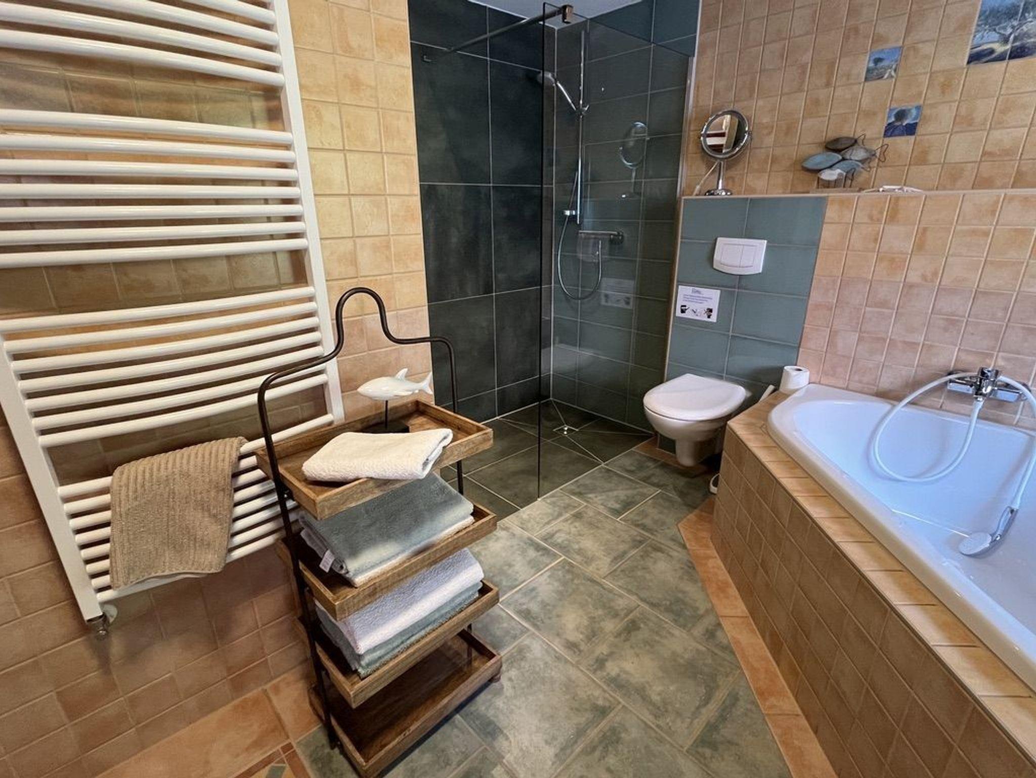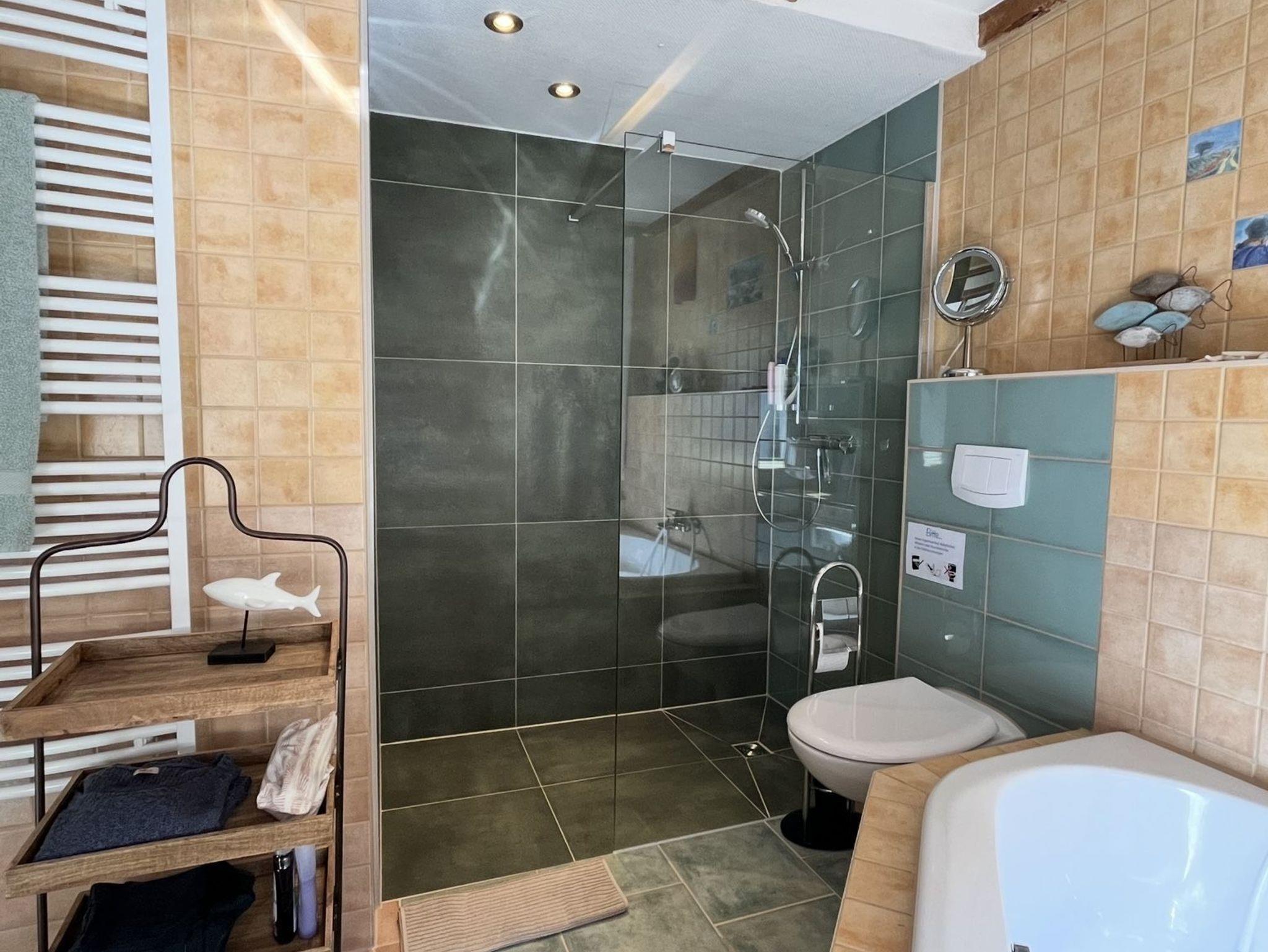 Das großzügige Bad, mit Eckbadewanne und Duschbereich, lädt auch gern zum Wohlfühlen ein.