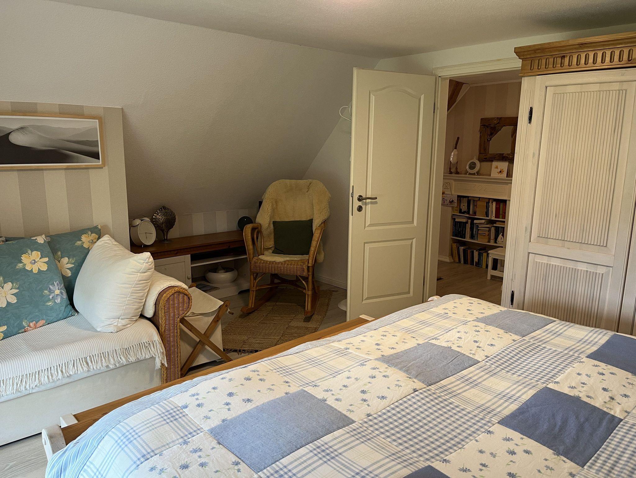 In der oberen Etage befinden sich die 2 Schlafräume mit je einem Doppelbett. Und wenn das einmal nicht reicht, kann in einem Raum eine Aufbettung erfolgen.