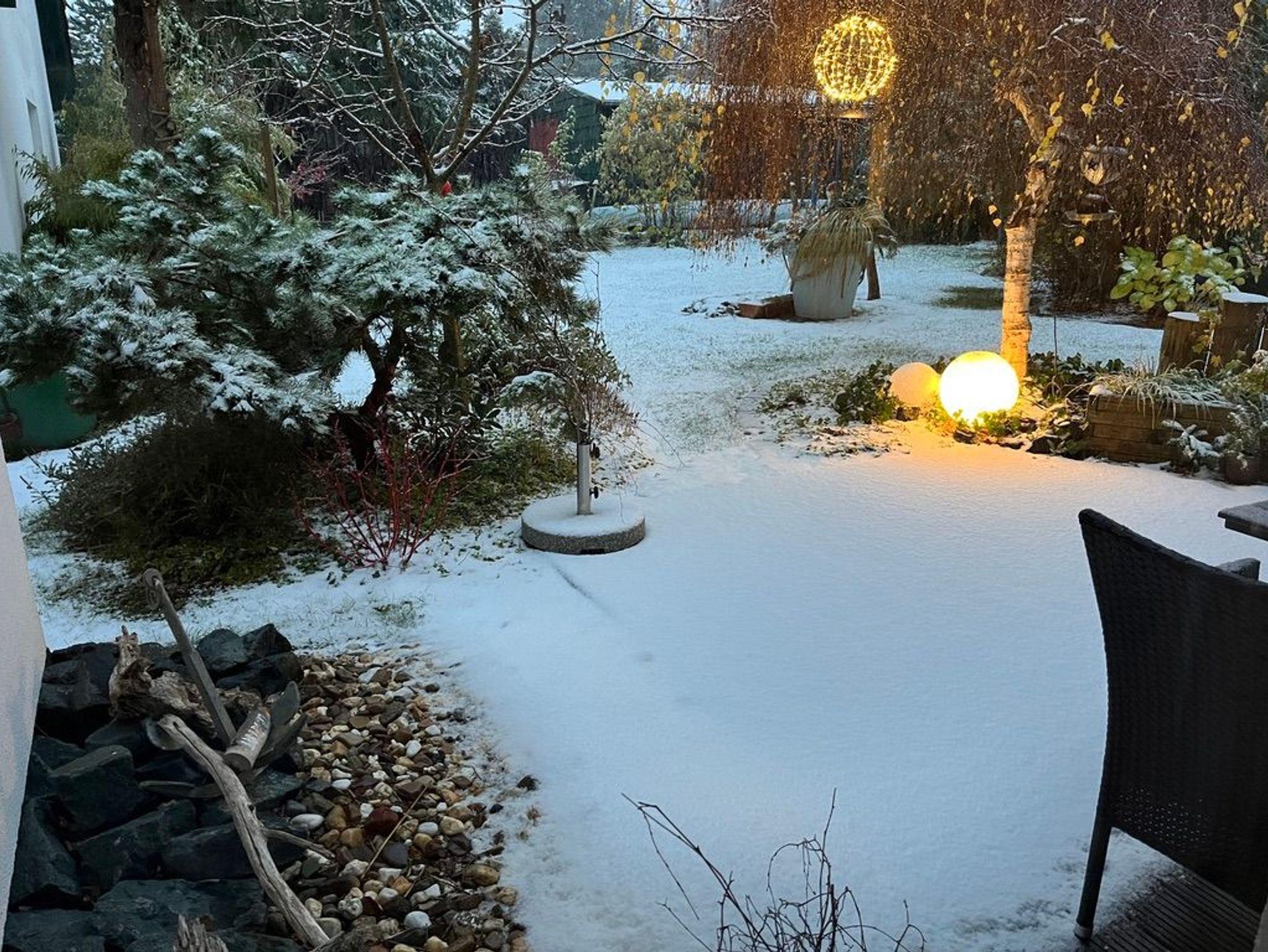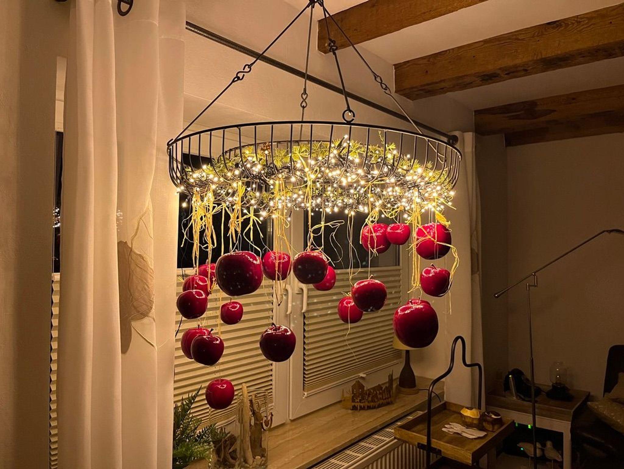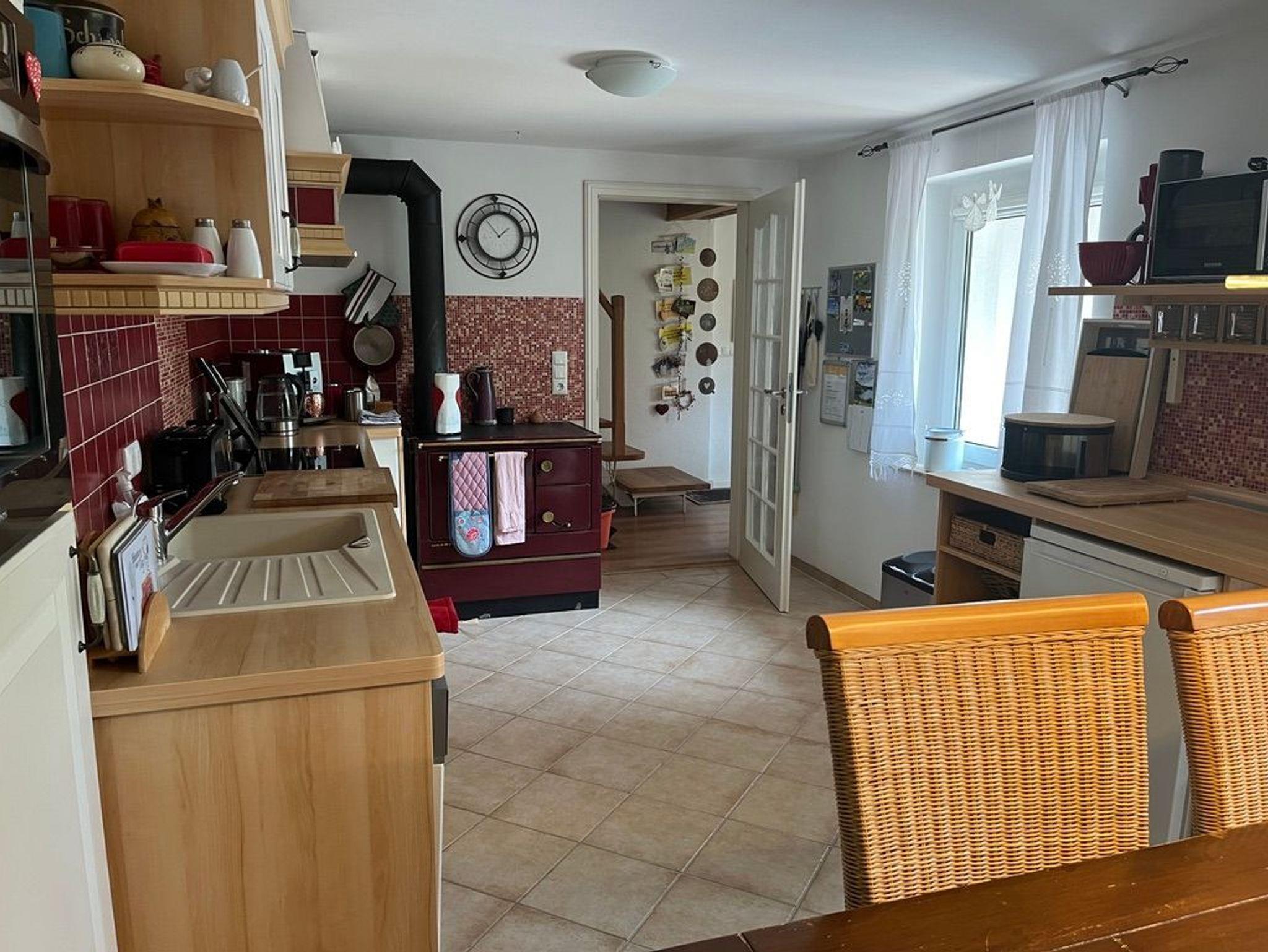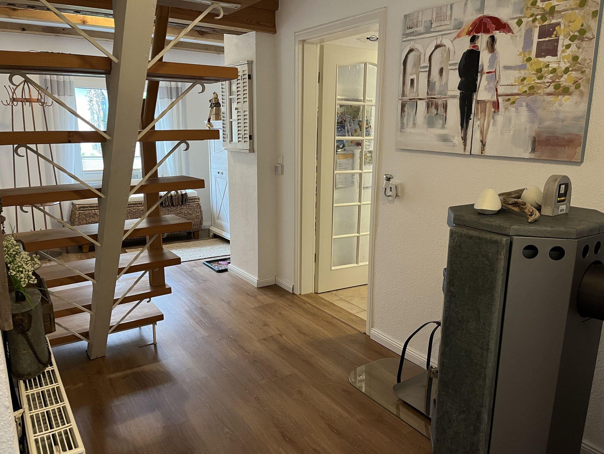 Im Erdgeschoss befindet sich der Wohnbereich mit Kaminofen, die Diele, die Küche und das Bad.