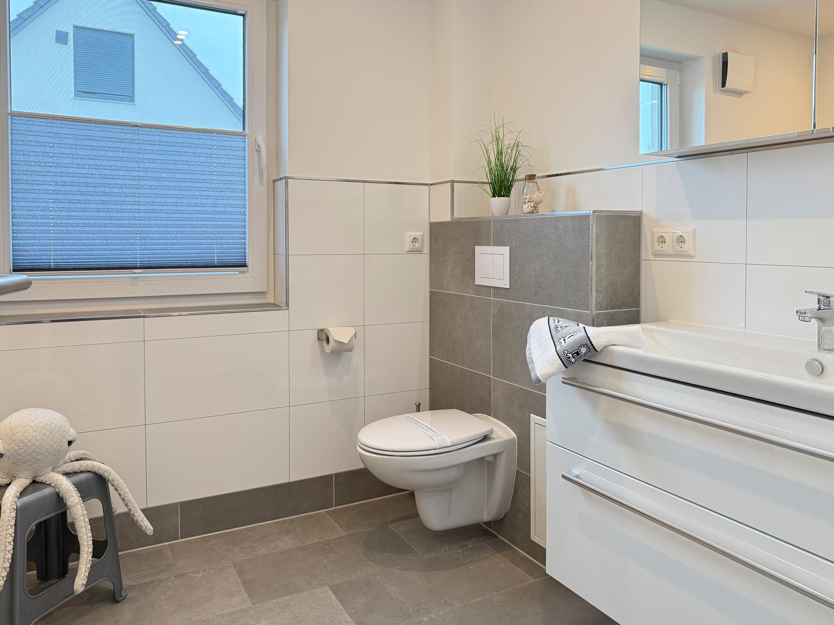 Badezimmer: Zwei moderne Duschbäder mit ebenerdiger Dusche, WC und angenehmer Fußbodenheizung
