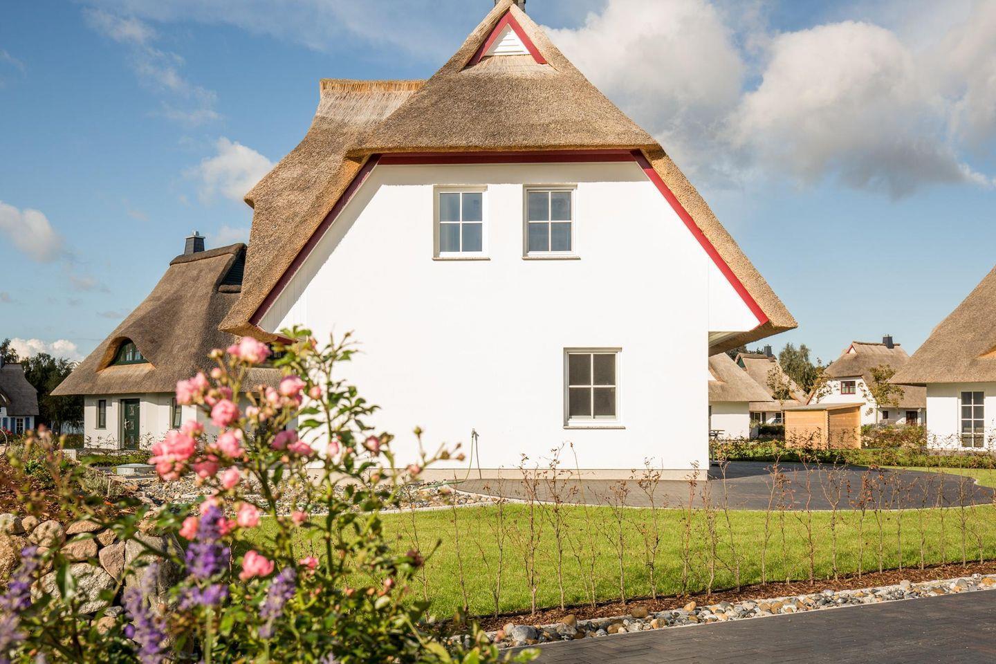 Dieses modern ausgestattete Ferienhaus mit traditionellem Reetdach, ortstypischer Feldsteineinfriedung und 678 m2 großem Grundstück liegt in einer neuen Ferienhausanlage. Es bietet viel Platz für vier Feriengäste (zwei Schlafzimmer mit Doppelbett und TV) und verfügt über einen großzügigen Wohn-Essbereich, ein einladendes Wannen-/Duschbad mit WC und Sauna im OG sowie ein Gäste-WC im EG.