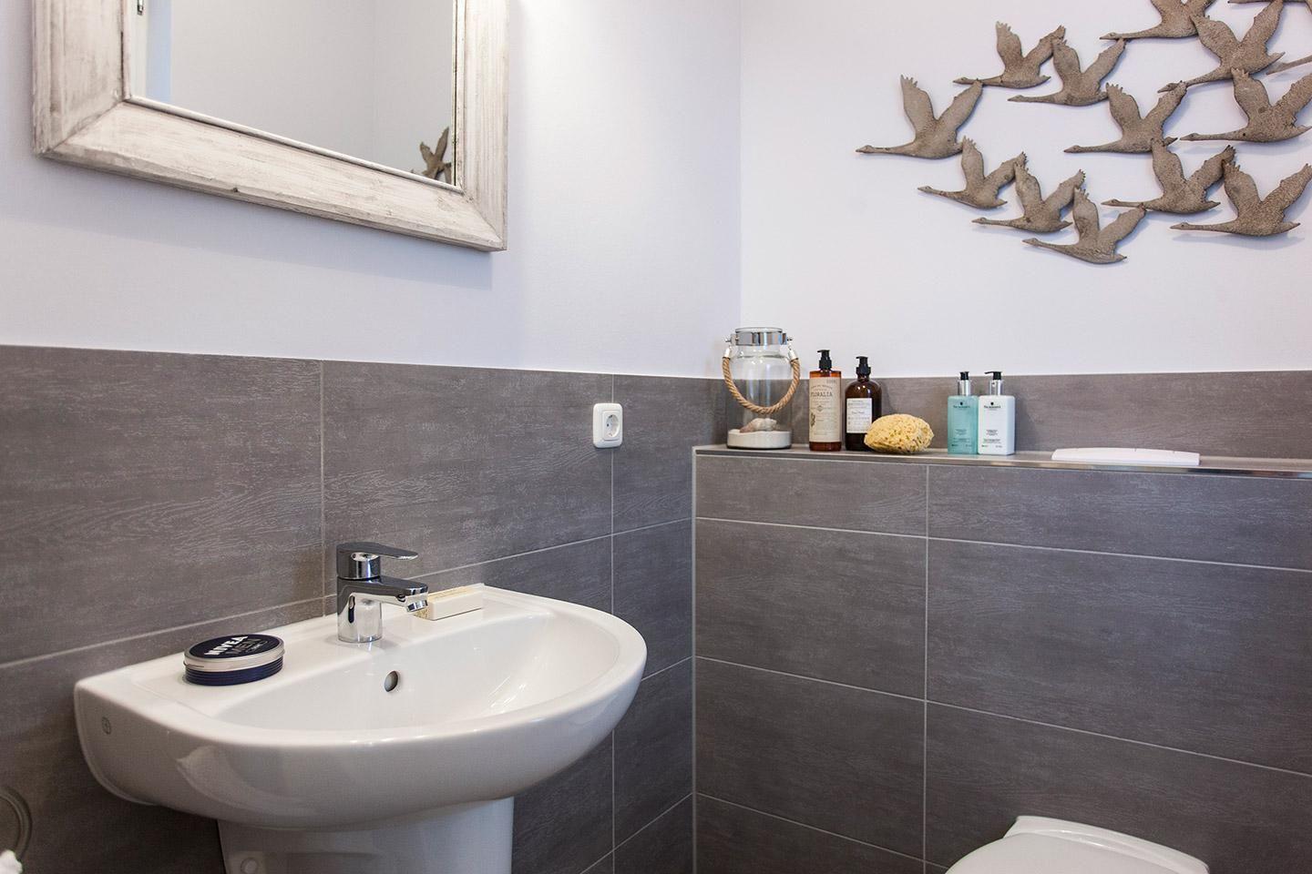 Im EG befindet sich ein ca. 30 qm großer Wohn-Essbereich mit gemütlicher Couch, Kaminofen, SAT-TV mit Sky und neben einer komplett ausgestatteten Küche ist ein Esstisch für 4 Personen vorhanden. Der vorhandene Strandkorb lädt zum Verweilen ein.
