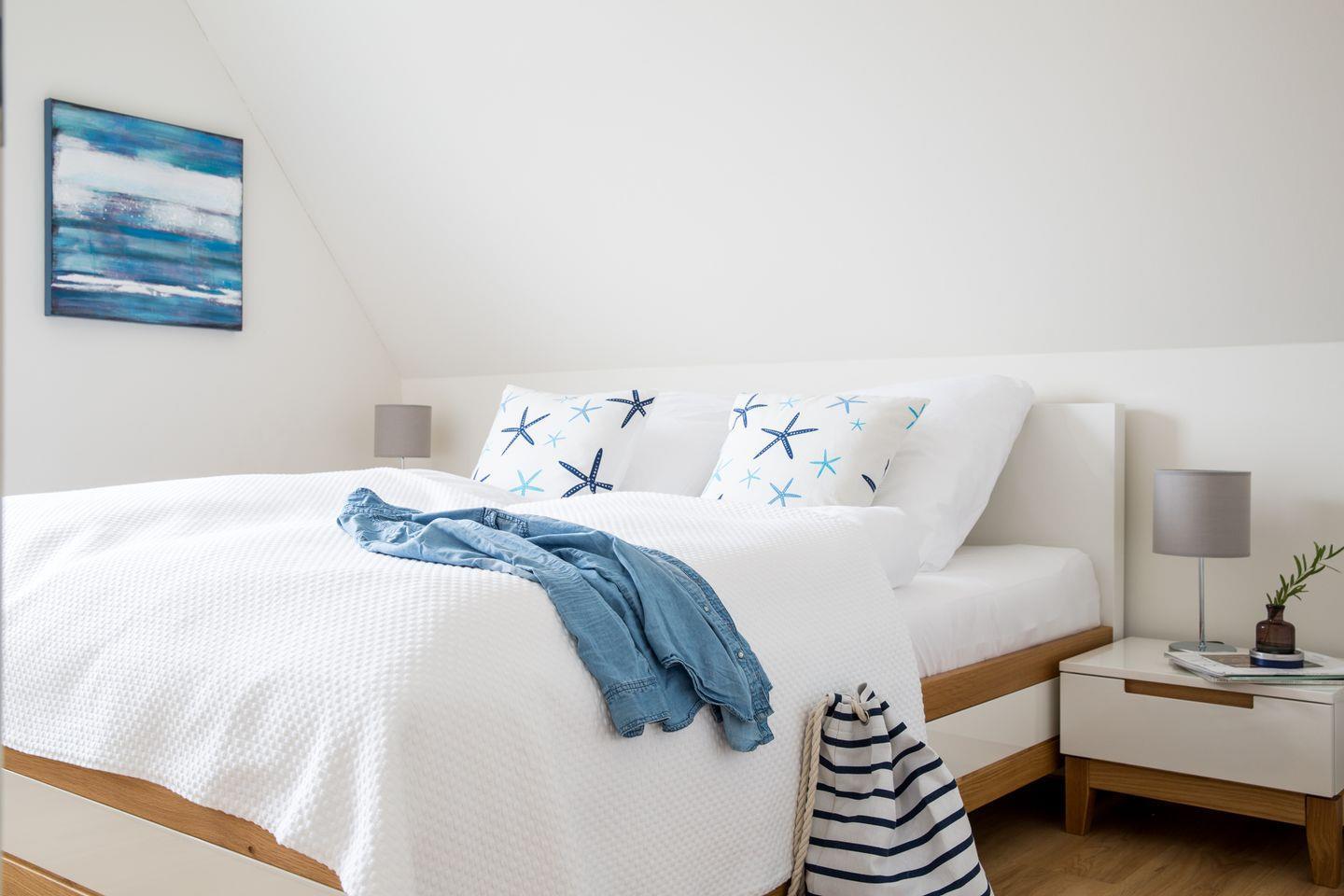 Dieses modern ausgestattete Ferienhaus mit traditionellem Reetdach, Fensterläden, ortstypischer Feldsteineinfriedung und 656 m2 großem Grundstück am Teich liegt in einer neuen Ferienhausanlage. Es bietet viel Platz für vier Feriengäste (zwei Schlafzimmer mit Doppelbett und TV) und verfügt über einen großzügigen Wohn-Essbereich, ein einladendes Wannen-/Duschbad mit WC und Sauna im OG sowie ein Gäste-WC im EG.