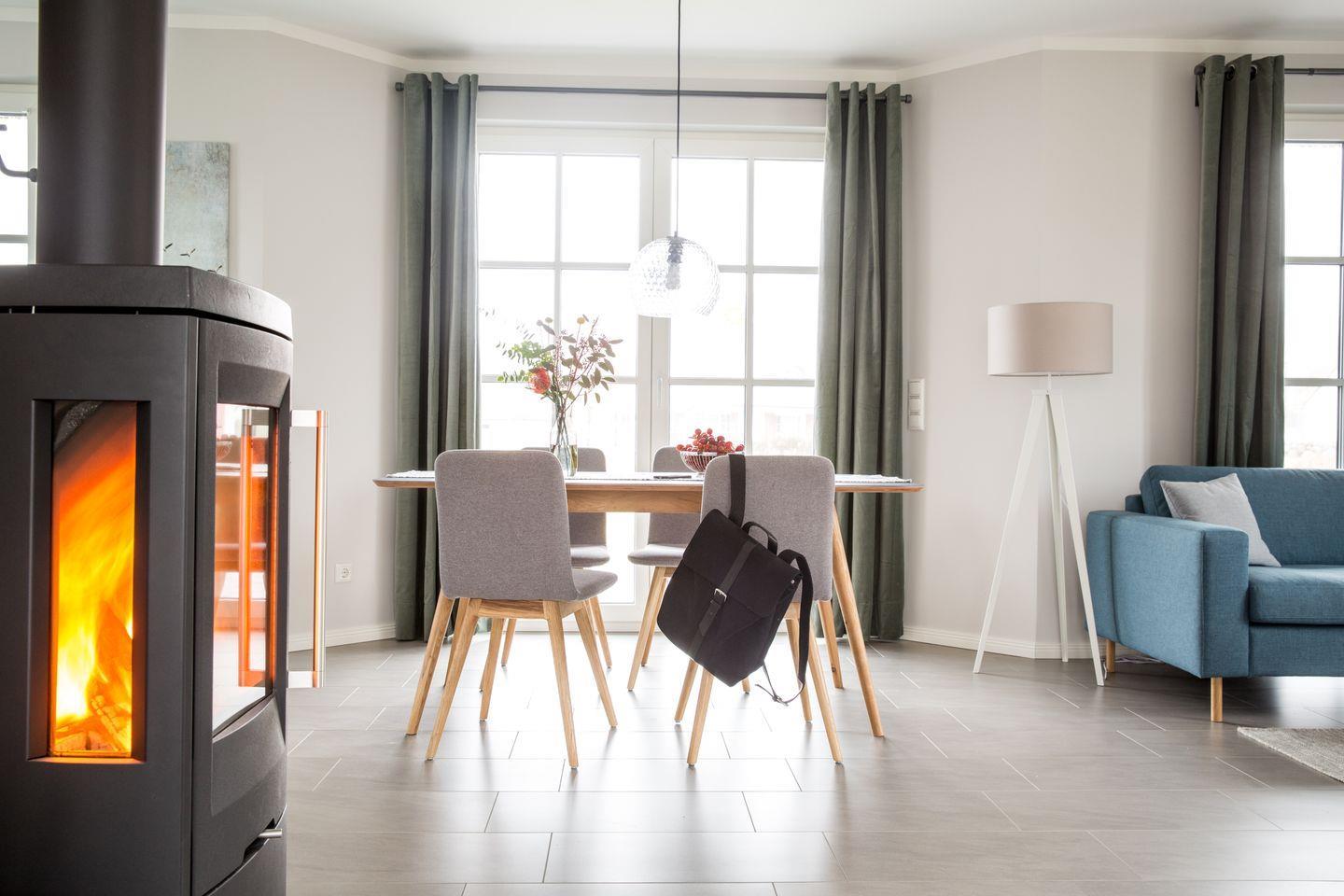 Im EG befindet sich ein ca. 30 qm großer Wohn-Essbereich mit gemütlicher Couch, Kaminofen, SAT-TV mit Sky und neben einer komplett ausgestatteten Küche ist ein Esstisch für 4 Personen vorhanden.