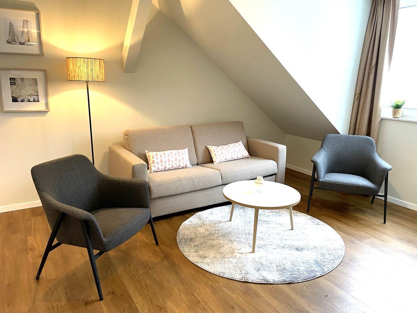 Das komfortable Appartement bietet auf 56 qm viel Platz für bis zu 4 Personen. Der Wohnbereich besitzt ein gemütliches Schlafsofa, welches sich mit wenigen Handgriffen zu einer Doppelschlafcouch (1,40m x 2,00m) umfunktionieren lässt, und sorgt mit einem Flat Screen-TV für reichlich Entertainment.
