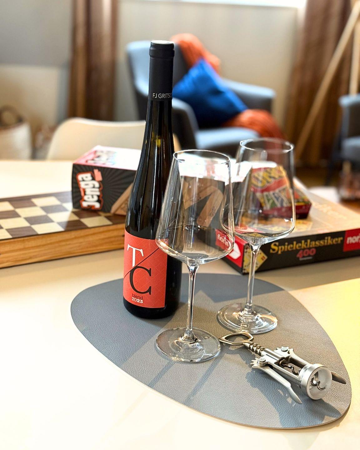 Die offene Pantryküche mit anliegendem Essbereich bietet Ihnen eine hochwertige Ausstattung mit Geschirrspüler, Kühlschrank mit Gefrierfach, Weinkühlschrank, Kaffeemaschine, 2-Platten-Ceranfeld, Wasserkocher, Airfryer sowie umfangreichem Küchenzubehör – ideal, um auch im Urlaub kulinarische Highlights zu zaubern.
