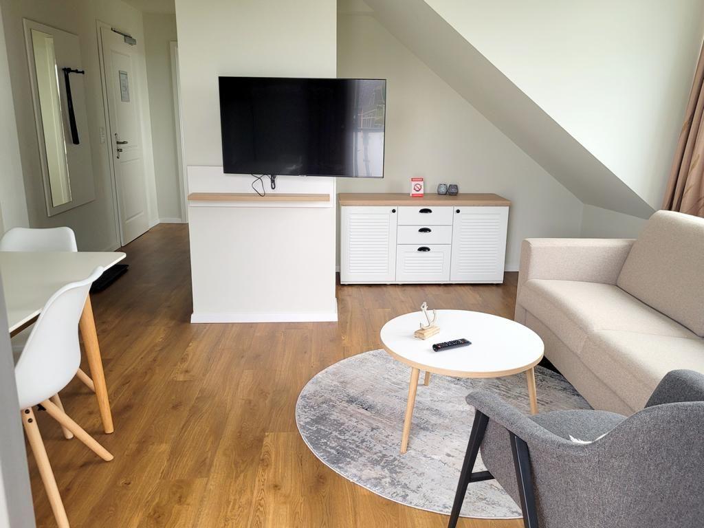 Das komfortable Appartement bietet auf 42 qm viel Platz für bis zu 4 Personen. Der gemütliche Wohnbereich besitzt ein bequemes Sofa, welches sich mit wenigen Handgriffen zu einer Doppelschlafcouch (1,40m x 2,00m) umfunktionieren lässt, und sorgt mit einem Flat Screen-TV für reichlich Entertainment.
