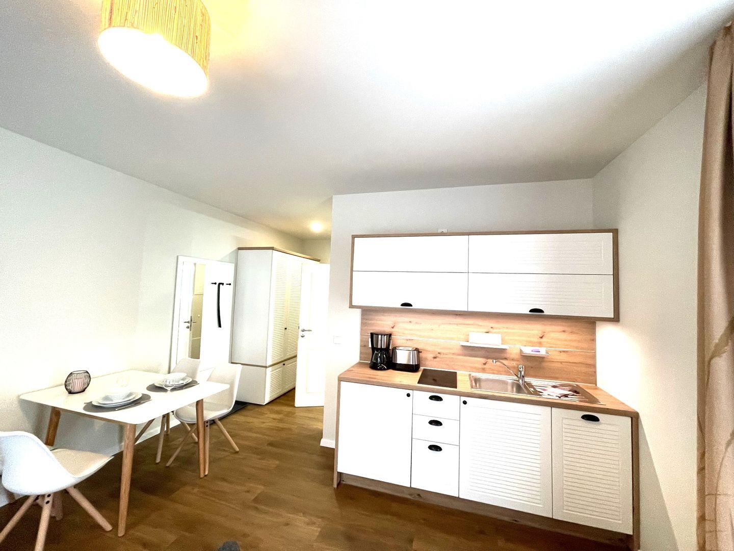 Die offene Pantryküche mit anliegendem Essbereich bieten Ihnen einen Geschirrspüler, Kühlschrank mit Gefrierfach, Kaffeemaschine, 2-Platten-Ceranfeld und Wasserkocher.