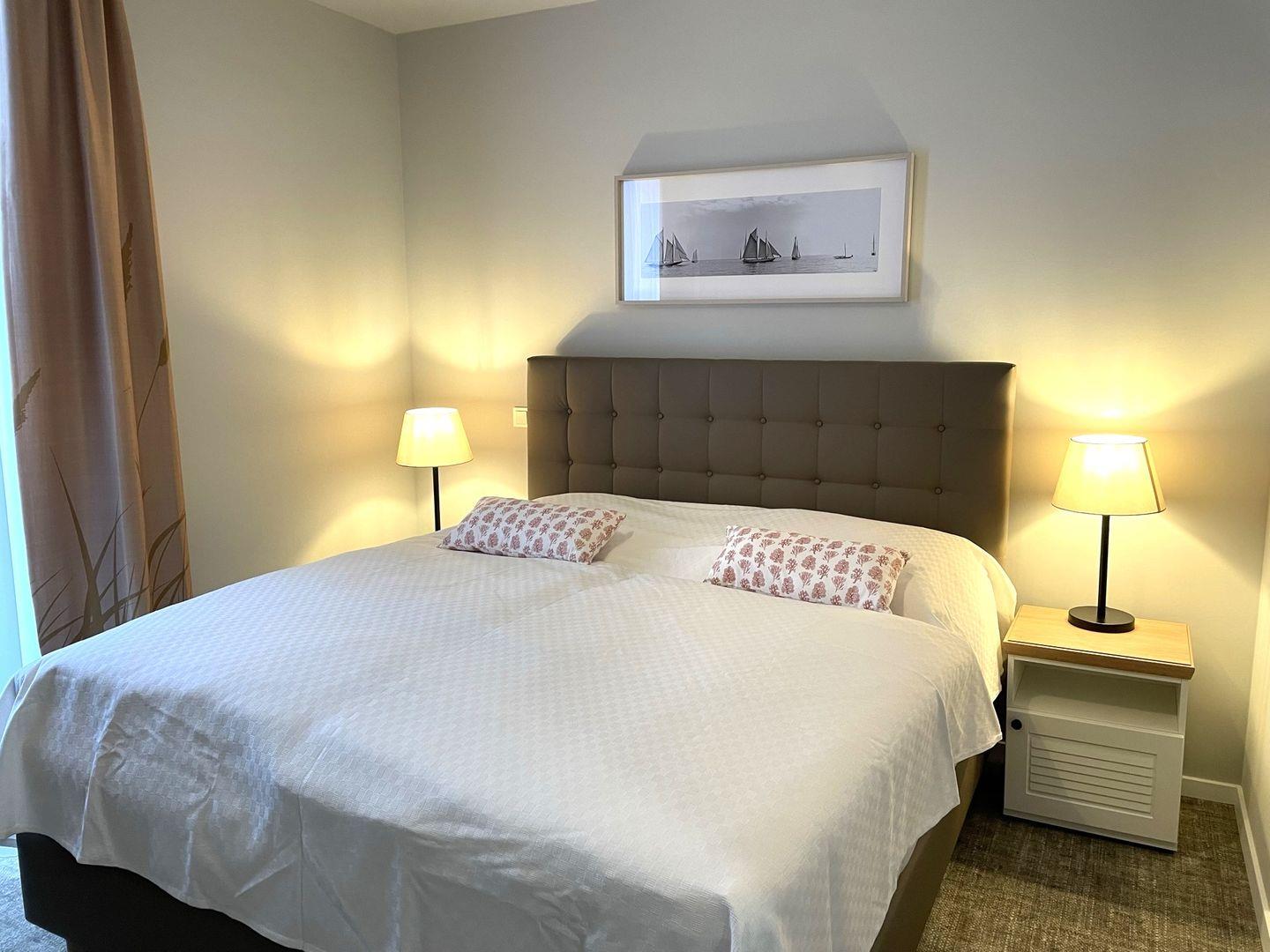 Das Schlafzimmer bietet ein modernes Doppelbett (1,80m x 2,00m), auf welchem Sie süße Träume haben werden. Ein Kinderbett sowie ein Hochstuhl können auf Anfrage hinzugebucht werden.