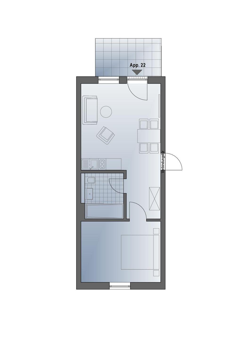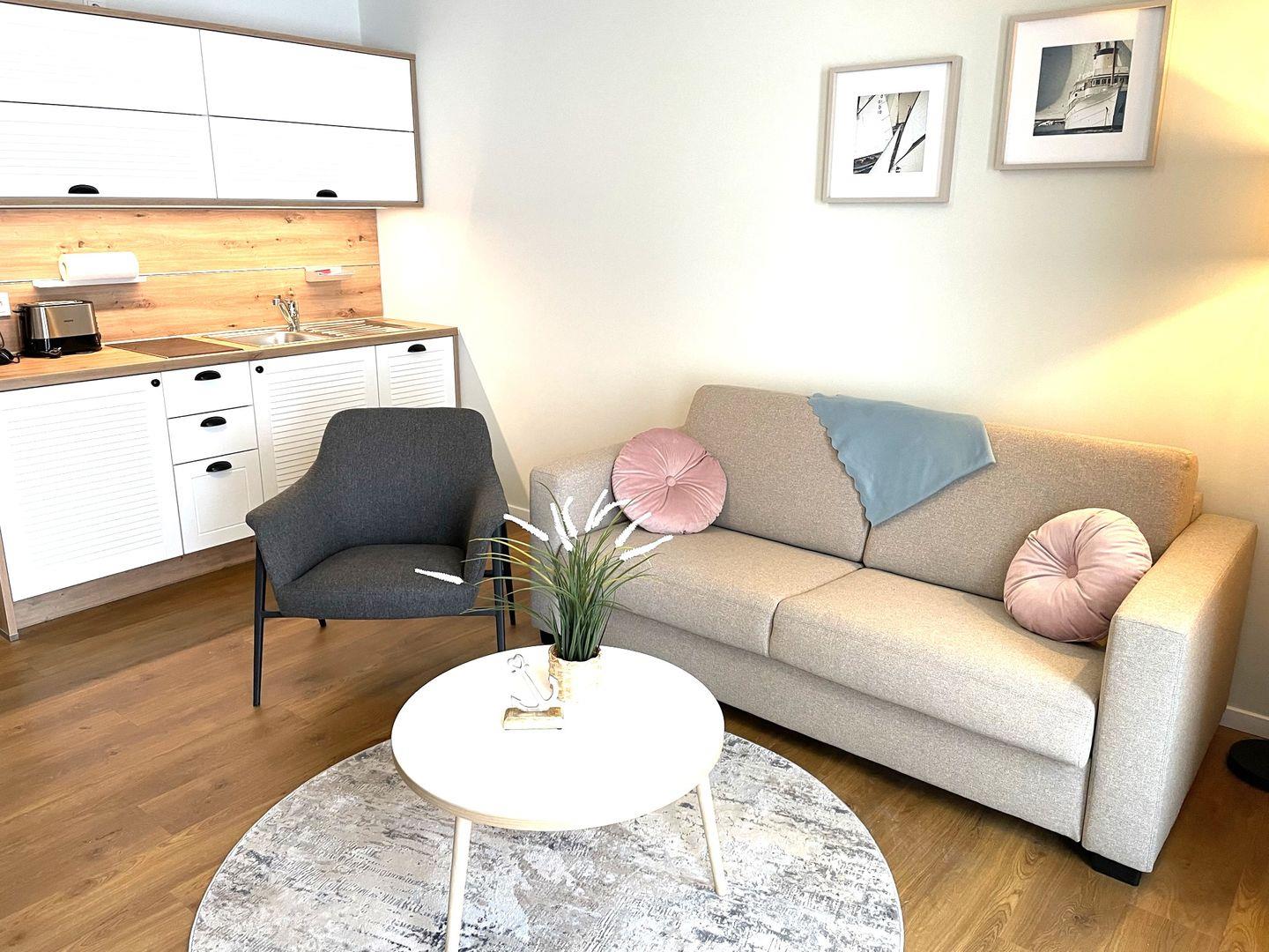 Das komfortable Appartement bietet auf 44 qm viel Platz für bis zu 4 Personen und in Kombination mit dem Appartement 23 auf 8 Personen (Verbindungstür) erweiterbar. Der gemütliche Wohnbereich besitzt ein bequemes Sofa, welches sich mit wenigen Handgriffen zu einer Doppelschlafcouch (1,40m x 2,00m) umfunktionieren lässt, und sorgt mit einem Flat Screen-TV für reichlich Entertainment.