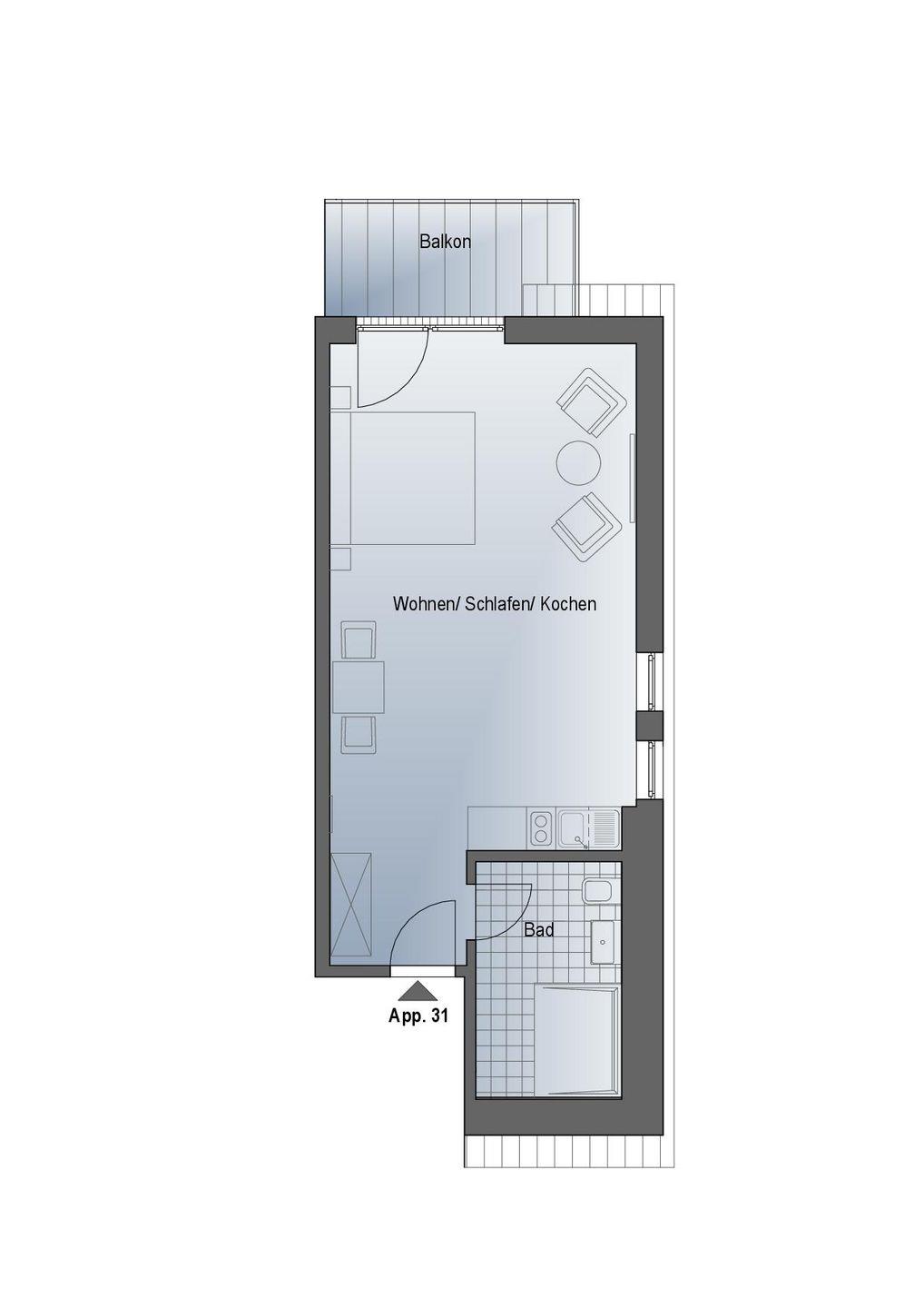 Das komfortable Appartement bietet auf 40 qm Platz für bis zu 2 Personen. Der gemütliche Wohn- und Schlafbereich besitzt ein modernes Doppelbett (1,80m x 2,00m), auf welchem Sie Ihre Erholung finden werden. Zu Ihrem Entertainment dient ein moderner Flatscreen-TV. Ein Kinderbett sowie ein Hochstuhl können auf Anfrage hinzugebucht werden.