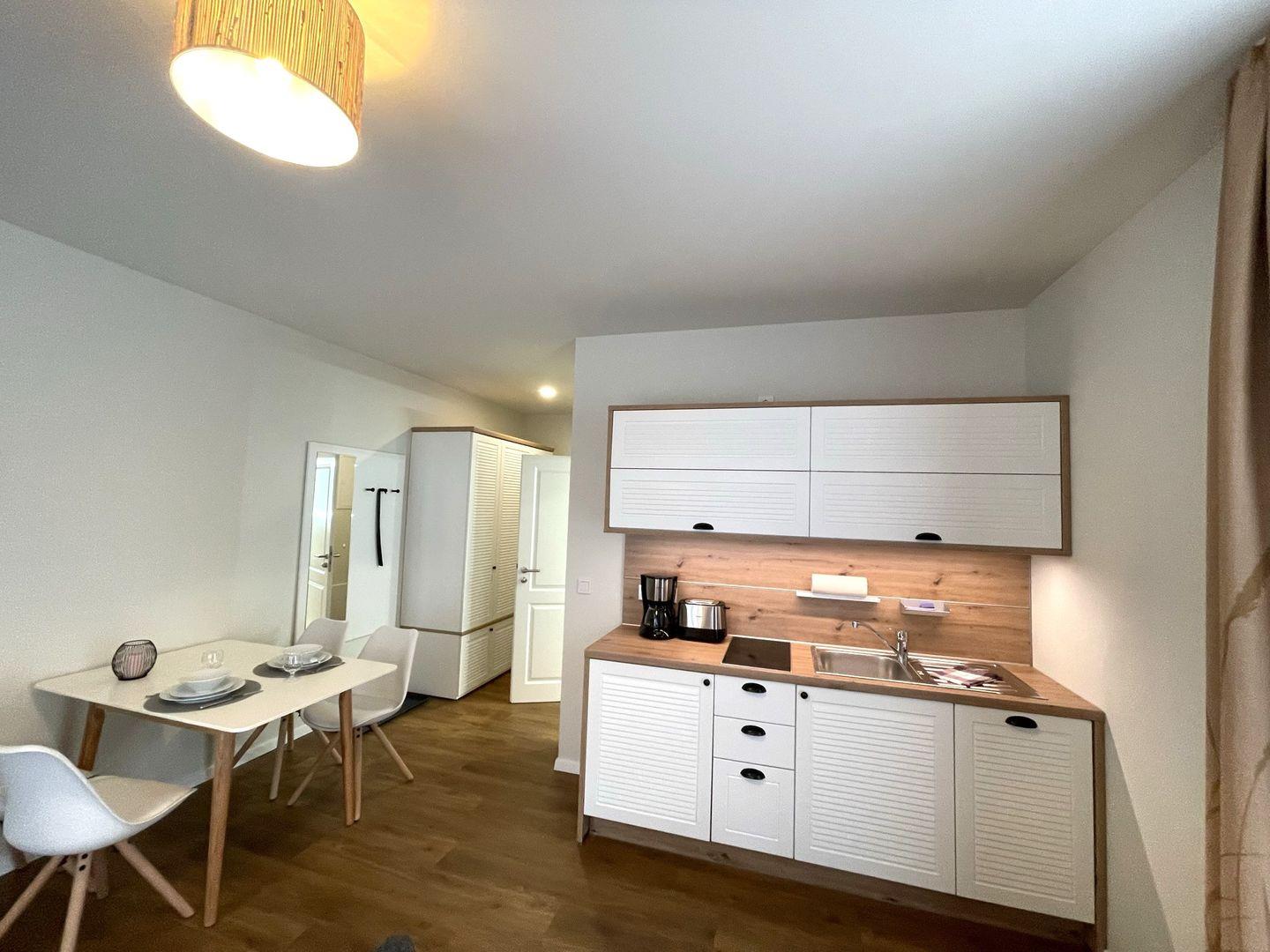 Die offene Pantryküche mit anliegendem Essbereich bieten Ihnen einen Geschirrspüler, Kühlschrank mit Gefrierfach, Kaffeemaschine, 2-Platten-Ceranfeld und Wasserkocher.