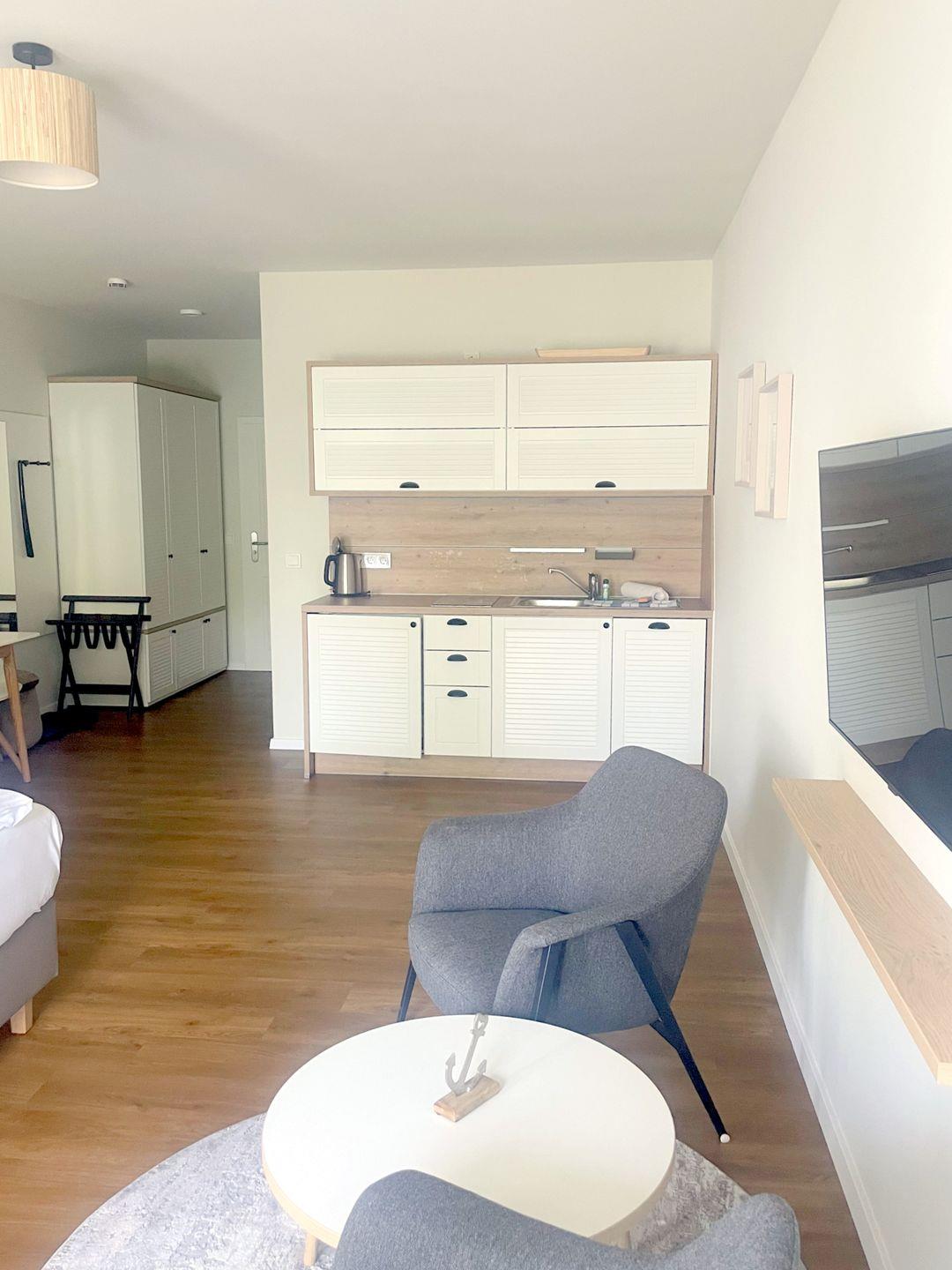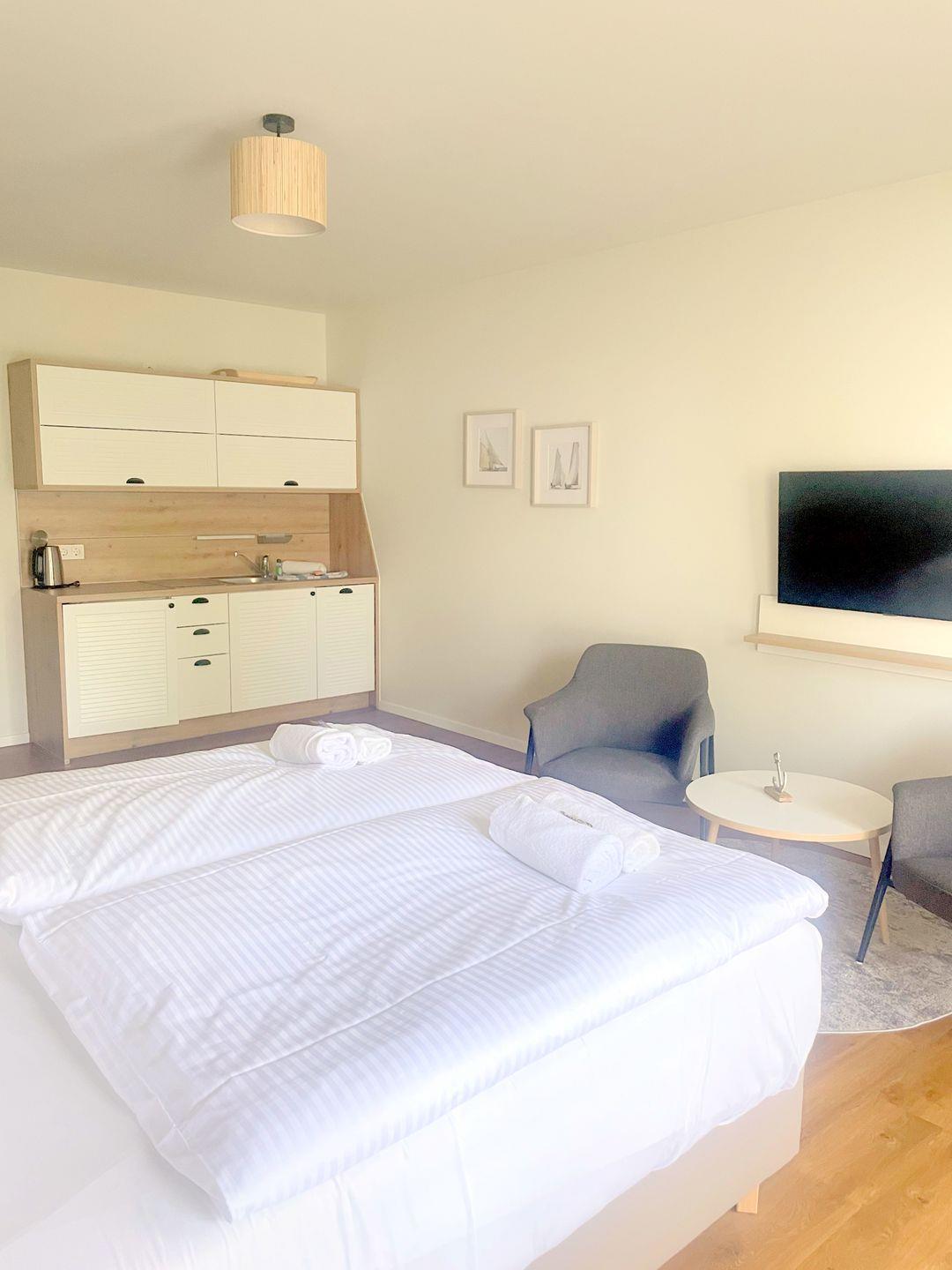 Das komfortable Appartement bietet auf 37 qm Platz für bis zu 2 Personen oder auch junge Familien mit Baby. Der gemütliche Wohn- und Schlafbereich besitzt ein modernes Doppelbett (1,80m x 2,00m), auf welchem Sie Ihre Erholung finden werden. Zu Ihrem Entertainment dient ein moderner Flatscreen-TV. Ein Kinderbett sowie ein Hochstuhl können auf Anfrage hinzugebucht werden. Natürlich können Sie auch gern Ihr eigenes Reisebett mitbringen.