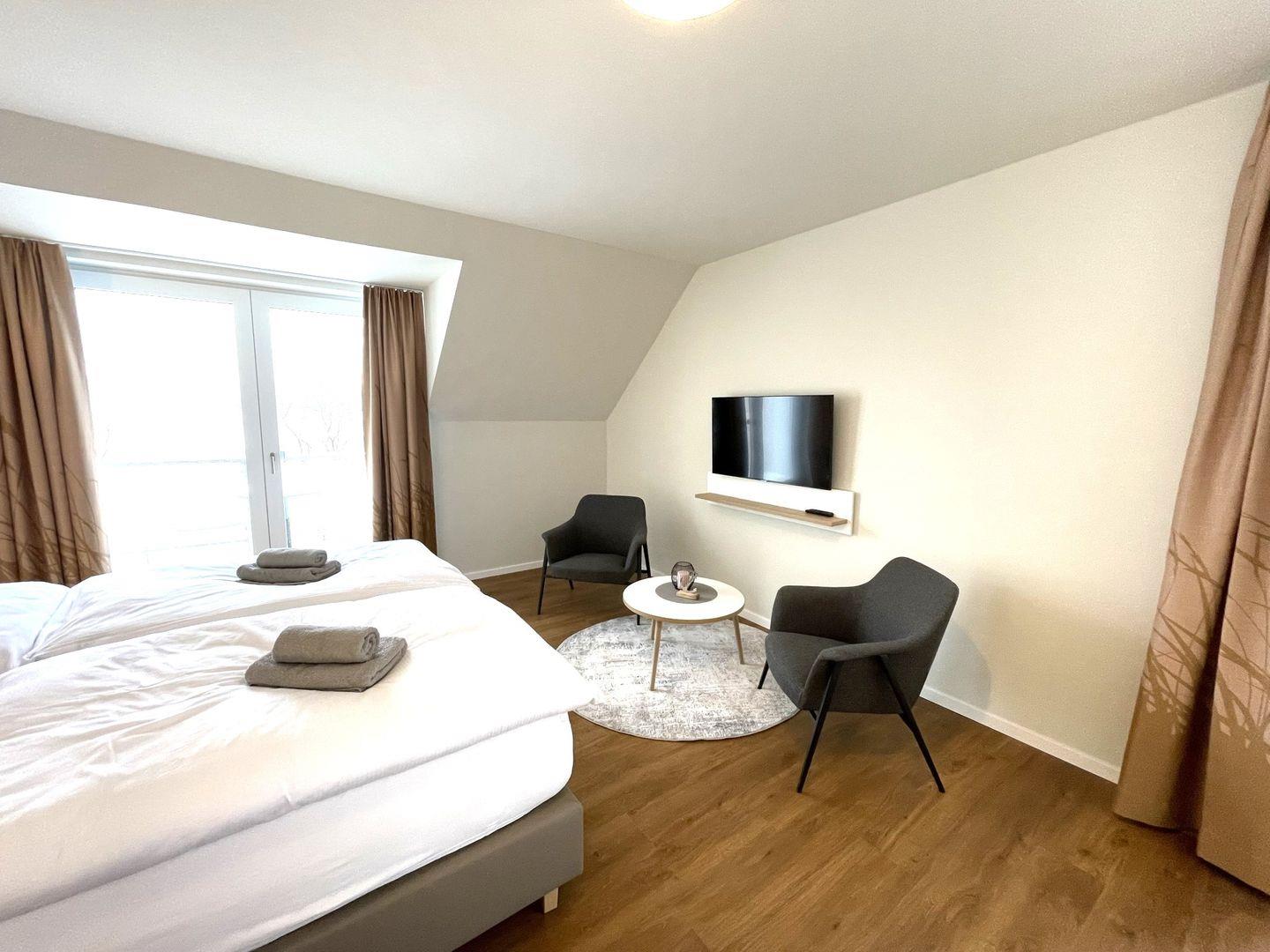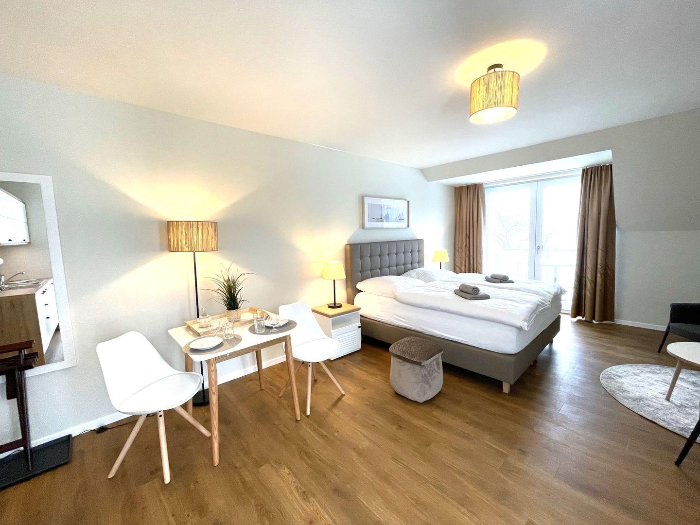 Das komfortable Appartement bietet auf 37 qm Platz für bis zu 2 Personen. Der gemütliche Wohn- und Schlafbereich besitzt ein modernes Doppelbett (1,80m x 2,00m), auf welchem Sie Ihre Erholung finden werden. Zu Ihrem Entertainment dient ein moderner Flatscreen-TV. Ein Kinderbett sowie ein Hochstuhl können auf Anfrage hinzugebucht werden.