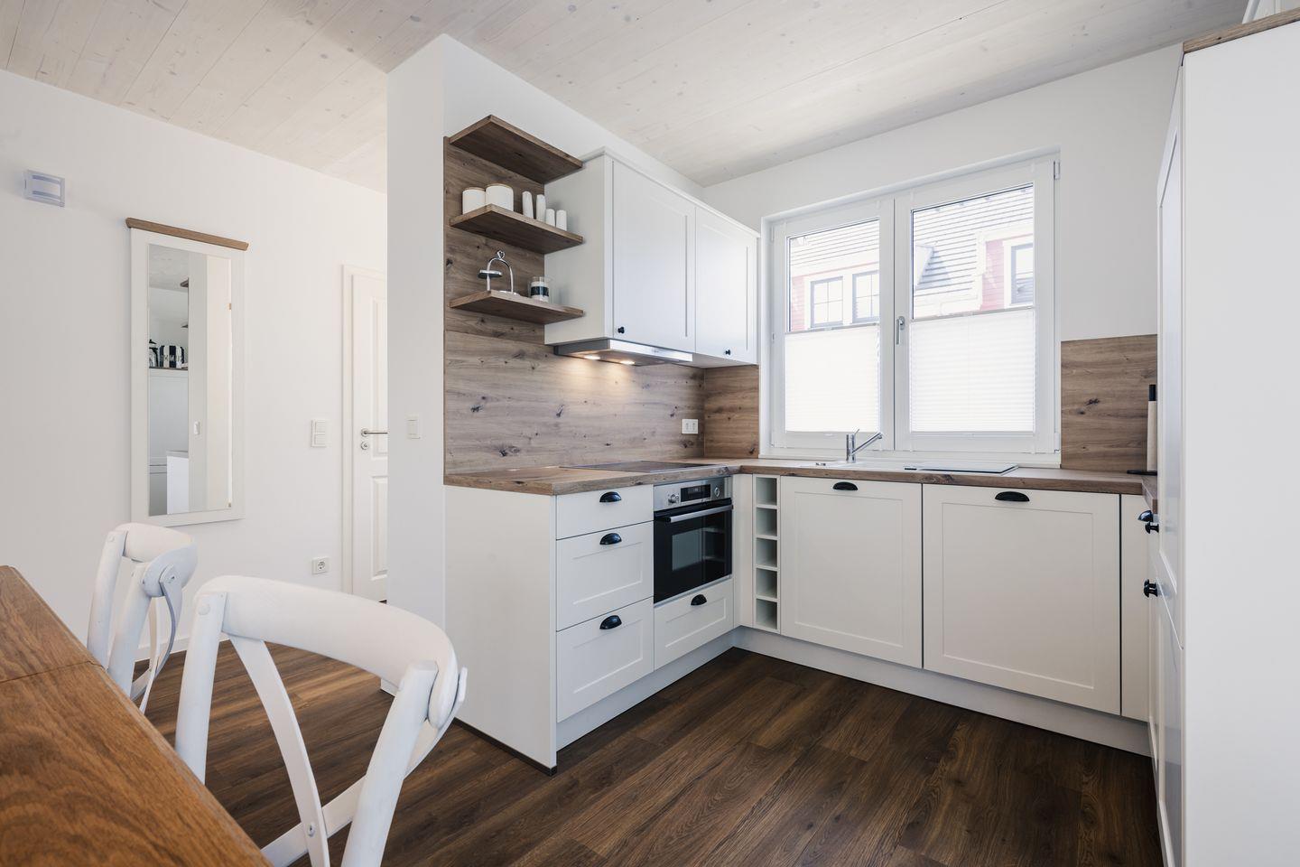 Die offene Küchenzeile mit anliegendem Essbereich ist mit einen Geschirrspüler, Mikrowelle, Kühlschrank mit Gefrierfach, Kaffeemaschine, 4-Platten-Ceranfeld, Backofen und Wasserkocher ausgestattet. Natürlich finden Sie hier auch Geschirr und Besteck sowie weitere Küchengeräte und Utensilien.