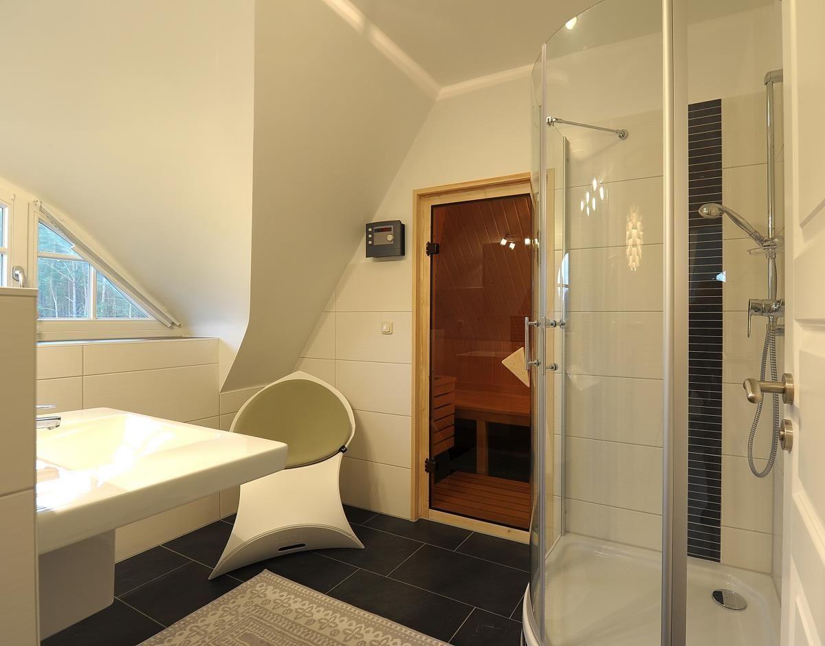 Das Obergeschoss überrascht Sie mit einem großzügigen Schlafzimmer, das unter anderem aus einem Eckbereich mit komfortablem Doppelbett und Beistelltisch besteht. Ein kleiner Sekretär mit Stuhl bietet ein ruhiges Plätzchen zum Schreiben. Der Sitzbereich verwöhnt Sie mit 2 Sesseln, einem außergewöhnlichen Tisch, geräumigen Sideboards und einem TV in 3 D mit Blue Ray Player und rundet das Raumangebot ab. Ein weiteres Schlafzimmer ist mit einem Doppelbett, Kleiderschrank ausgestattet. Im Obergeschoss befinden sich außerdem ein Gäste-WC und ein weiteres Bad mit Dusche, Waschbecken, Ruhesessel und einem Zugang zur Sauna (Nutzung kostenlos).