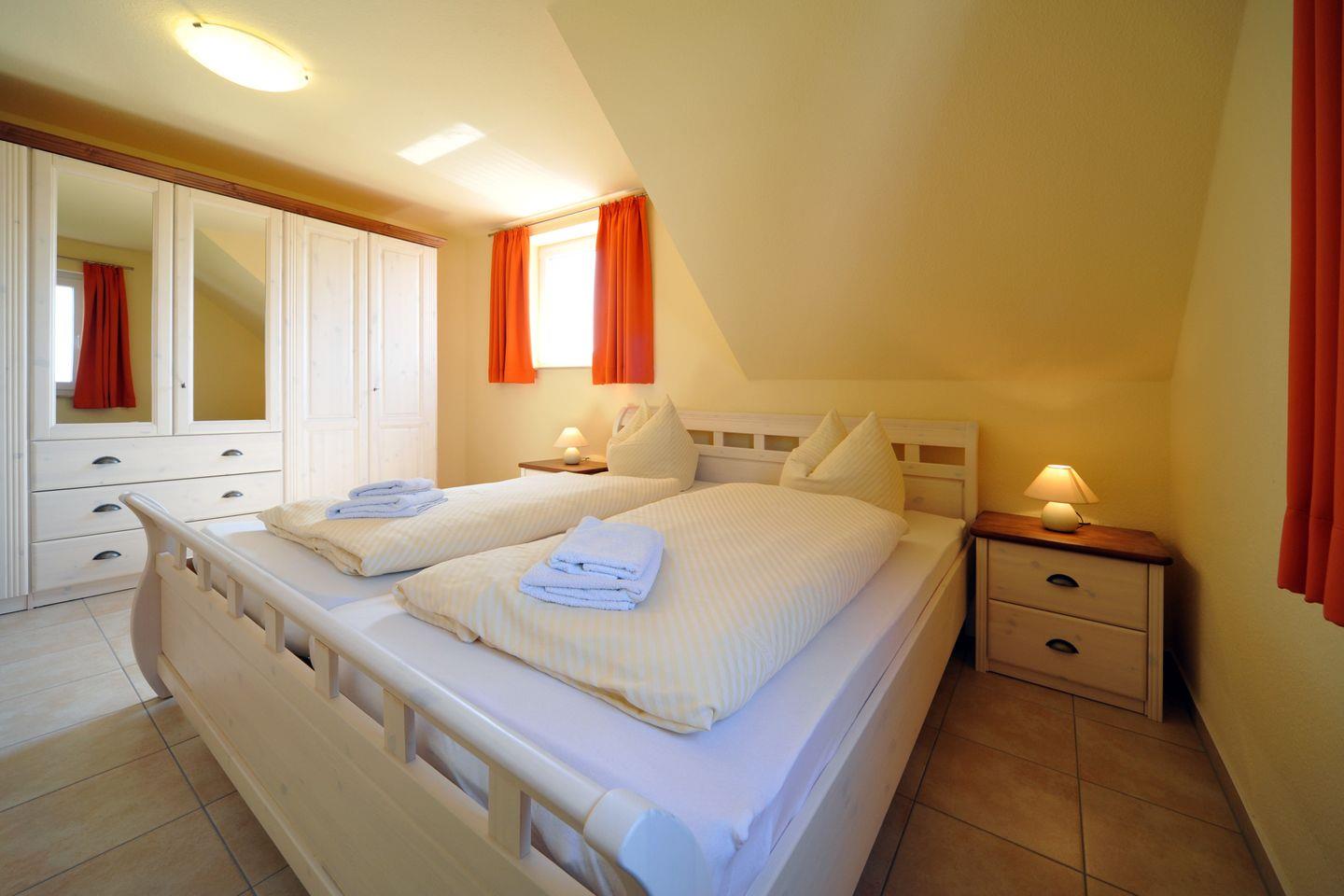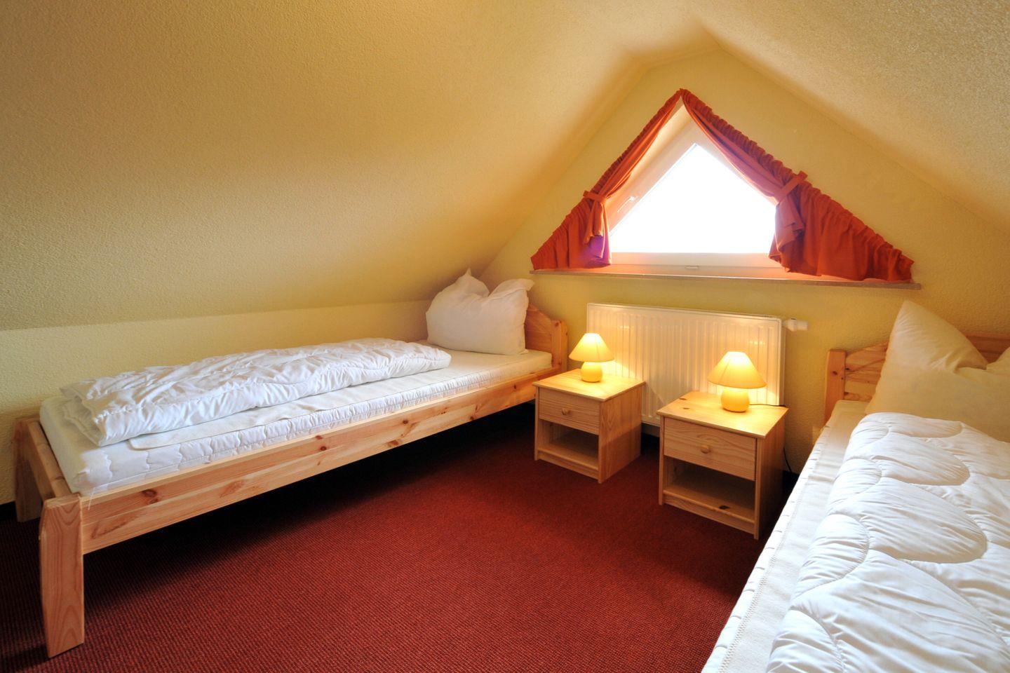 Das Dachgeschoss bietet ein weiteres Schlafzimmer mit zwei Einzelbetten – ideal für Familien mit mehreren Kindern oder Gruppen.