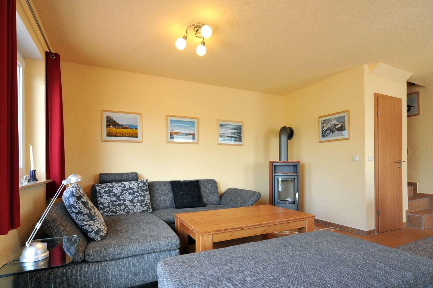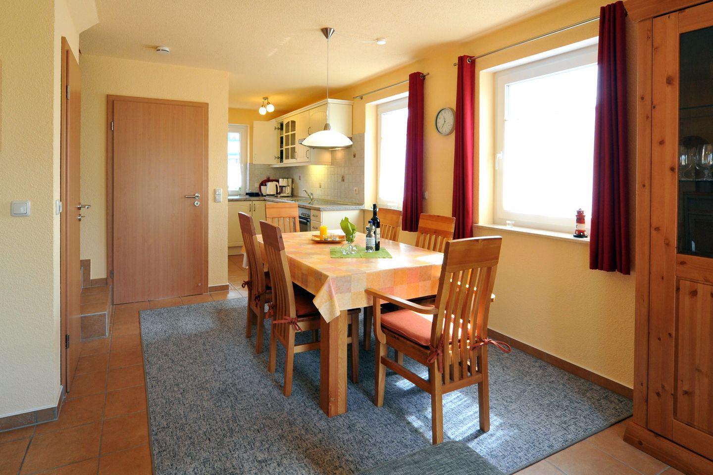 Die Haushälfte 8A erstreckt sich über drei Etagen und bietet auf großzügigen ca. 100 m² ausreichend Raum für bis zu 6 Personen. Das Erdgeschoss empfängt Sie mit einem lichtdurchfluteten Wohn- und Essbereich, einer bequemen Polstersitzecke, Flachbild-TV und einem gemütlichen Kaminofen – ideal für entspannte Abende. Die voll ausgestattete Küchenzeile mit E-Herd, Geschirrspüler und allen wichtigen Utensilien lässt keine Wünsche offen. Ein separates Gäste-WC sowie ein Hauswirtschaftsraum mit Waschmaschine ergänzen die Ausstattung im Erdgeschoss.
