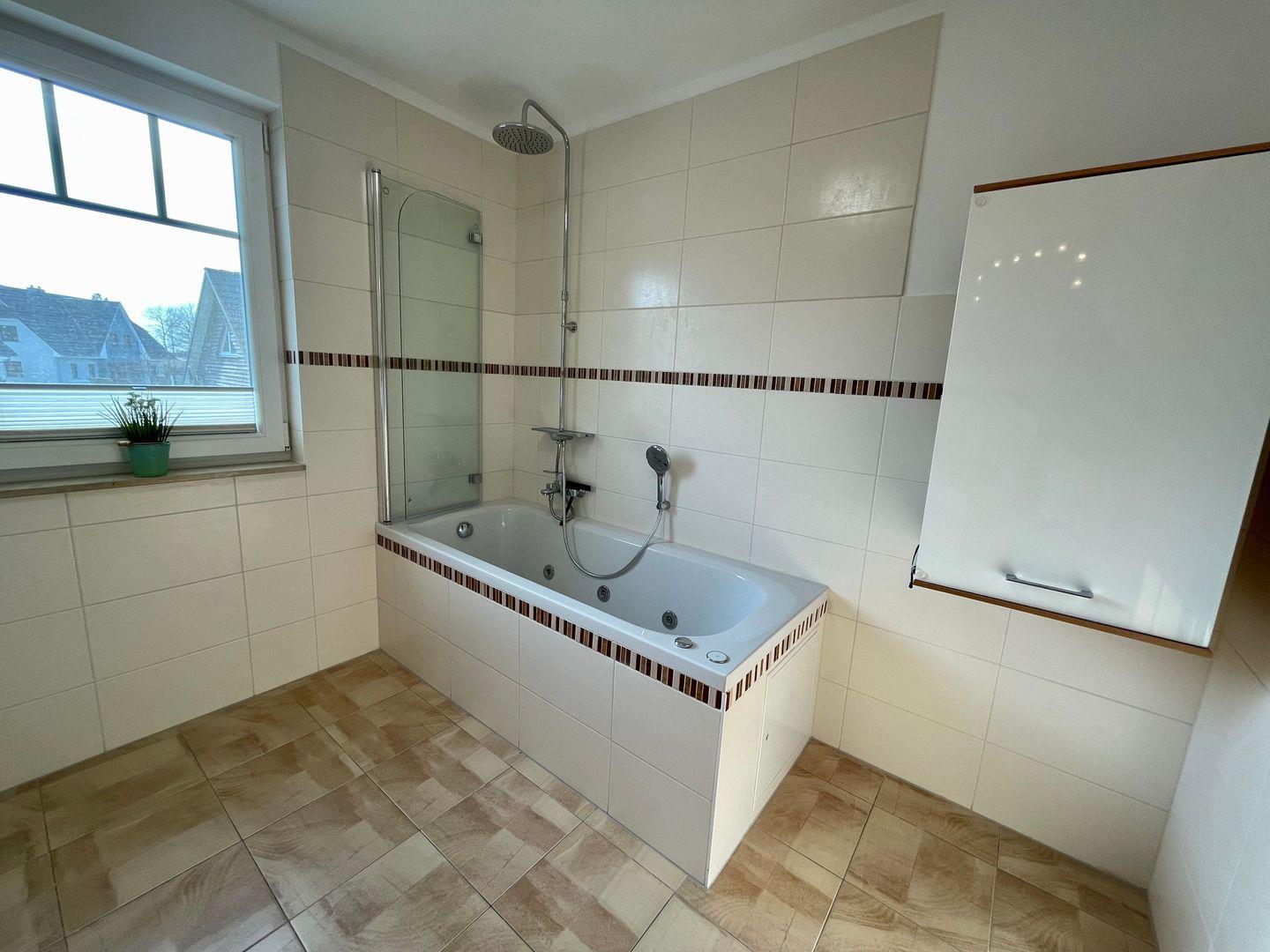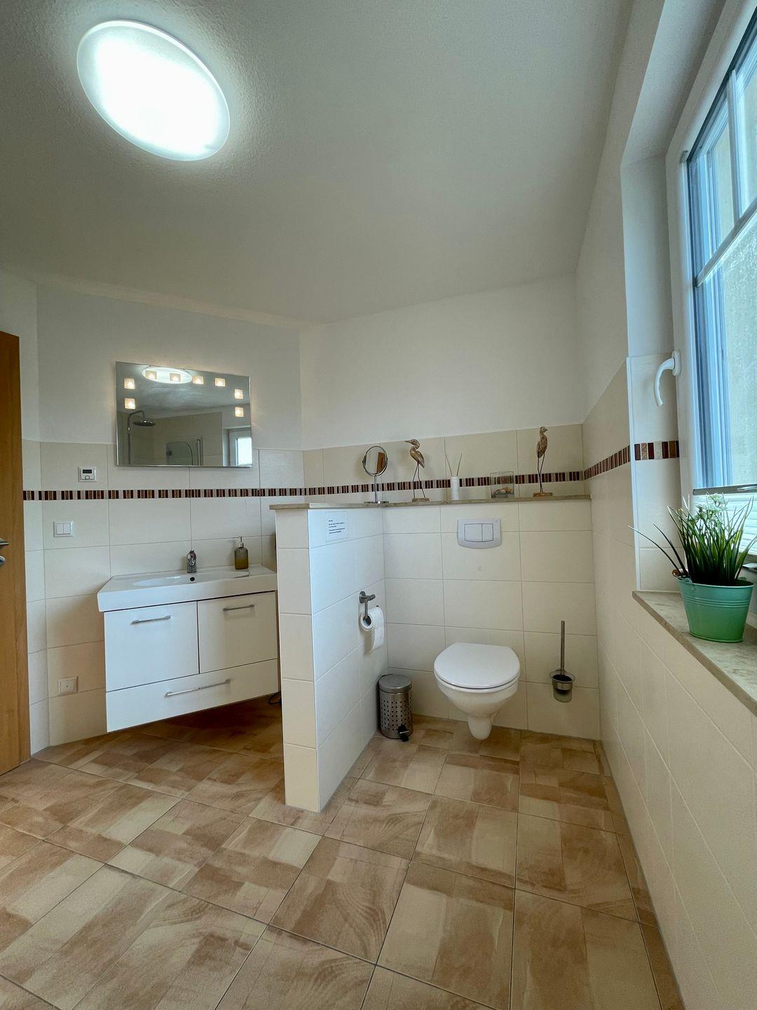 Das Haus verfügt über ein modernes Badezimmer mit bodengleicher Dusche sowie ein weiteres Bad mit Badewanne und Tageslicht. Haartrockner, Spiegel und Fenster gehören selbstverständlich zur Ausstattung. Sichtschutz an allen Fenstern sowie Fliegengitter sorgen für zusätzlichen Komfort und Privatsphäre.