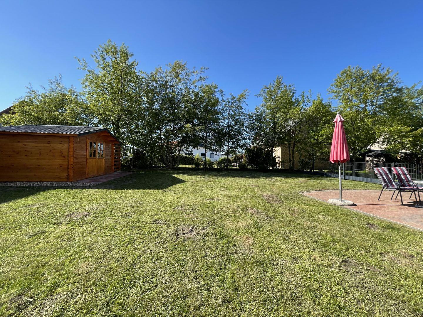 Der Außenbereich lädt zum Verweilen ein: Auf der möblierten und sonnengeschützten Terrasse mit Sonnenschirm genießen Sie entspannte Stunden. Ein klassischer Kohlegrill steht für gesellige Barbecue-Abende bereit. Gartenmöbel sind ebenso vorhanden, sodass auch der Garten mit Kindern oder Hunden genutzt werden kann.