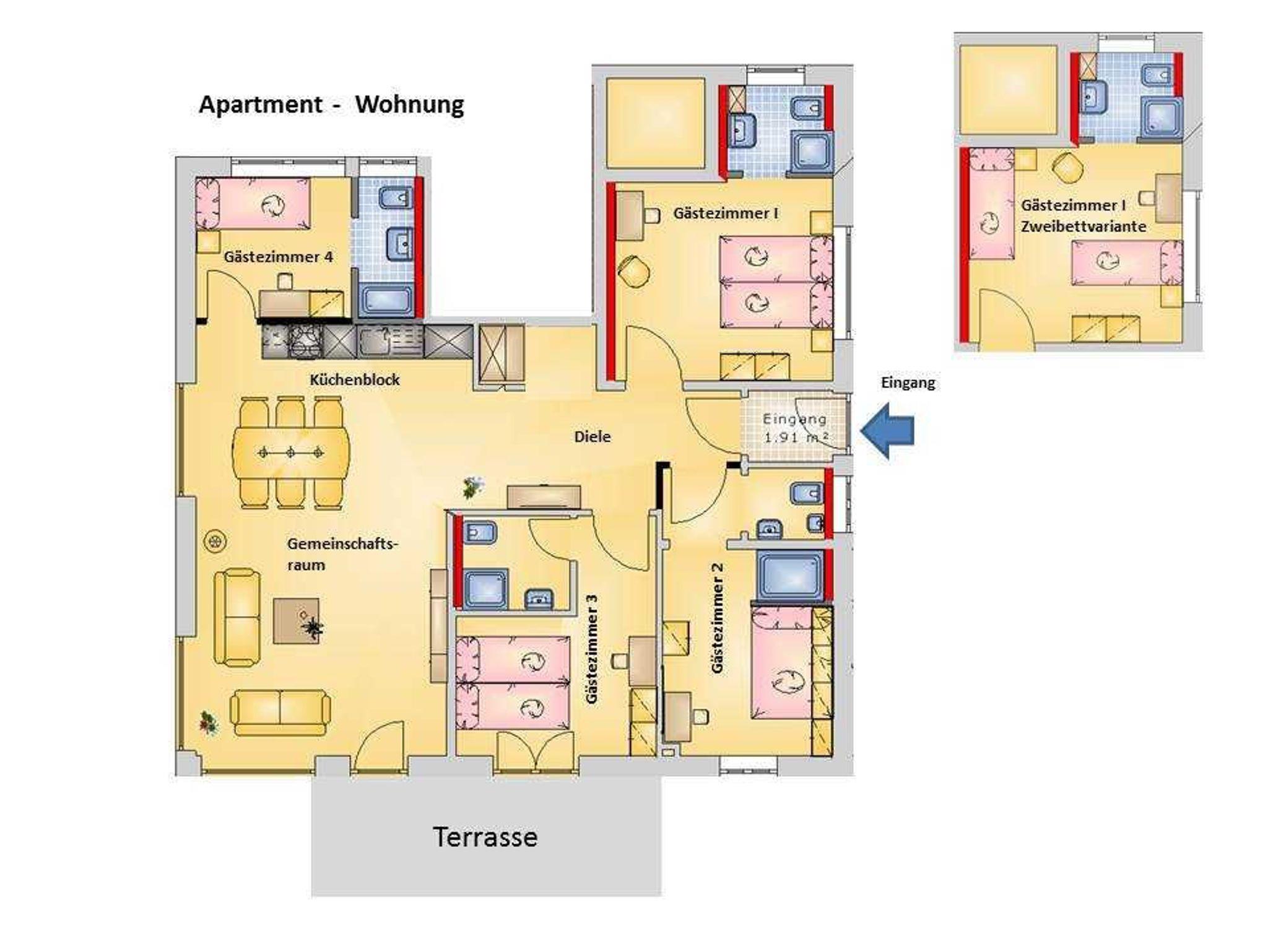 Die Wohnung besteht aus 4 Ambiente-Zimmern jeweils mit Dusche/WC/Fön, davon 3
